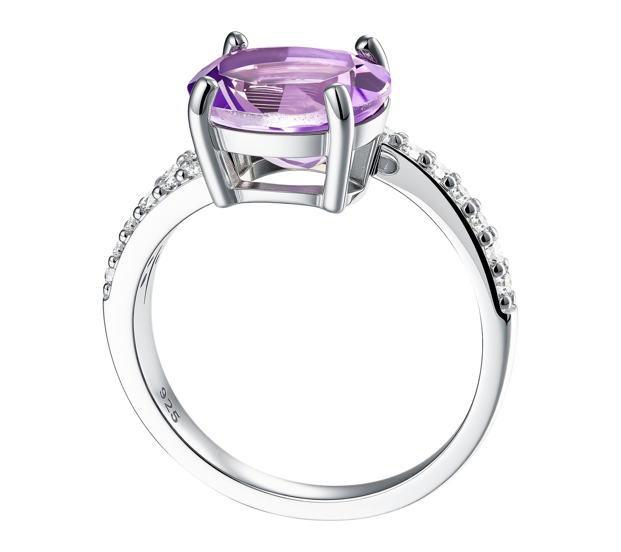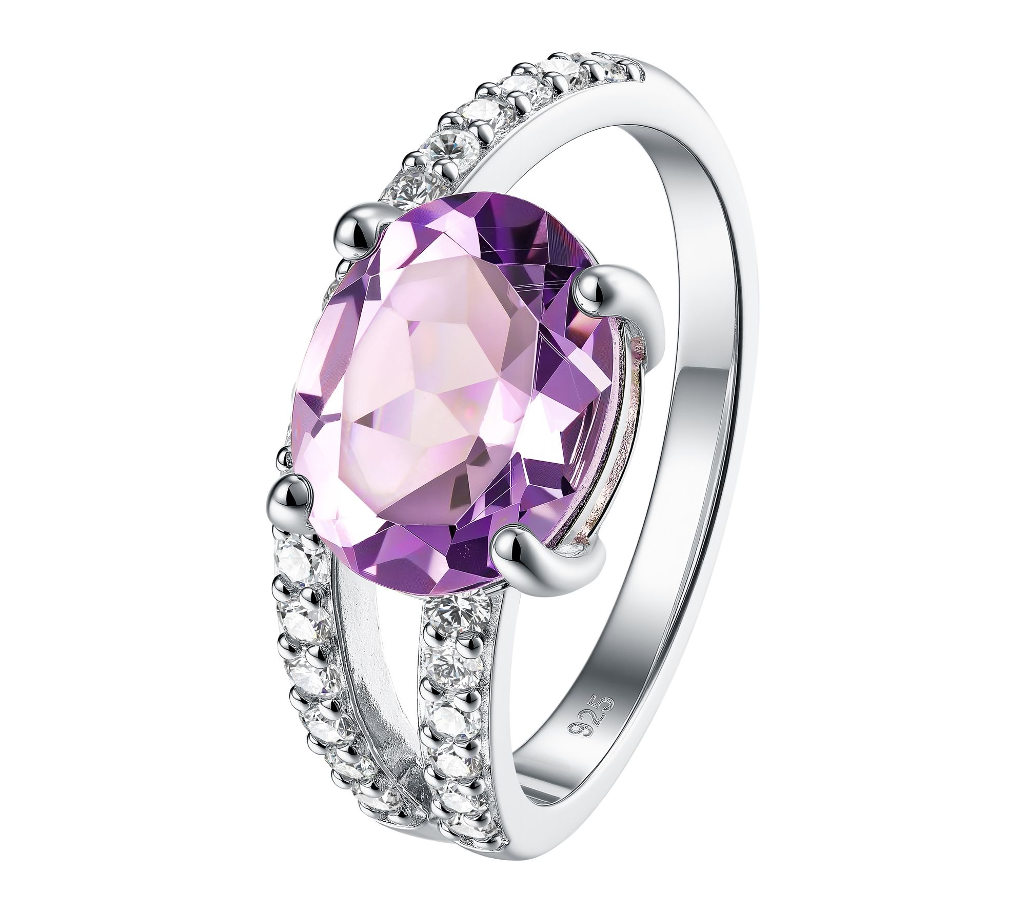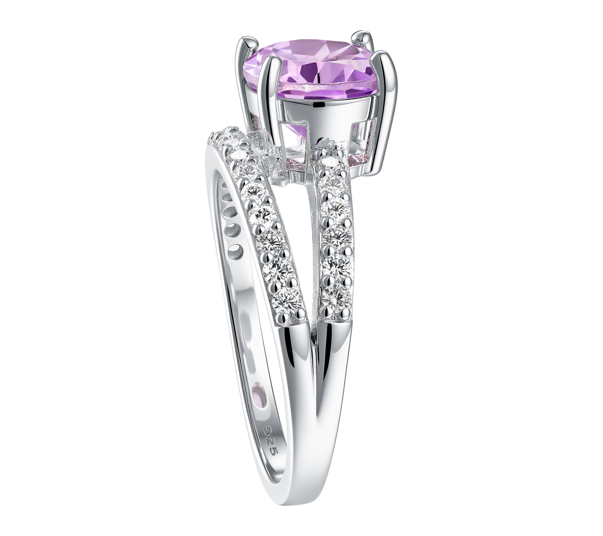 Prong-set, oval-cut amethyst center; pave-set white zircon accents; spiral design
