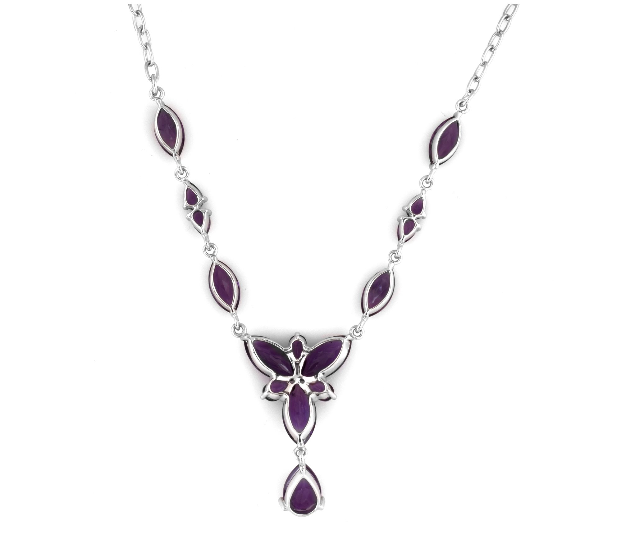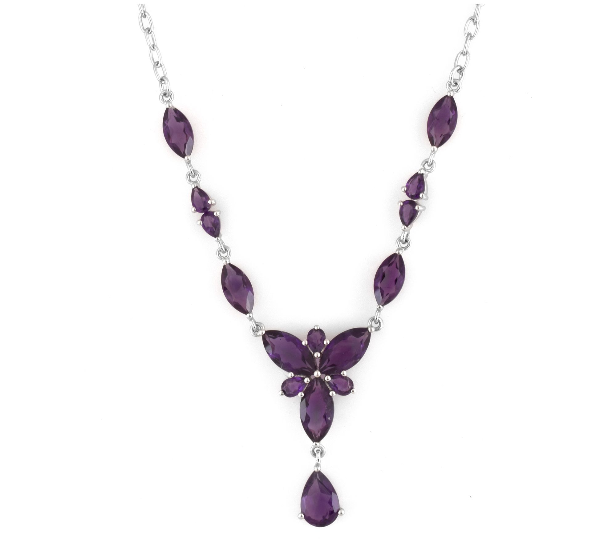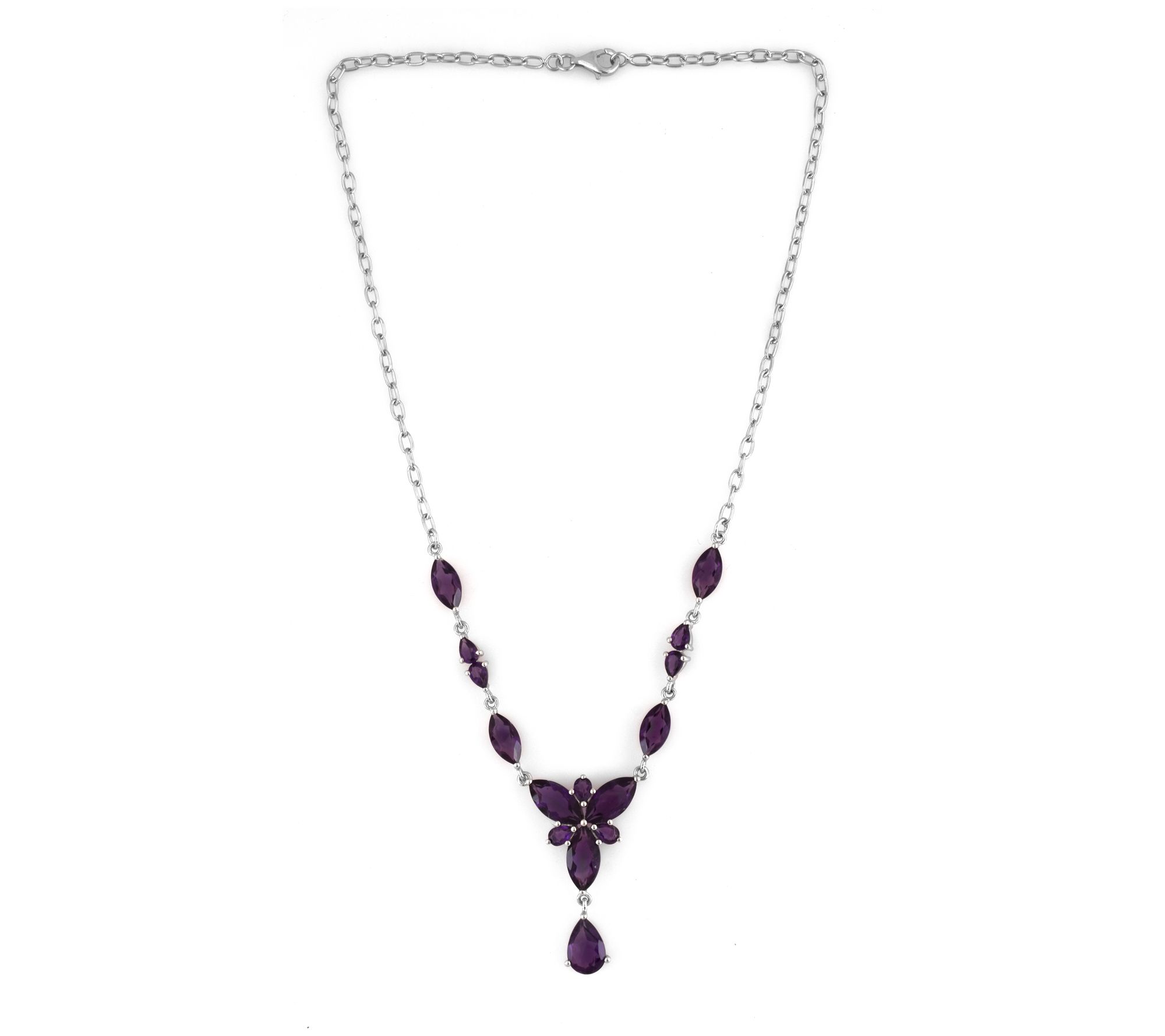 • Marquise and pear-cut prong-set amethyst gems; high polish; oval link chain