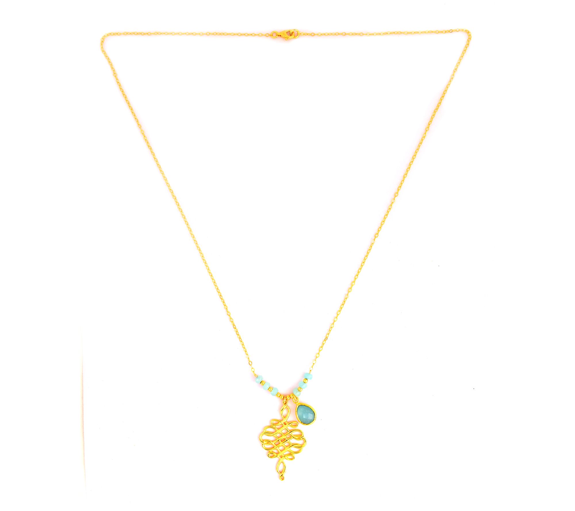 Oval-link chain with aqua quartz beads and checkerboard-cut aqua quartz charm; freeform pendant