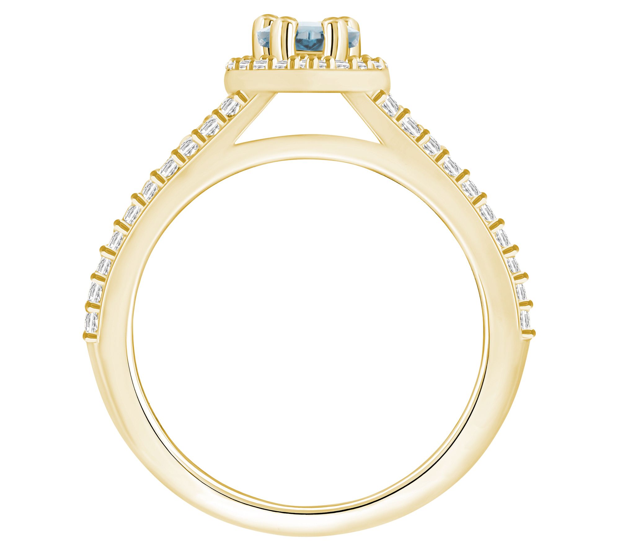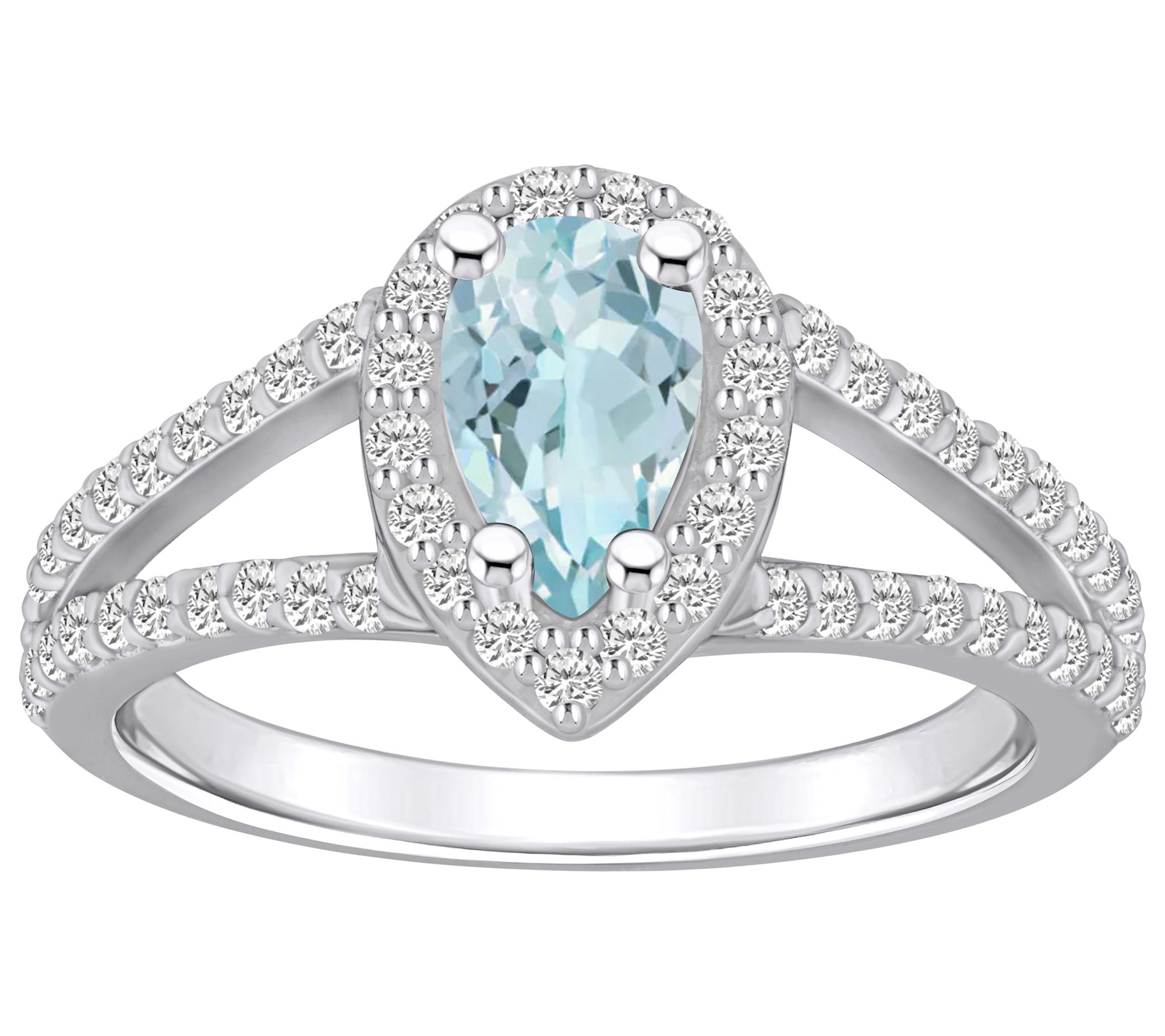 • Pear-cut, prong-set aquamarine gemstone with round-cut, prong-set diamond accents in halo and down the split shank