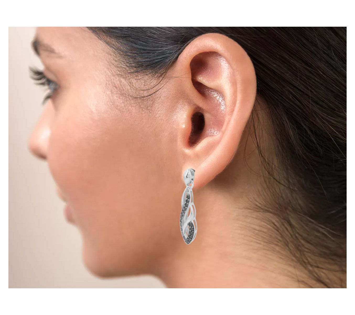 • Dangling design; round-cut, prong-set black spinel