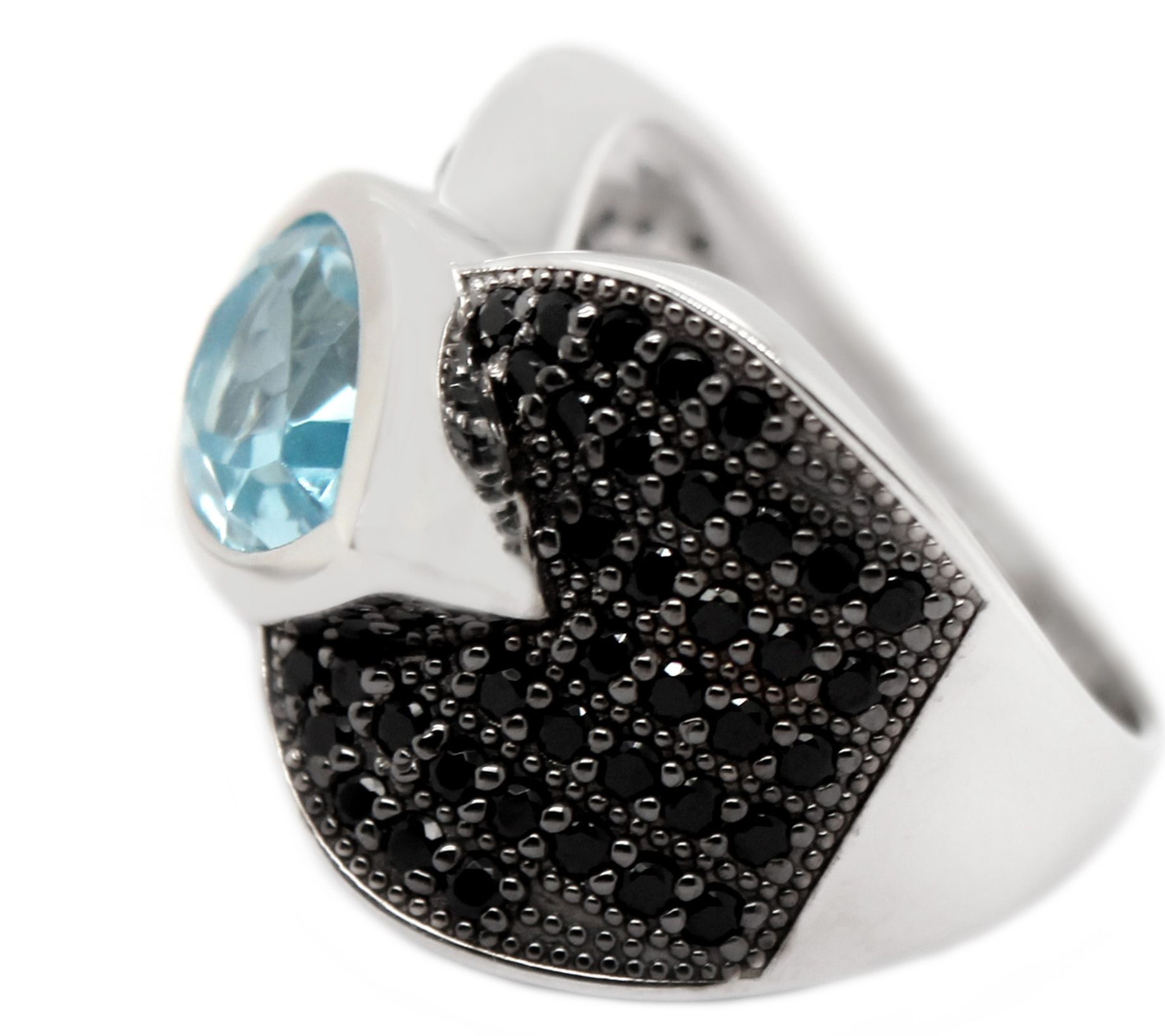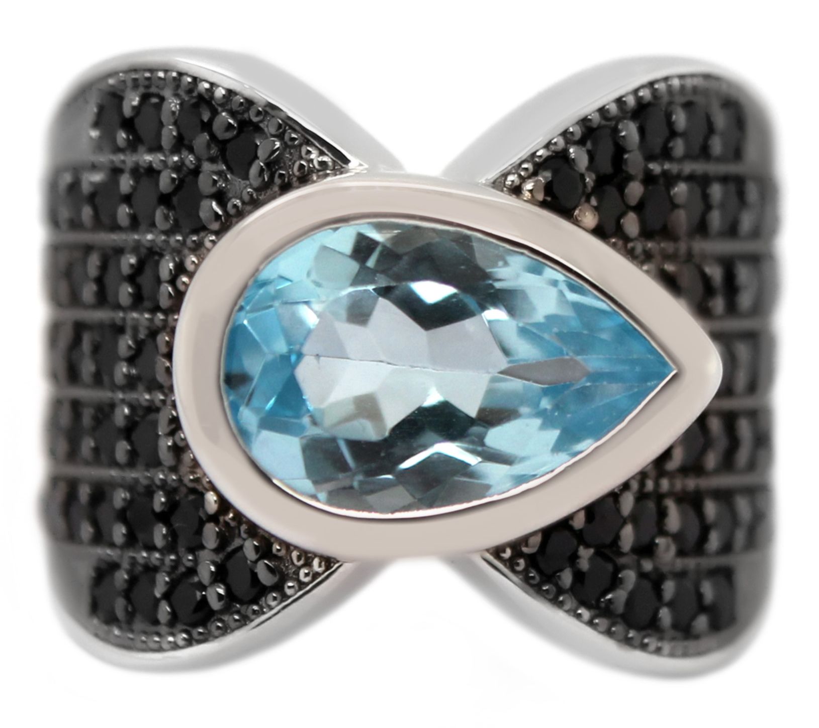 Pear-shaped, bezel-set sky blue topaz gemstone; round, prong-set black spinel