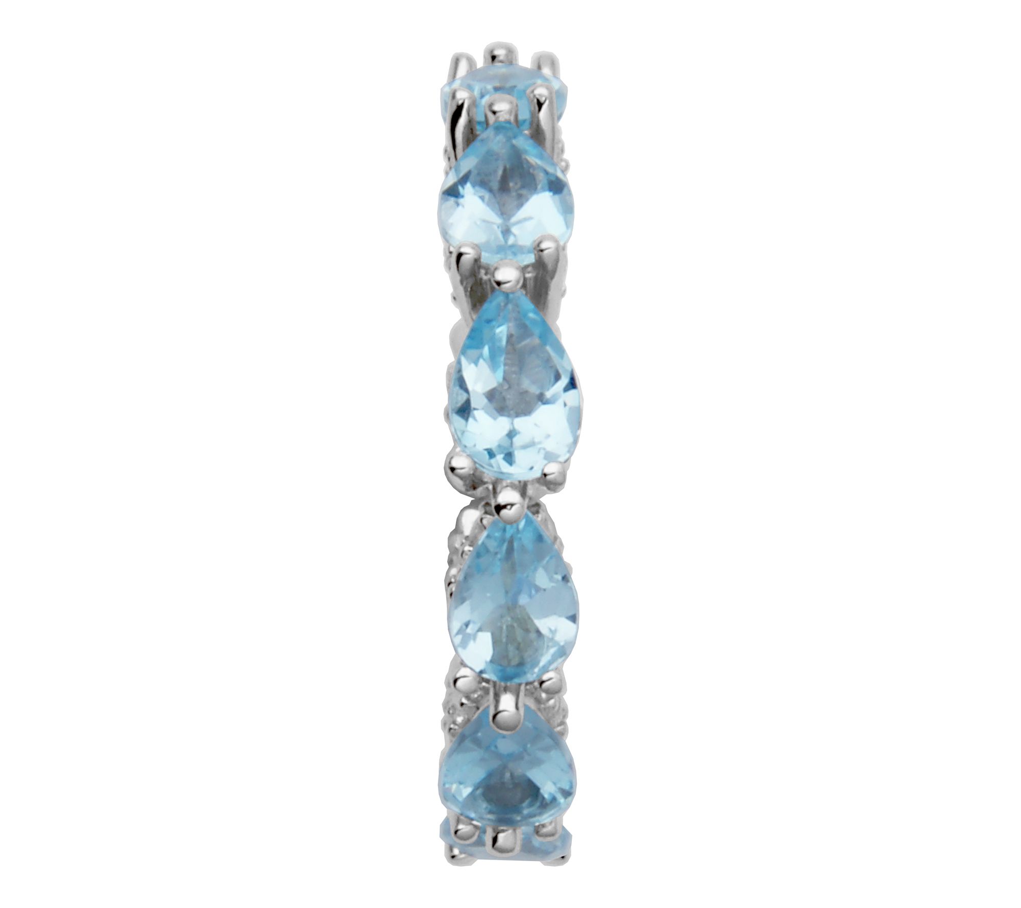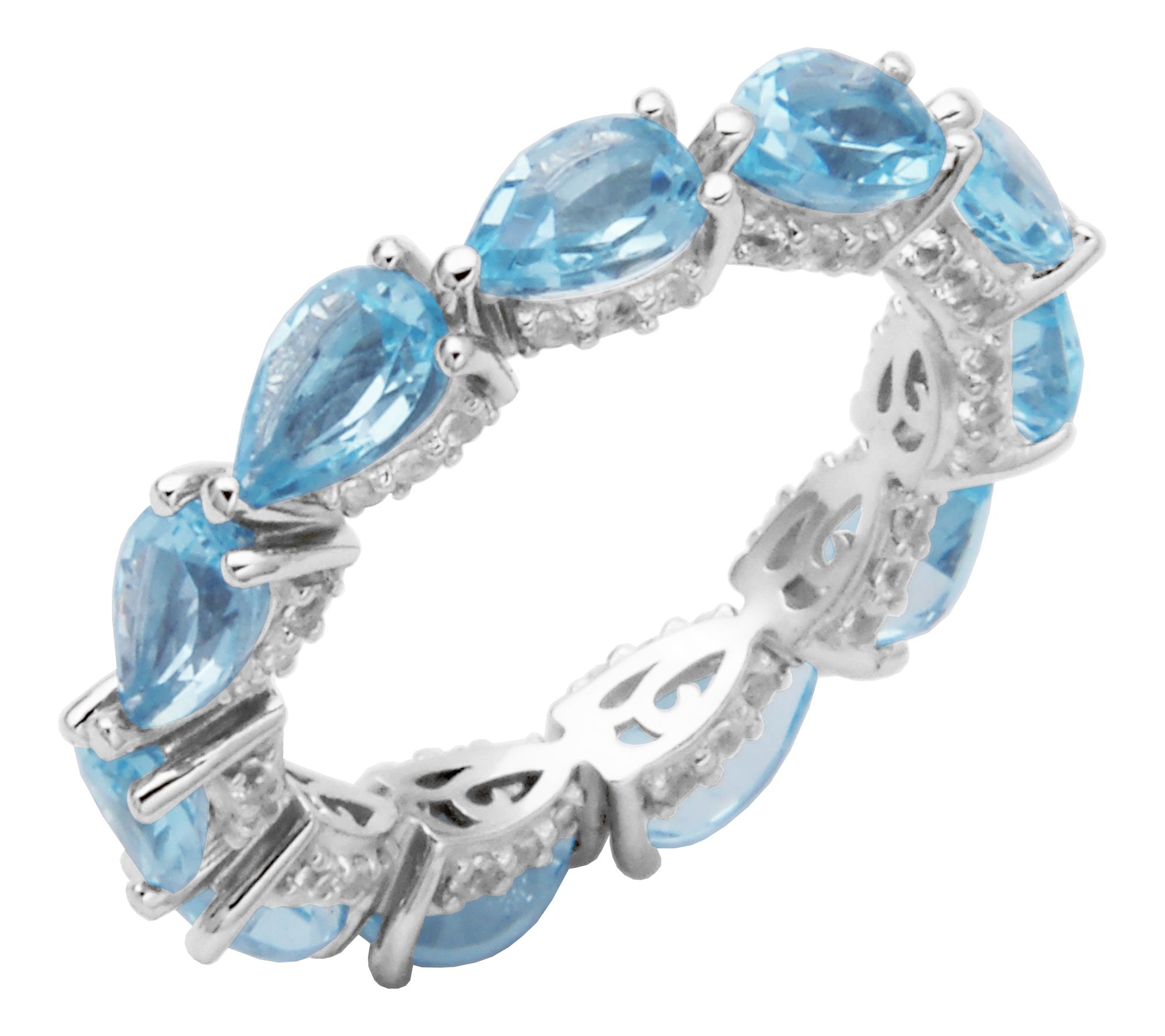 • Pear-shaped blue topaz; round prong-set lab-created white sapphires