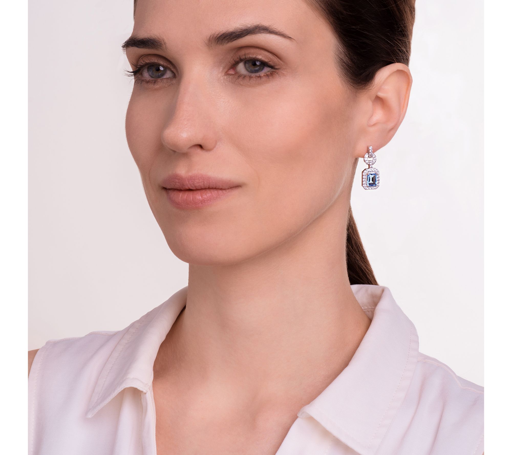 Emerald-cut blue topaz; round-cut created white sapphire; prong setting; door knocker design