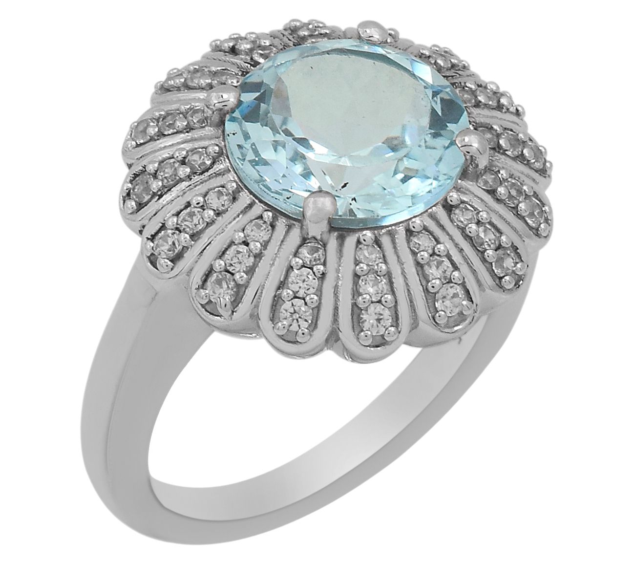 • Floral design; round-cut blue topaz and natural zircon; prong setting; platinum plating