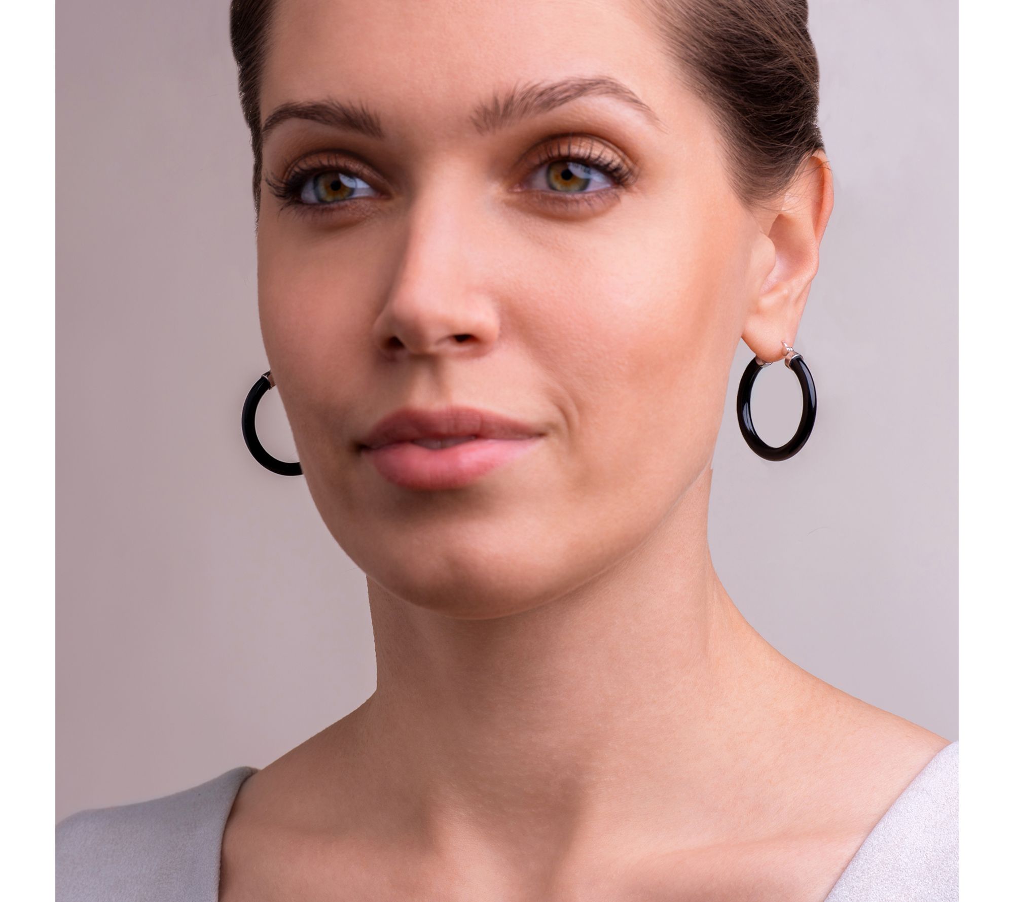 Take your style up a notch with these hoop earrings showcasing carved black agate. Their dramatic gemstone design adds a distinctive accent to your look, whether you're dressing up for an evening out or enhancing your everyday wardrobe. From Affinity® Gems.