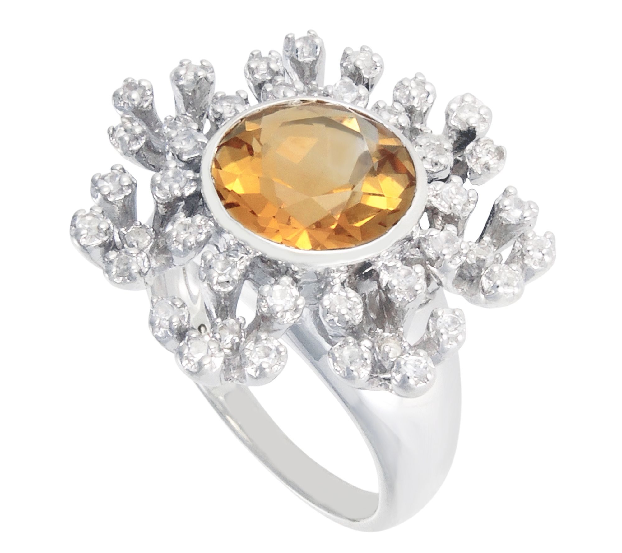 A luminous halo of golden citrine catches the eye, surrounded by a sparkling border of white topaz for an instant touch of glamour. This sterling silver ring adds a sophisticated pop of color whether you're dressing up for an evening out or adding flair to your everyday style. From Affinity® Gems.