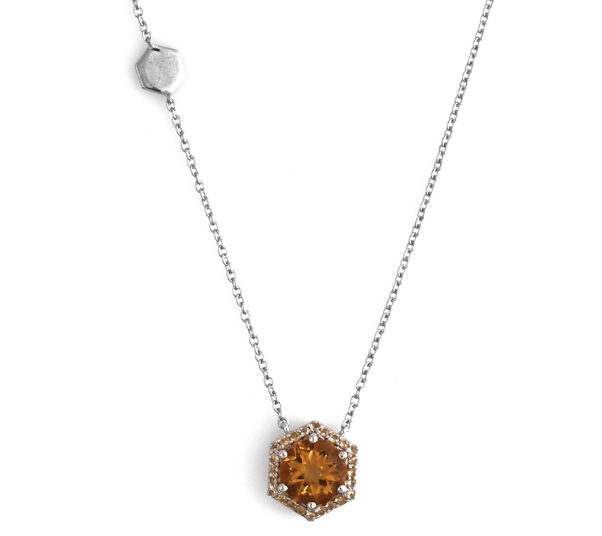 Hexagon pendant with round-cut, prong-set citrine; oval-link chain