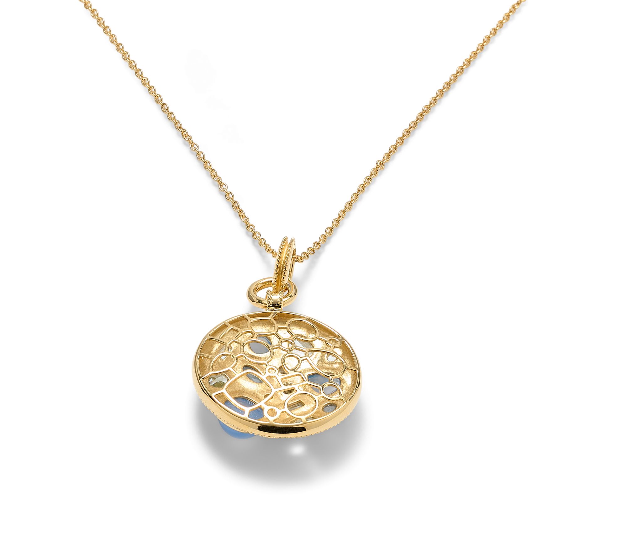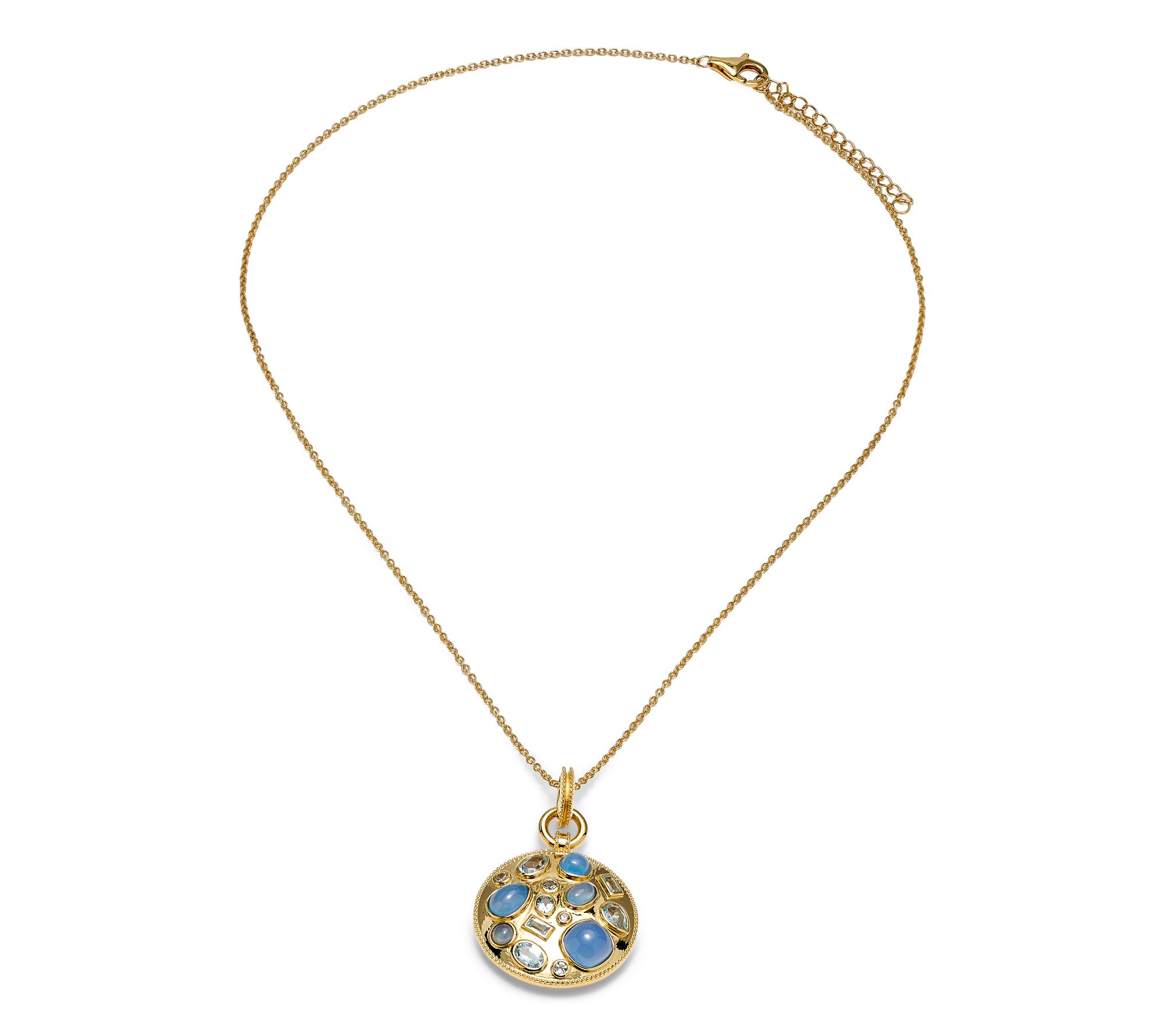 Dangling disc with cluster design; mixed shapes of bezel-set chalcedony cabochons, faceted sky blue topaz, and faceted white zircon; polished finish