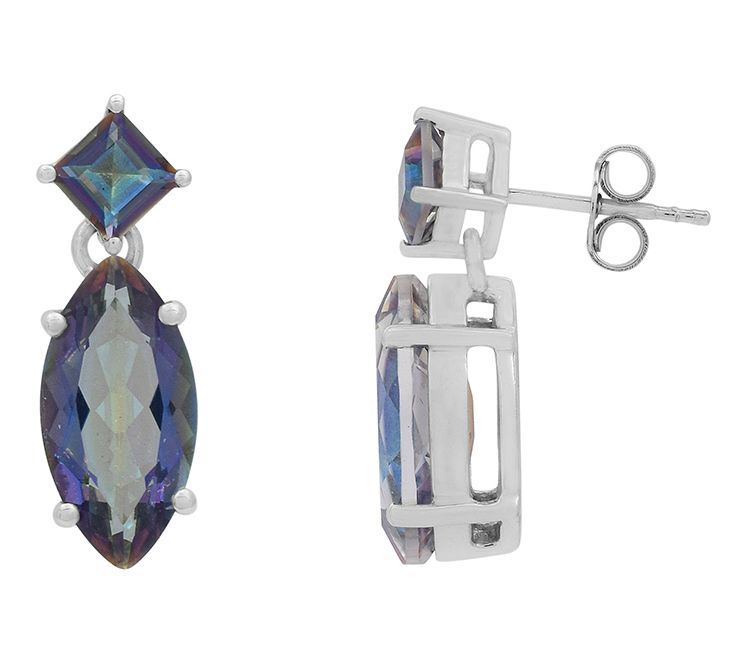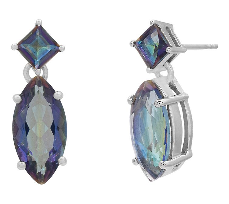 Dangle design; square- and marquise-cut blue and green coated quartz