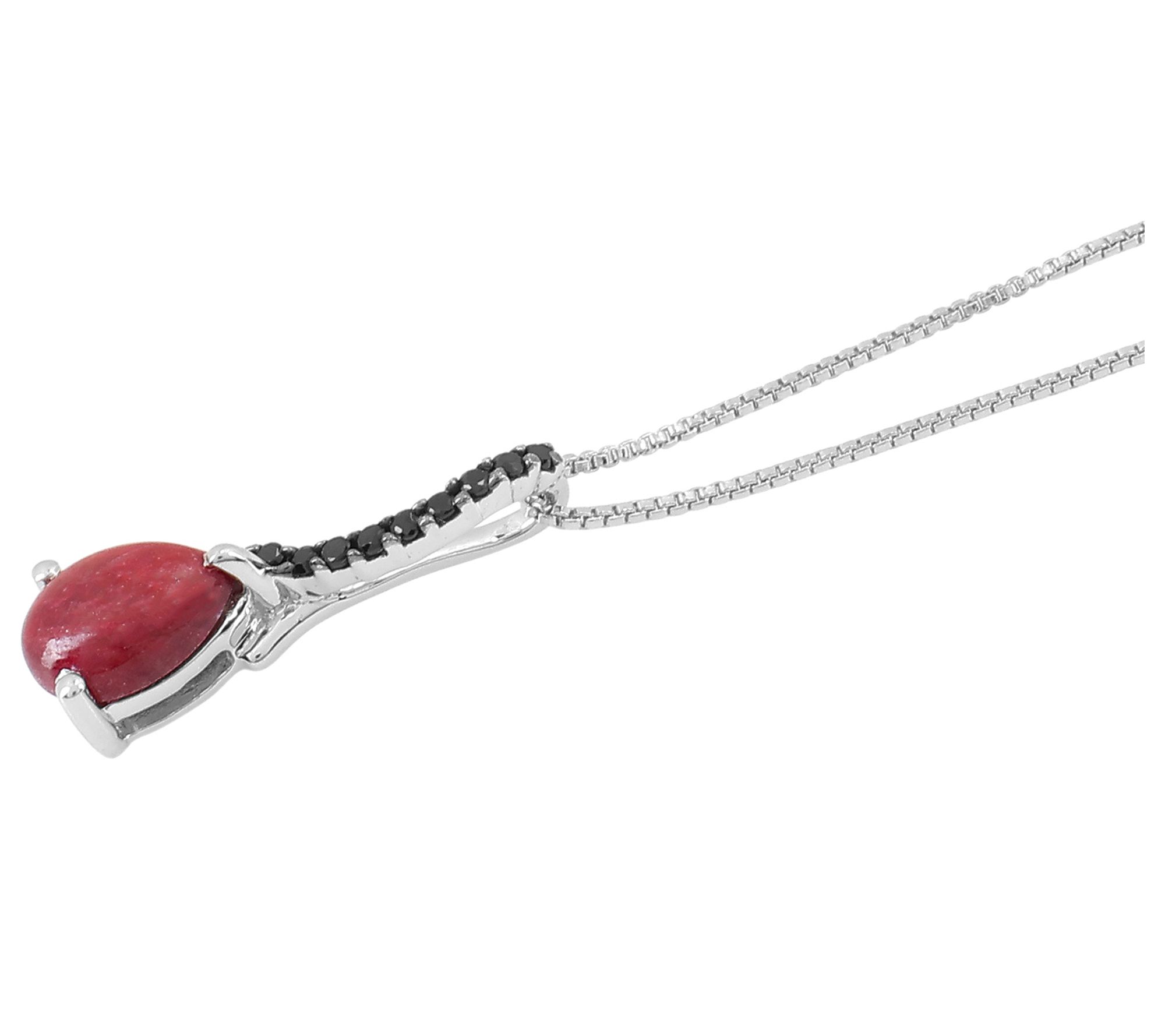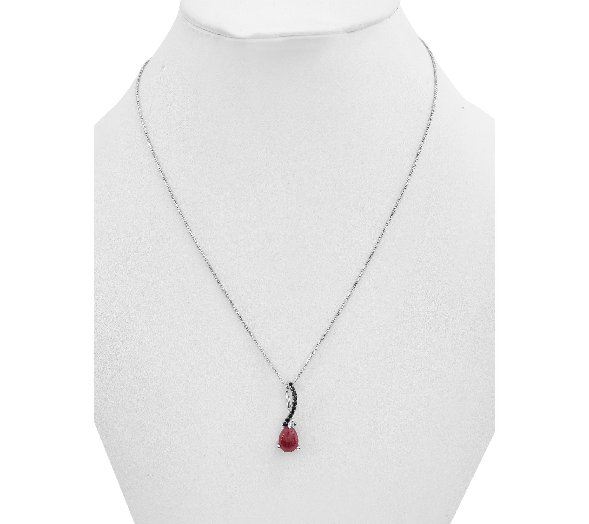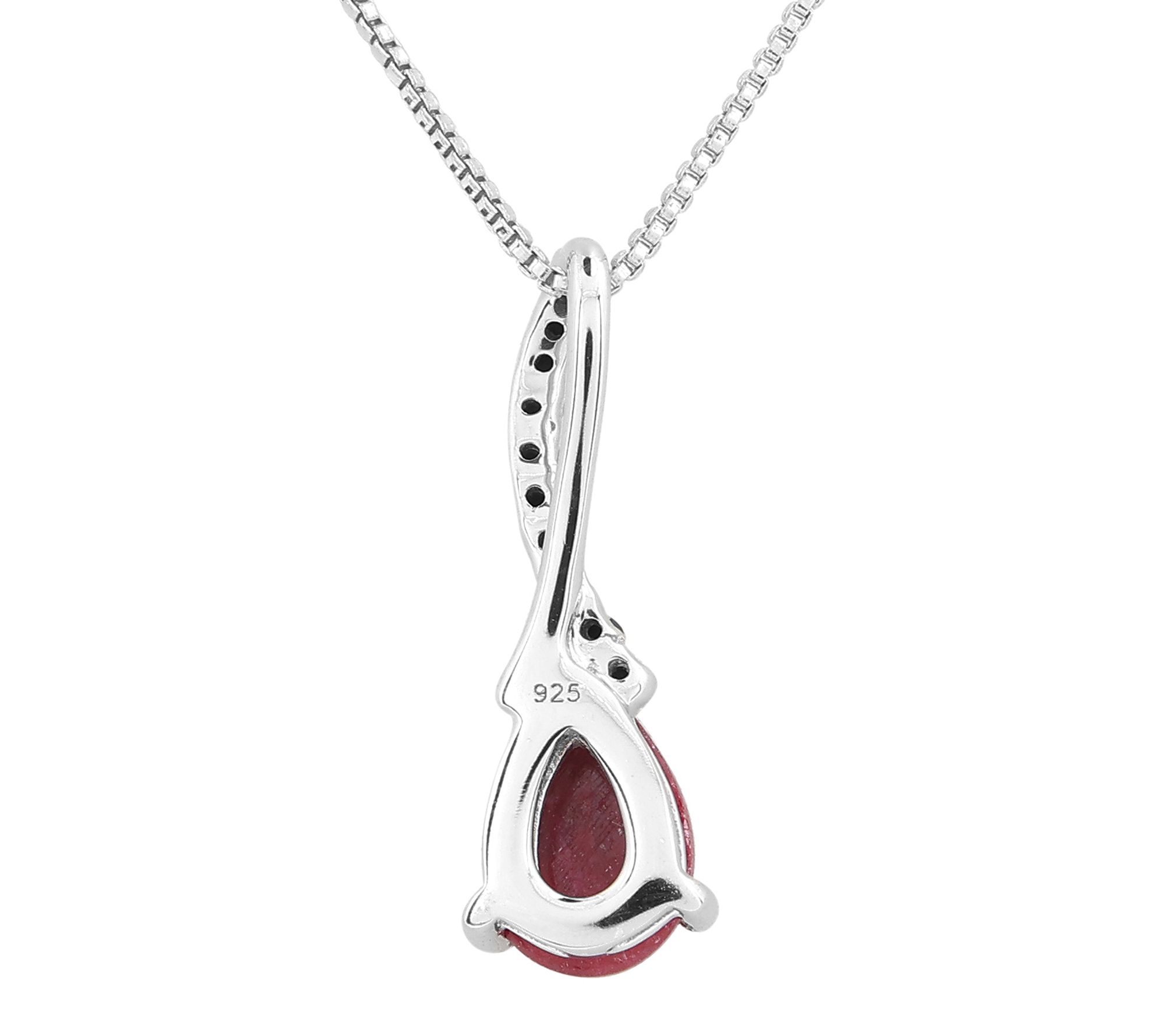 • Corundum ruby cabochon pears and round-cut black spinel; prong setting; slider pendant; box chain