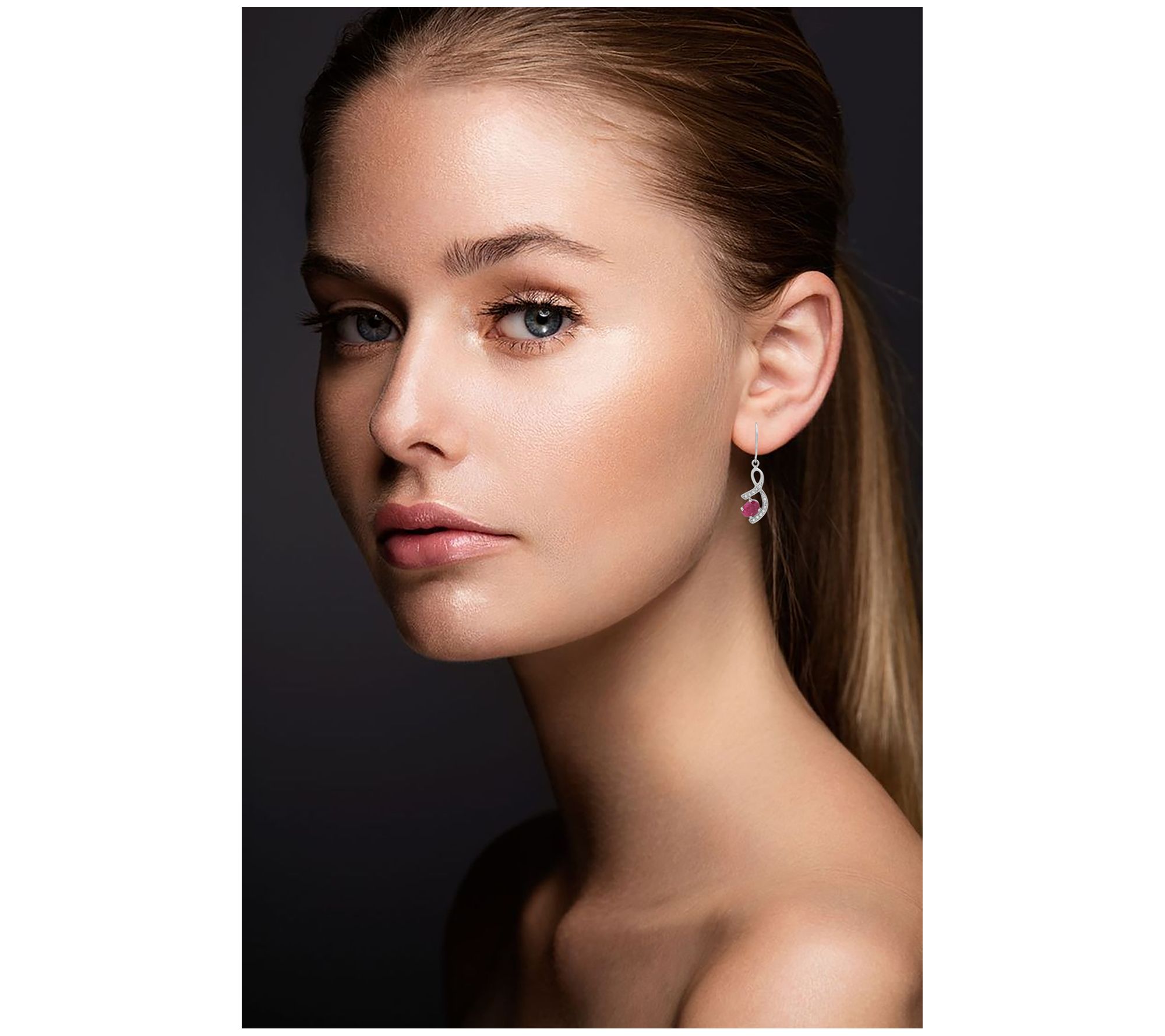 Dangle design; oval-cut corundum rubies; round-cut white topaz; prong setting