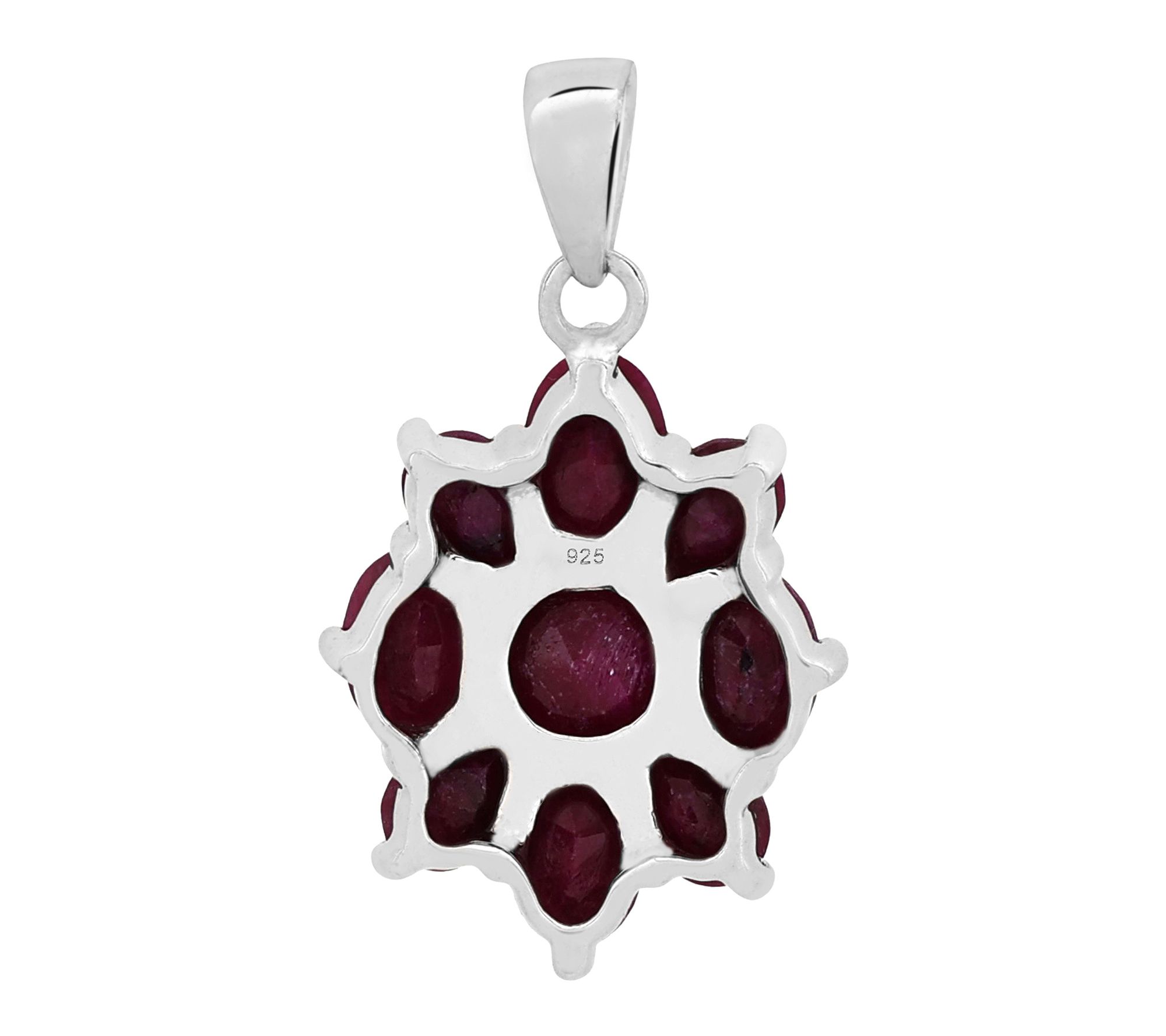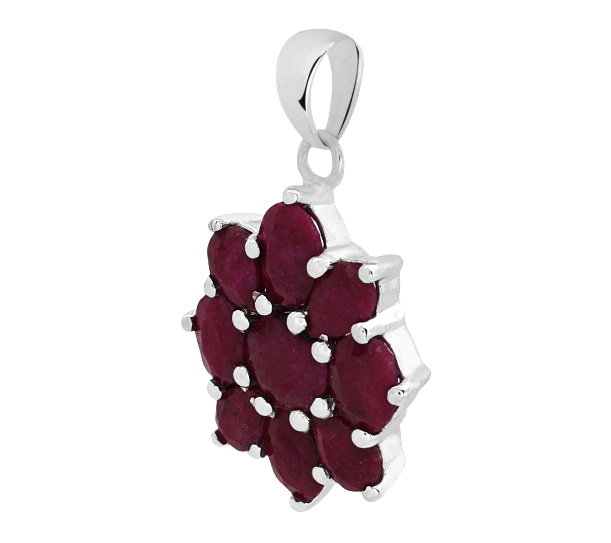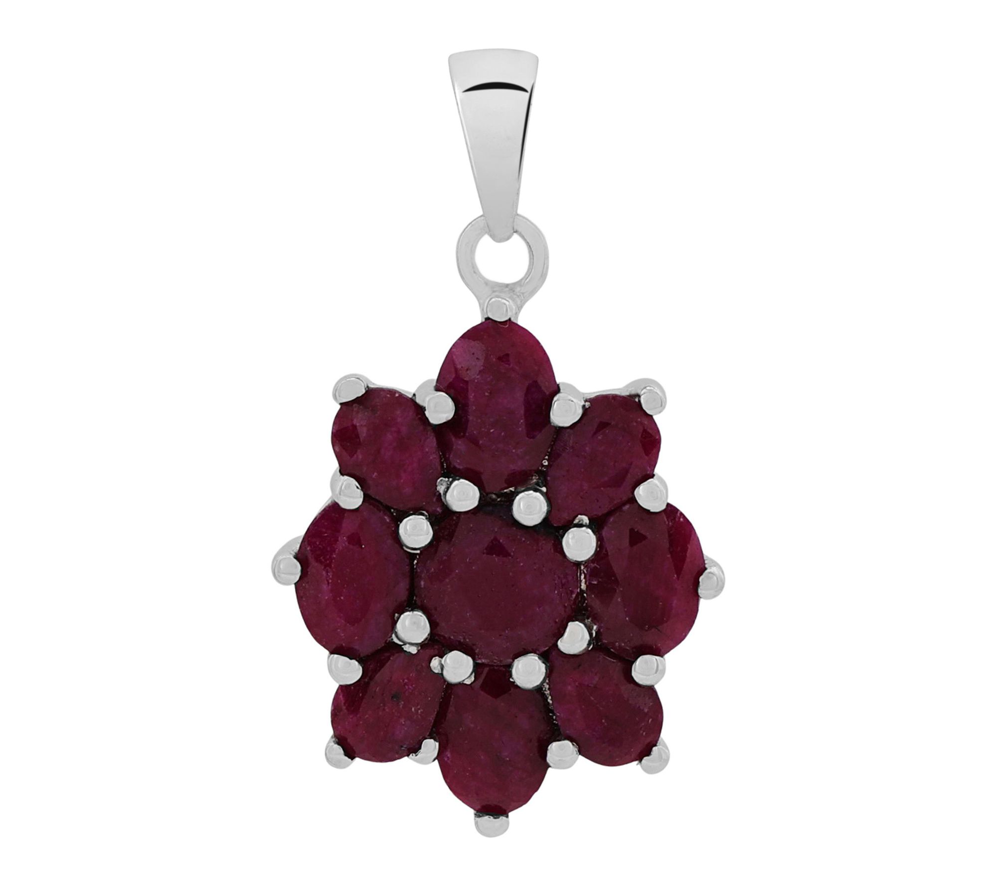 Add a touch of timeless elegance to your look with this stunning floral pendant. Crafted from sterling silver and finished with luxurious platinum plating, this exquisite piece features a captivating arrangement of genuine corundum rubies in pear, oval, and round cuts. Each gemstone is expertly set in secure prongs, forming a dazzling floral motif that catches the light beautifully. With a total gemstone weight of 6.50 carats, this imported pendant is a show-stopping accessory -- perfect for special occasions or adding a pop of rich color to your everyday style. From Affinity® Gems,