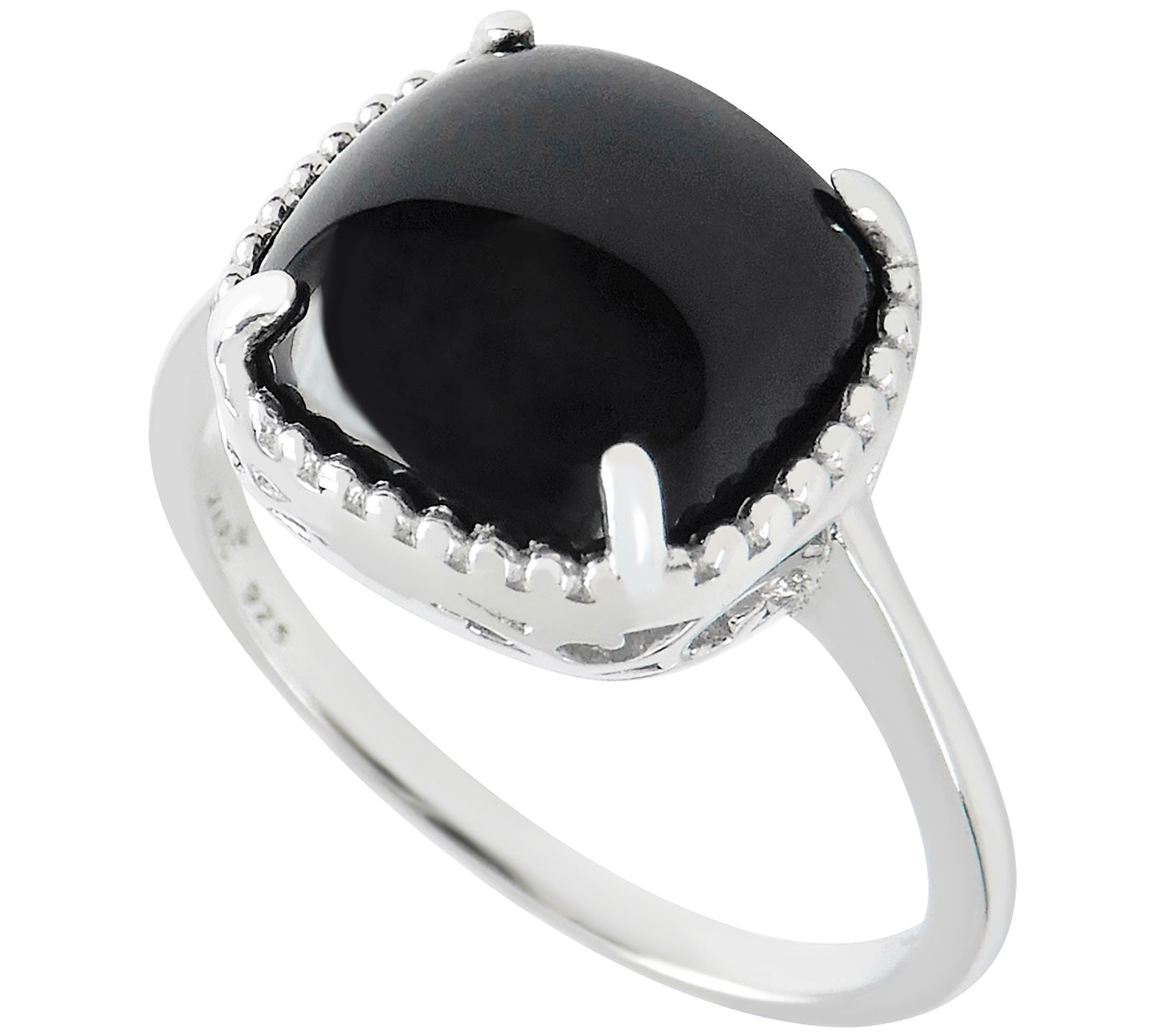 Solitaire ring with cushion-cut, prong-set black onyx center stone; high-polished finish