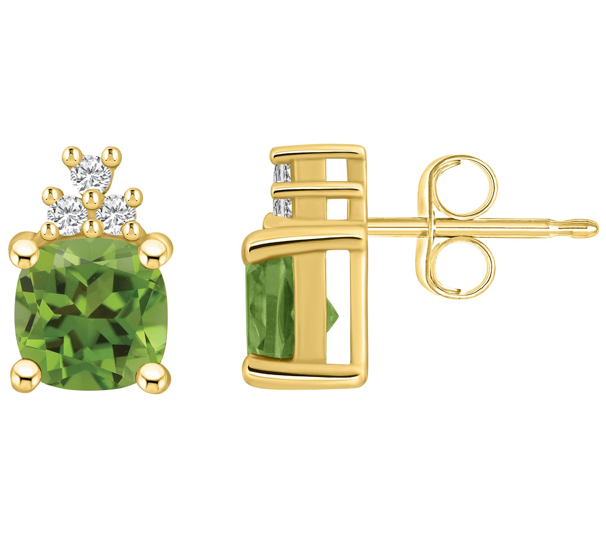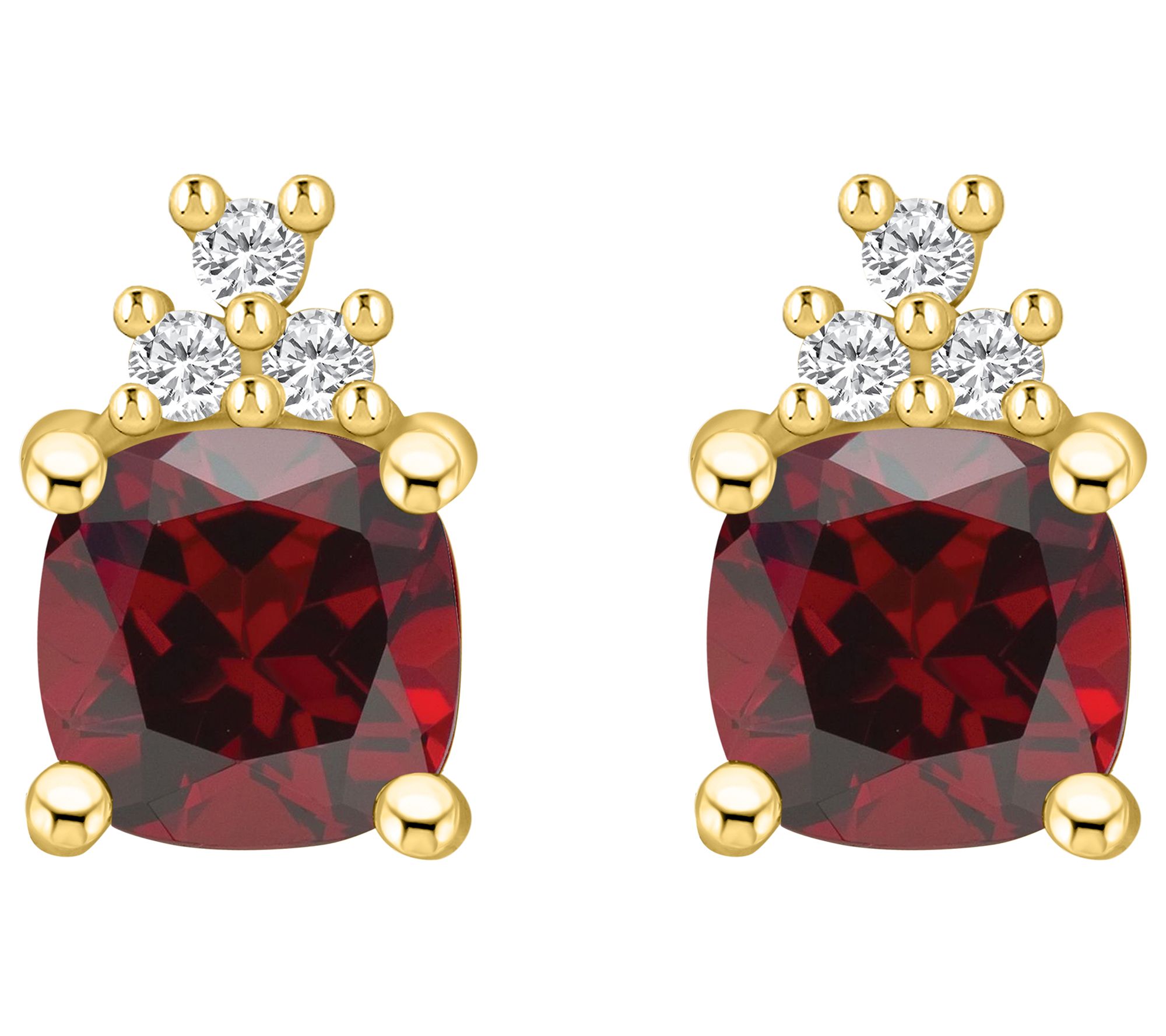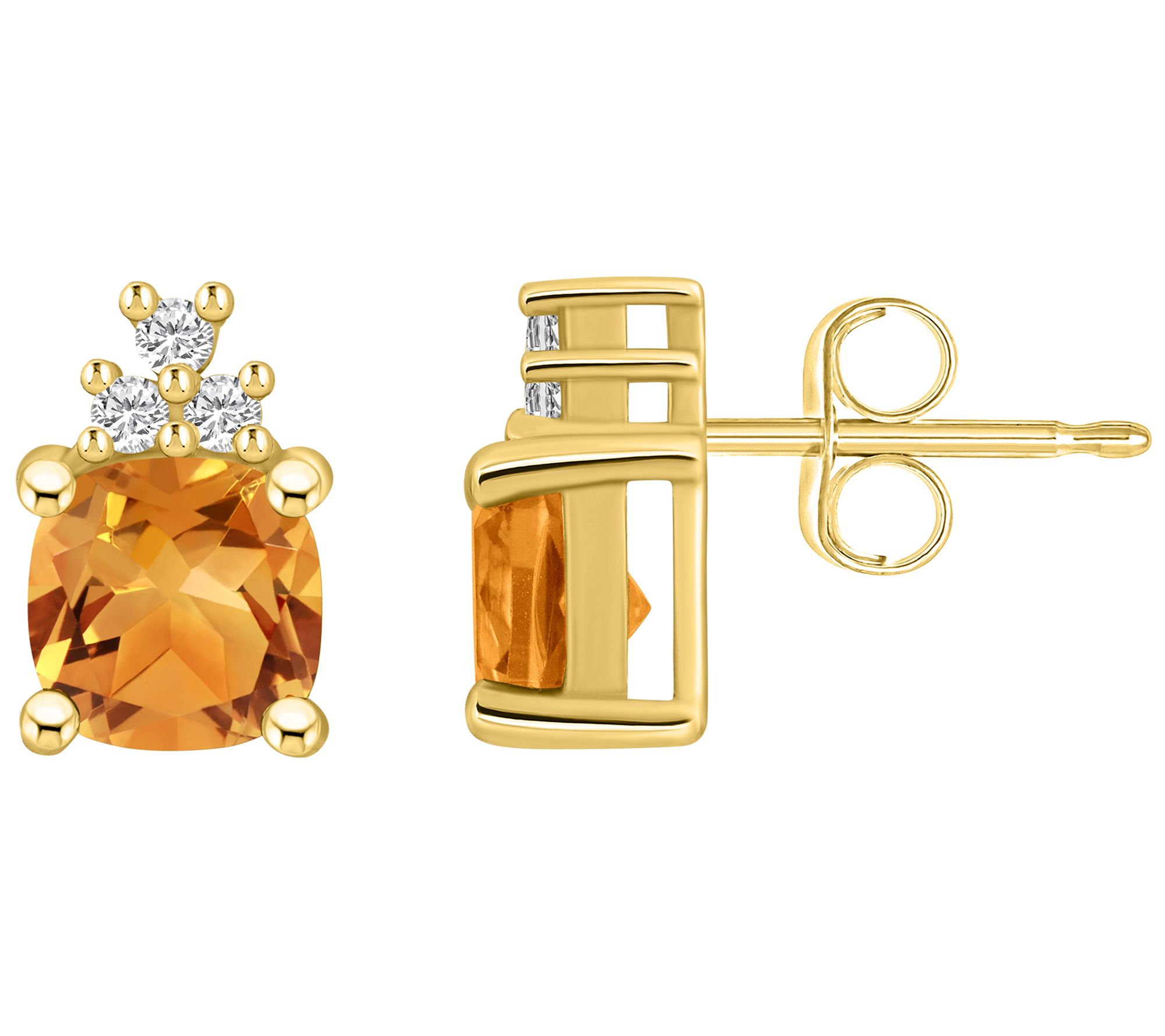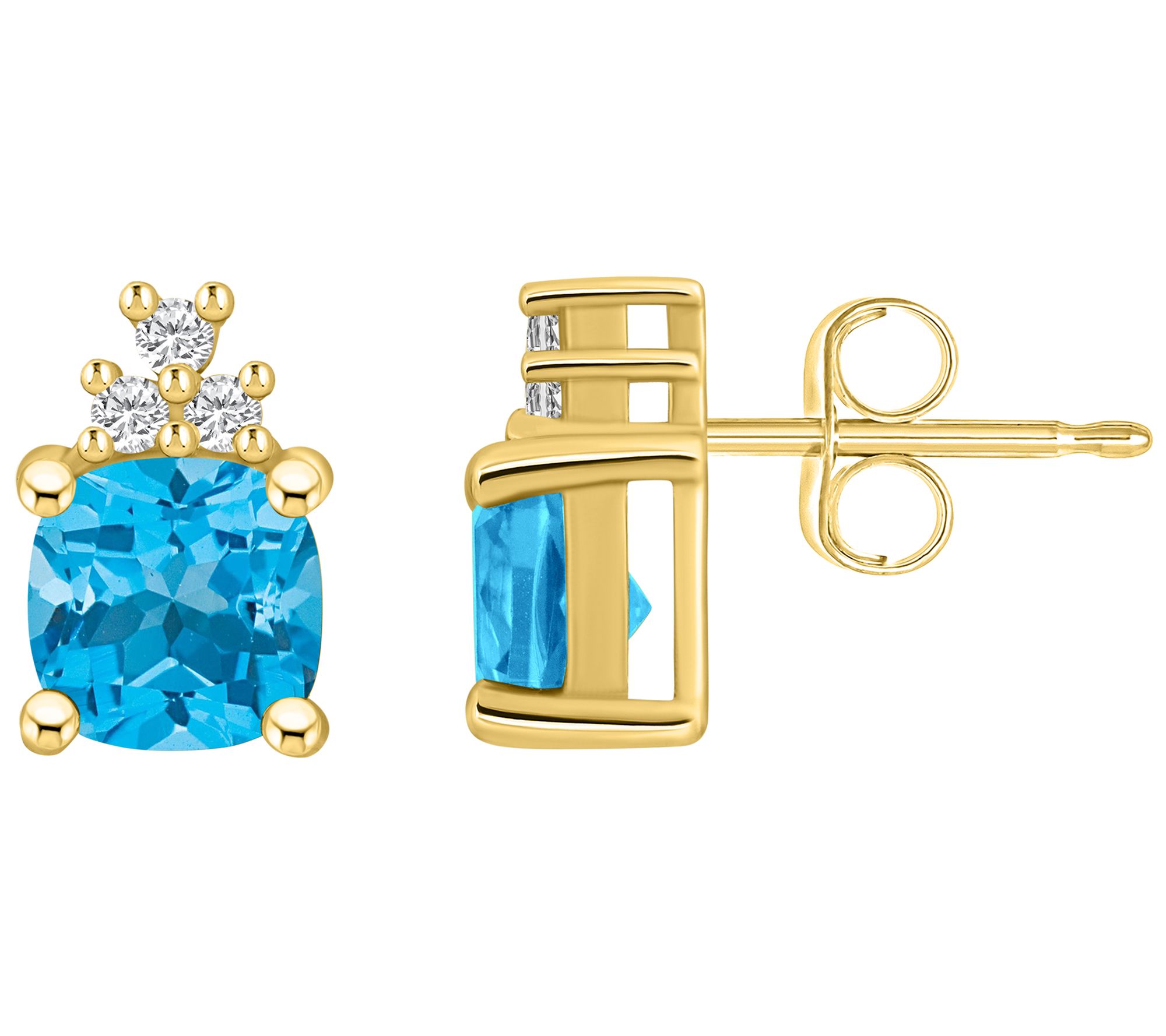 Add the crowning touch to your look with the regal beauty of these 14K gold earrings. Each one showcases a dazzling gemstone topped with a trio of diamonds. From Affinity Gems.