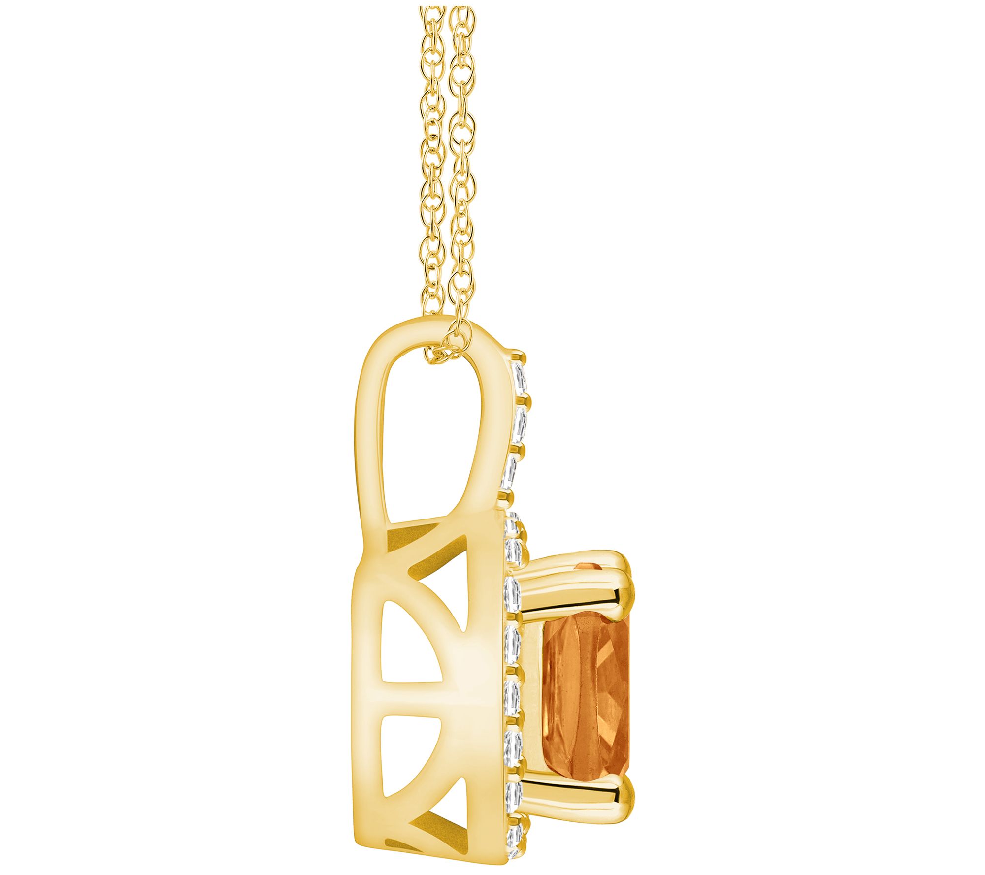 Cushion-cut, prong-set gemstone with prong-set, round-cut diamonds set in the bail; rope chain