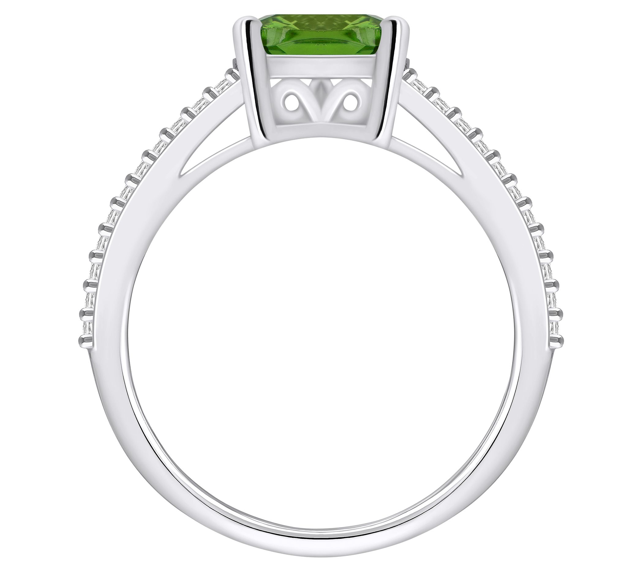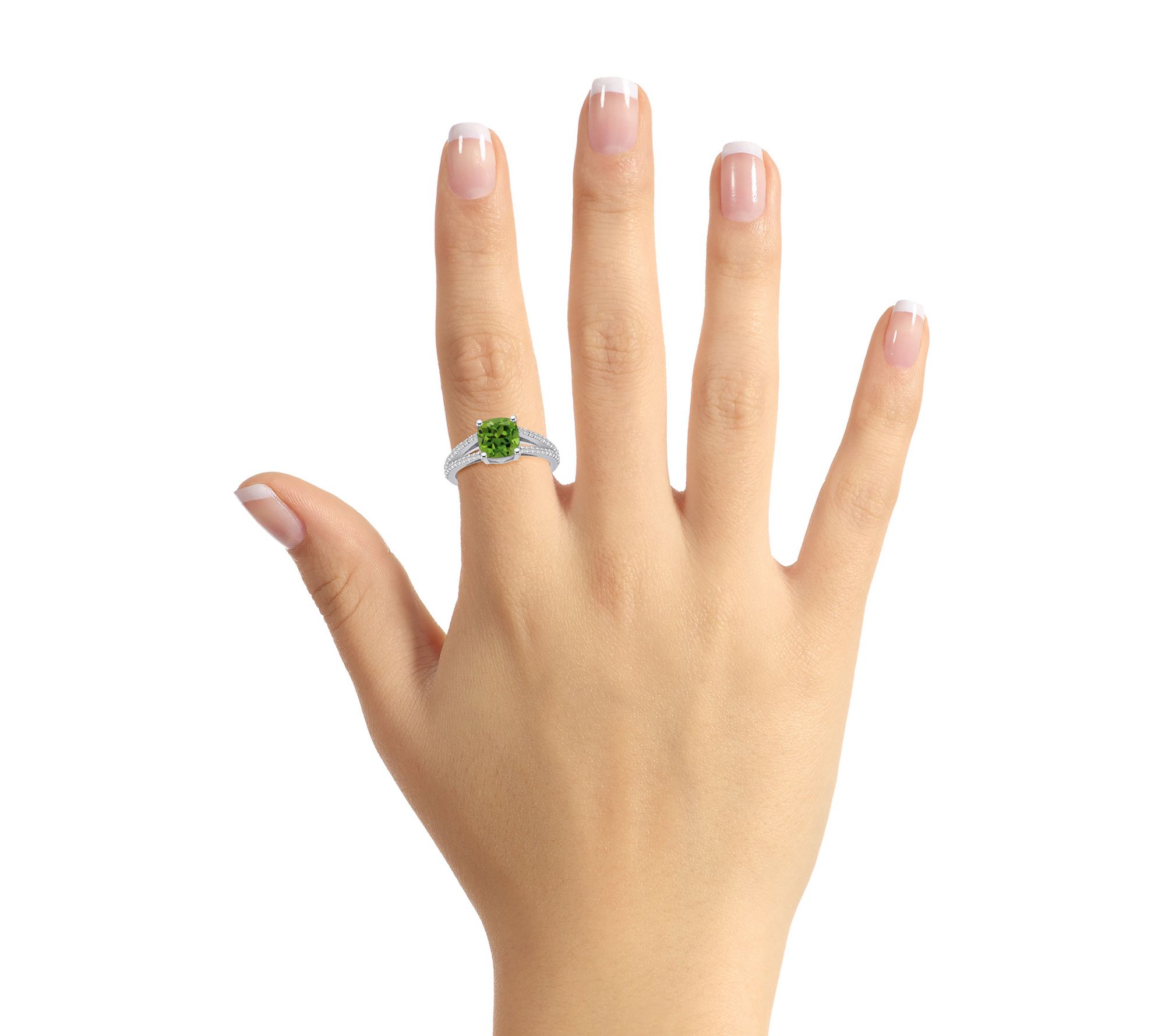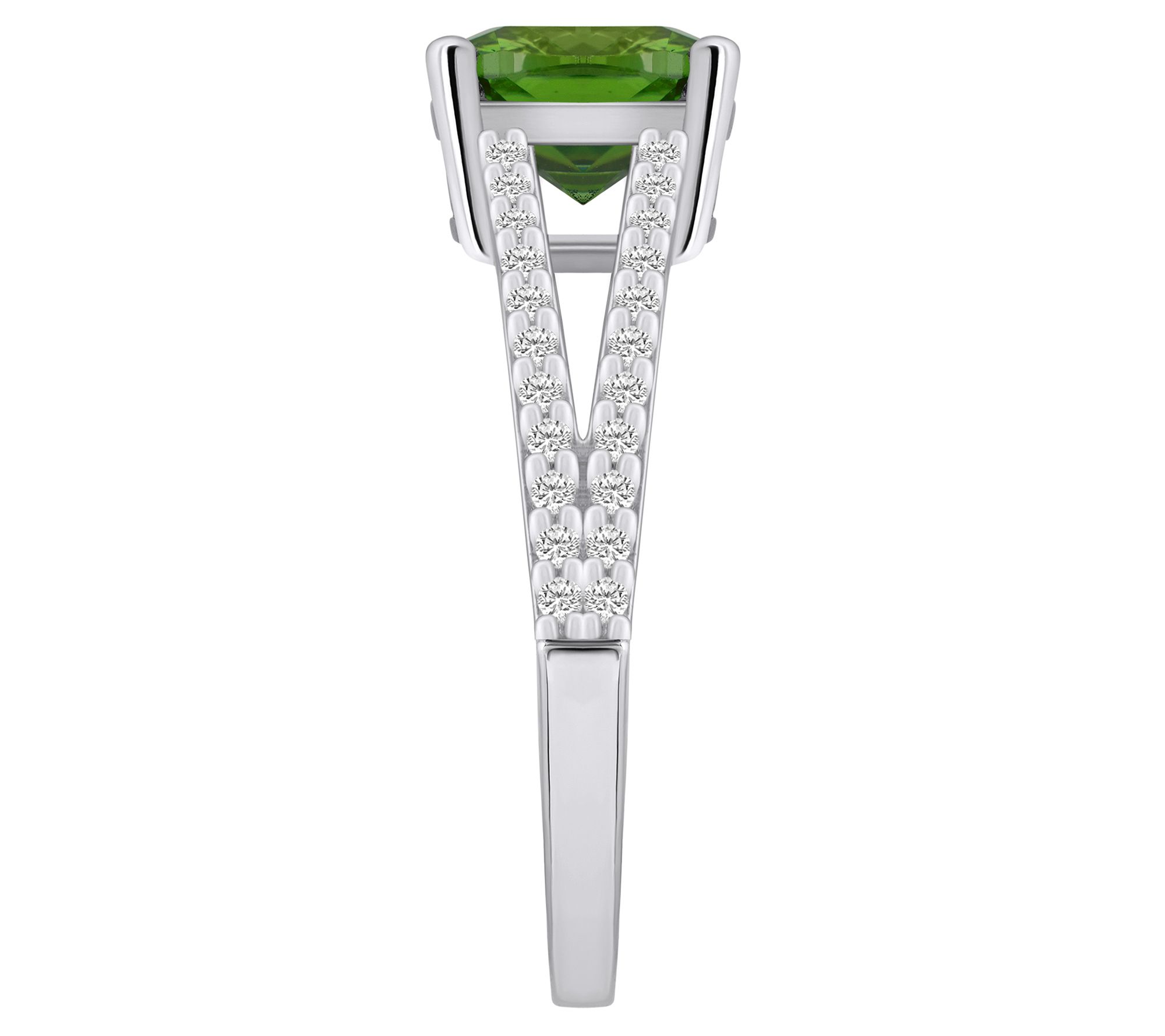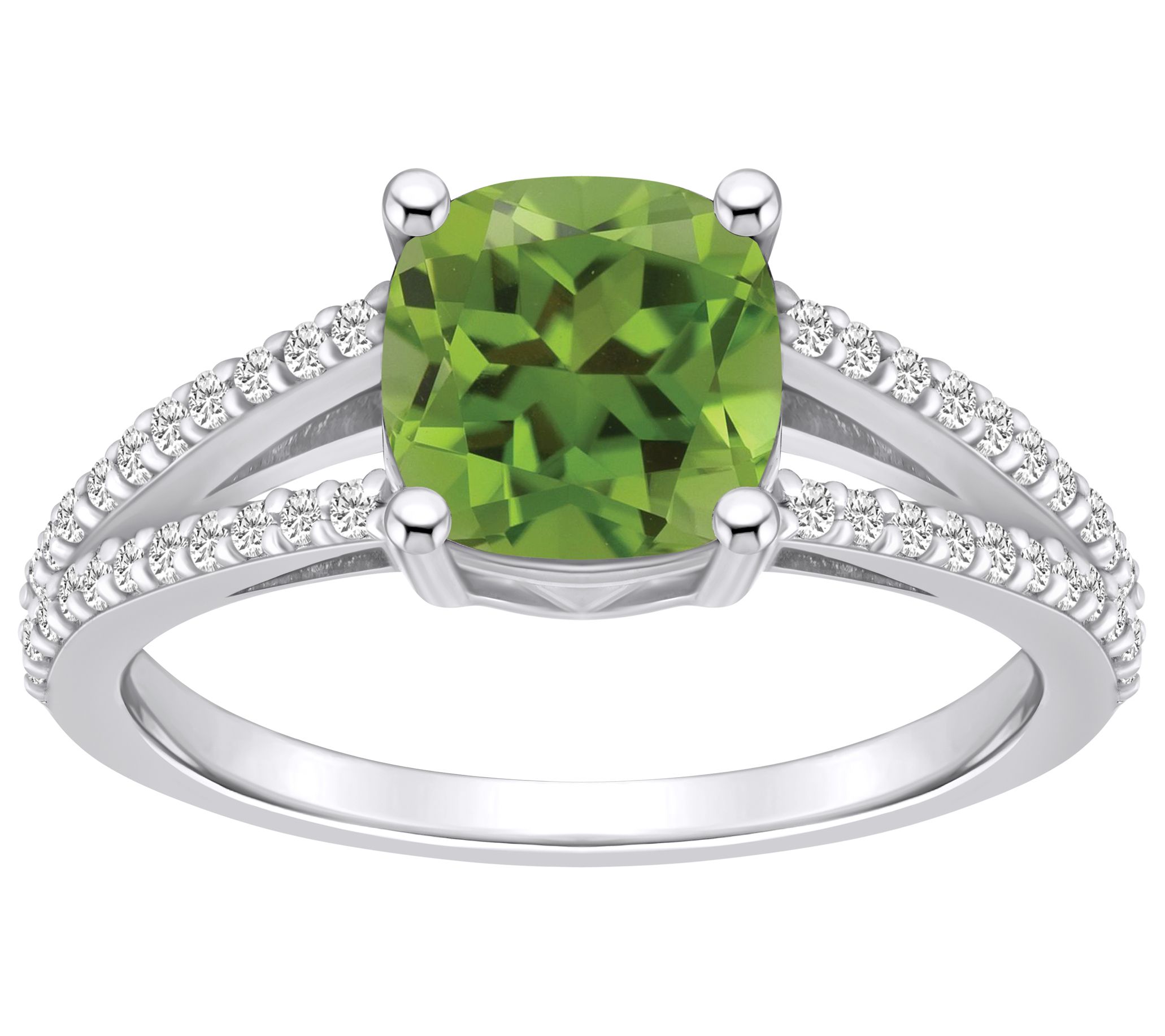 - Center cushion-cut gemstone; split shank with diamond accents