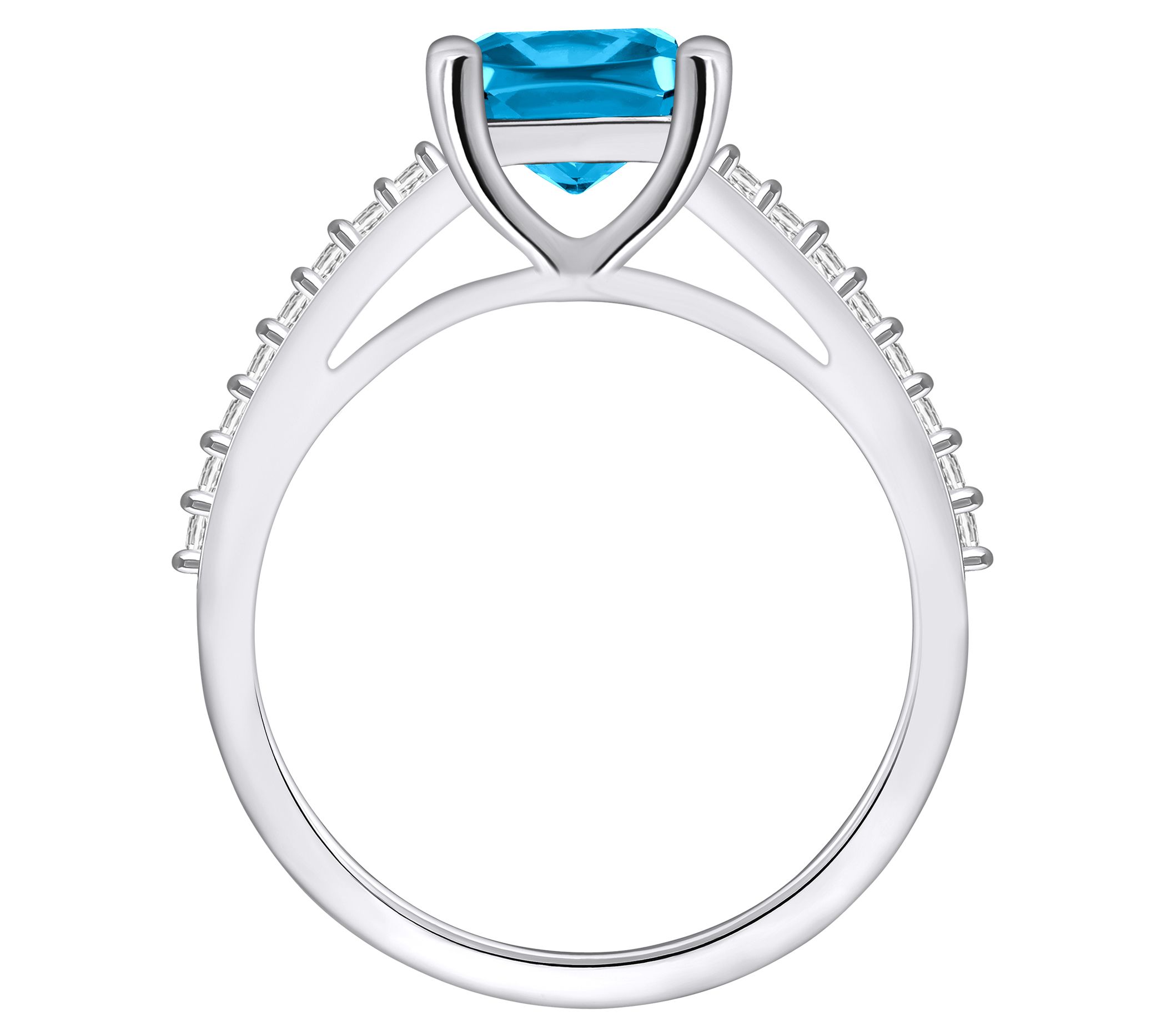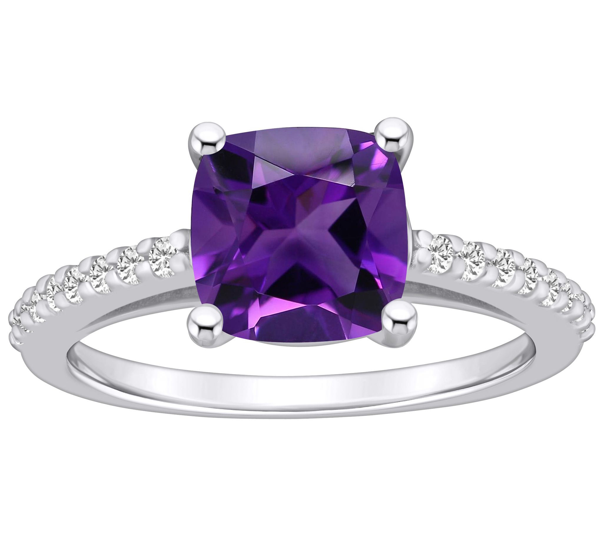 - Cushion-cut, prong-set gemstone; round, prong-set diamond accents along shank; polished finish