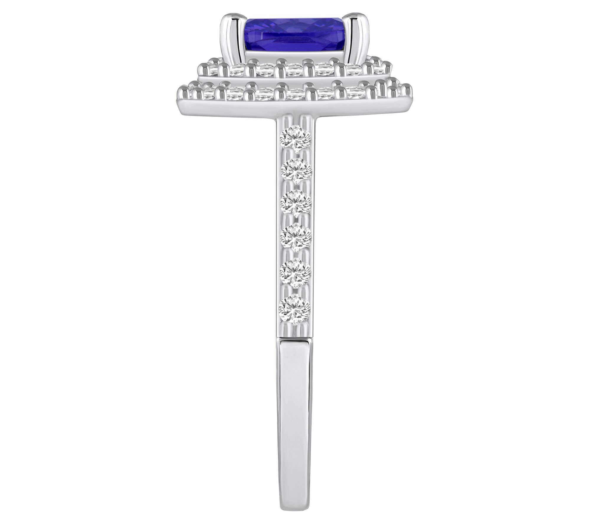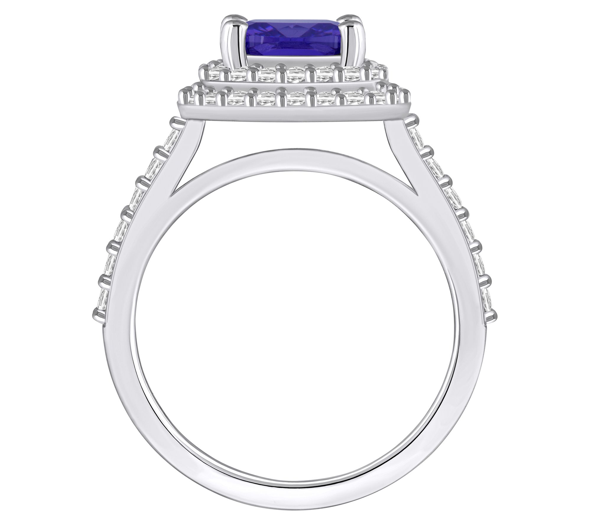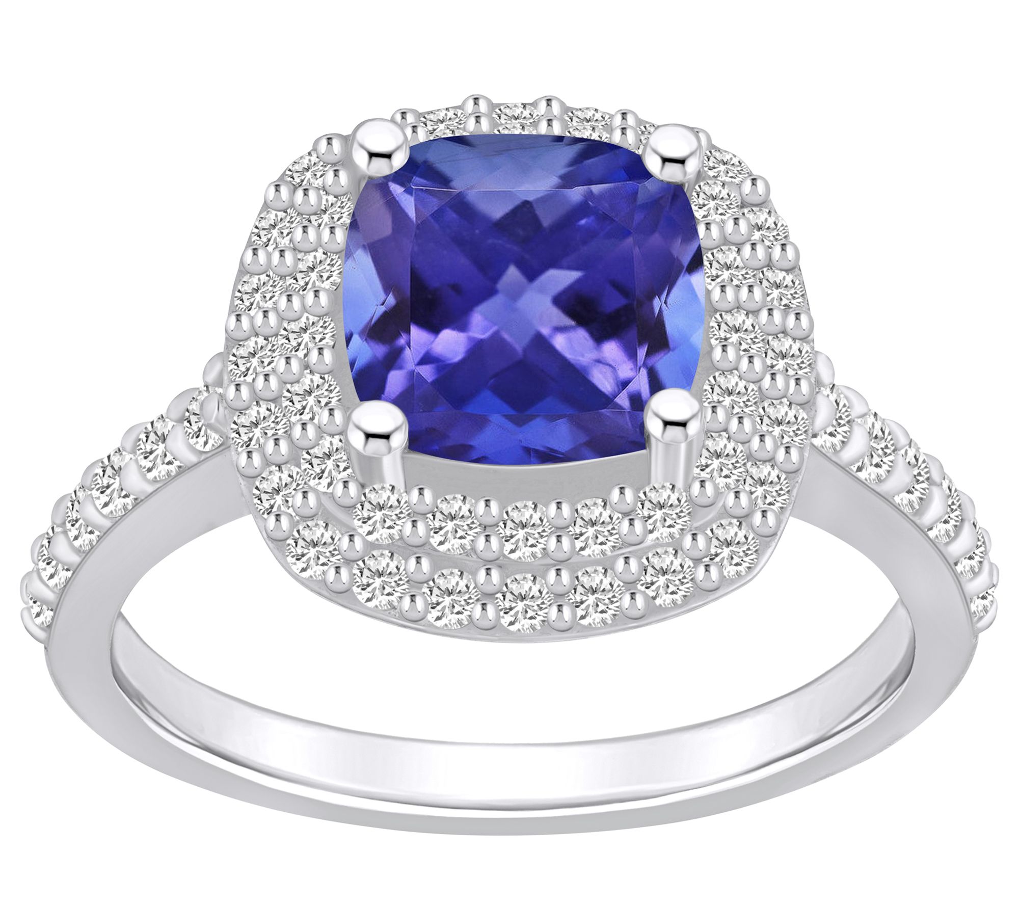 Cushion-cut tanzanite; double halo of diamonds; diamond accents on the shank