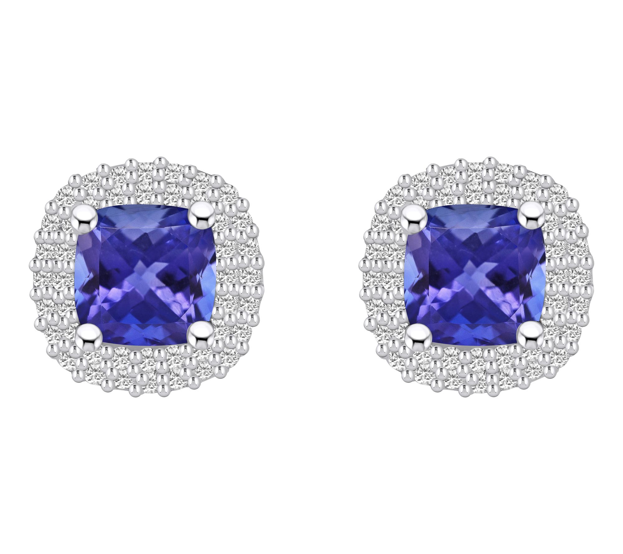 Transform any ensemble with these dazzling tanzanite and diamond halo earrings. These stunning studs feature cushion-cut tanzanite surrounded by a double halo of diamonds. From Affinity Gems.