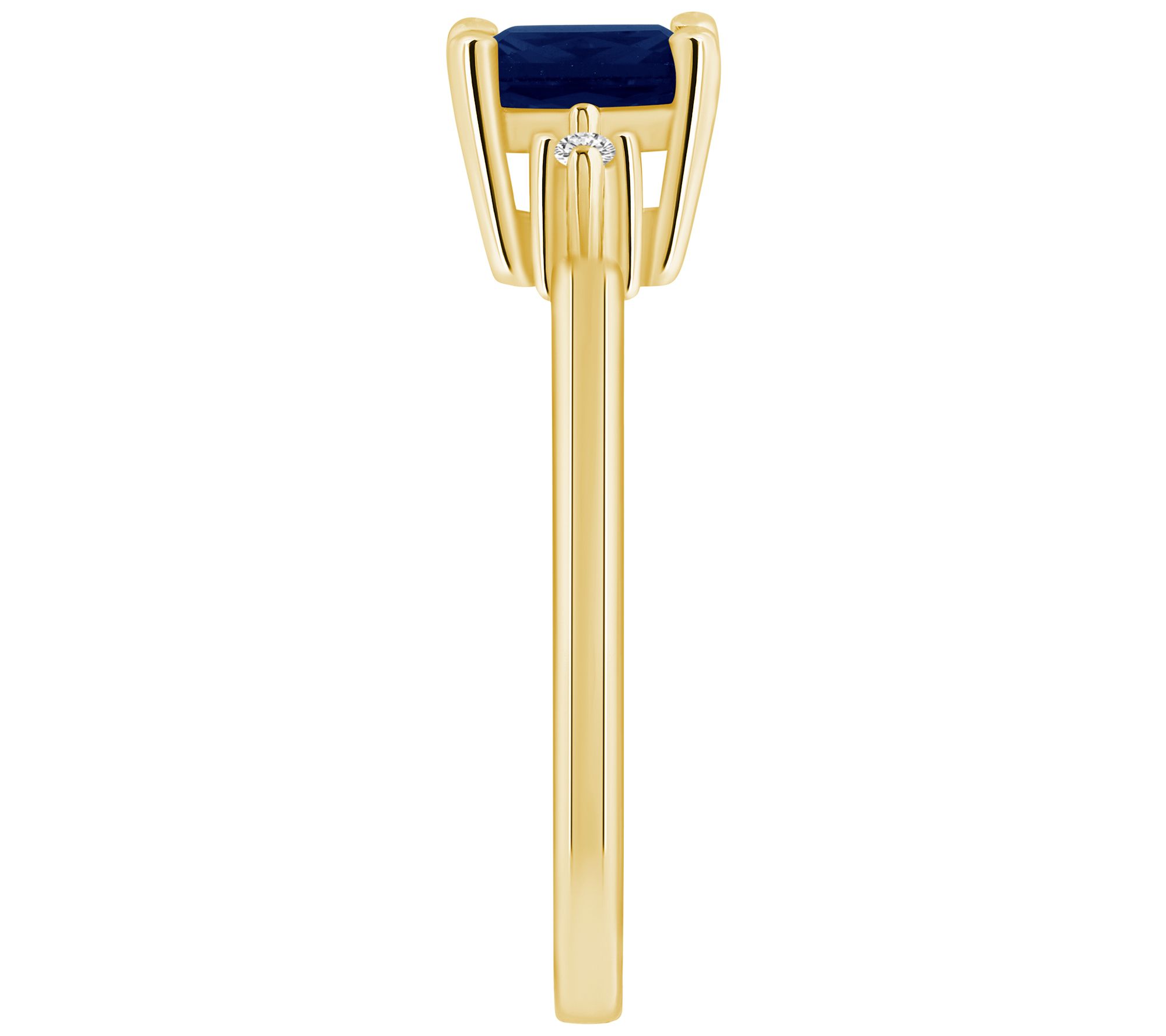 - Center emerald-cut gemstone flanked by two round-cut diamonds