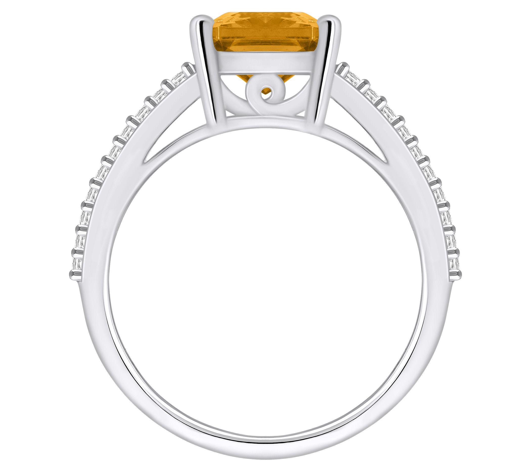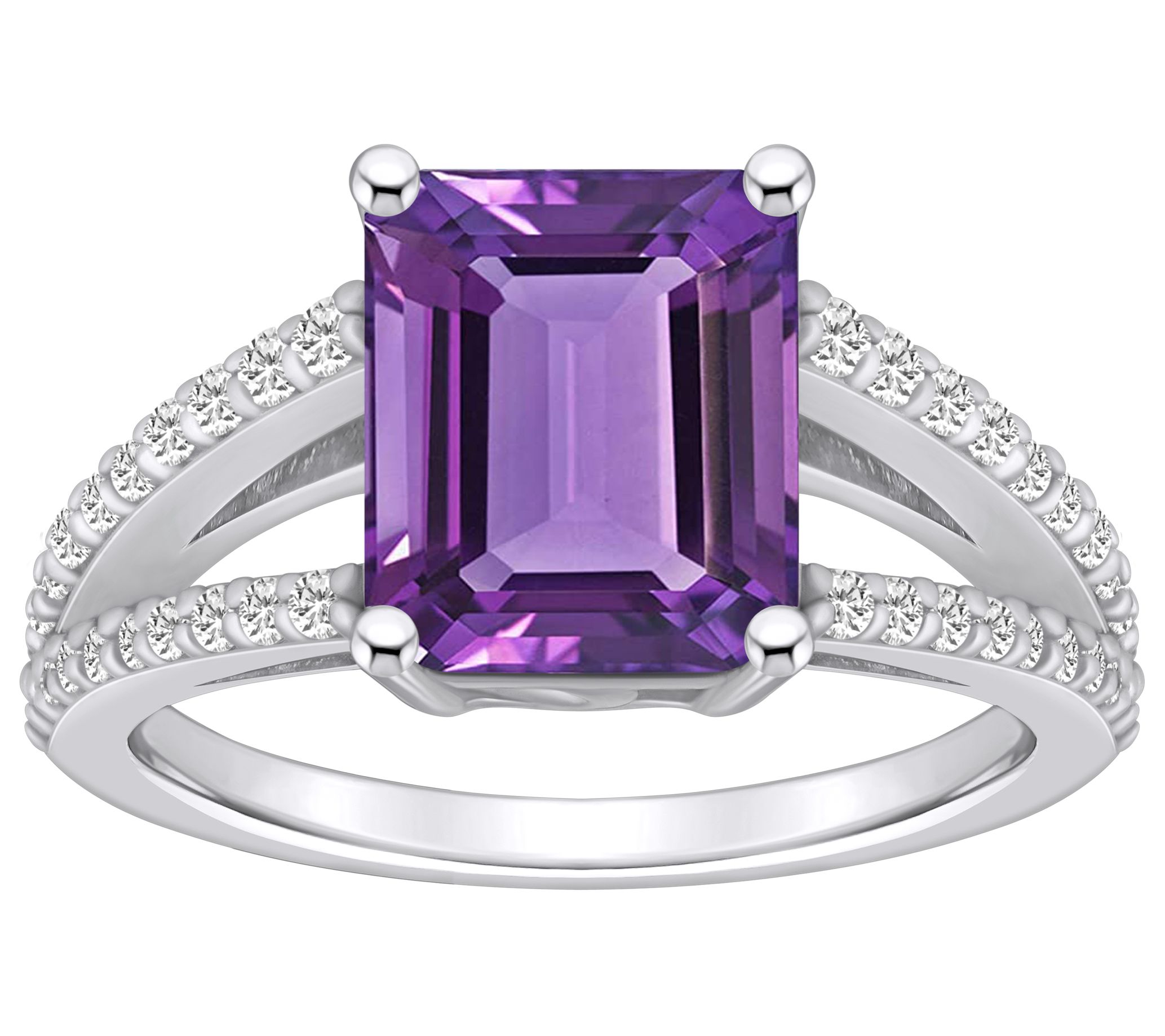 - Center emerald-cut gemstone; split shank with diamond accents