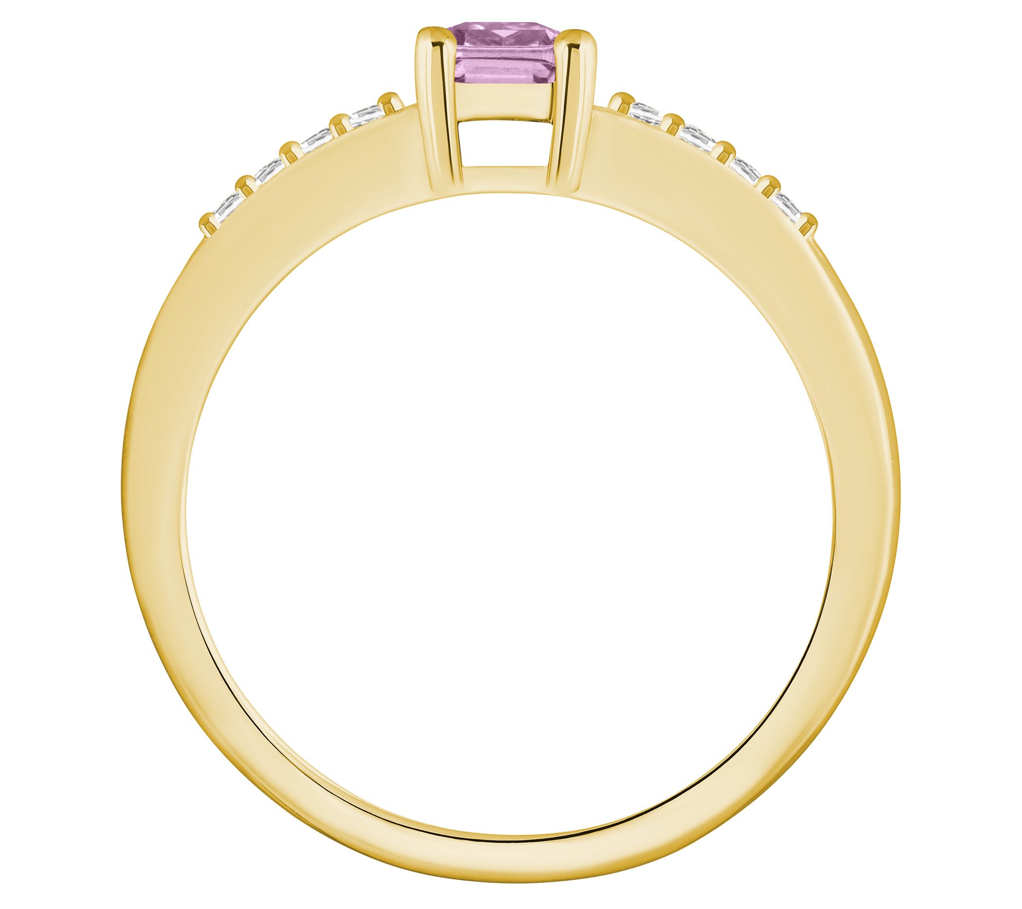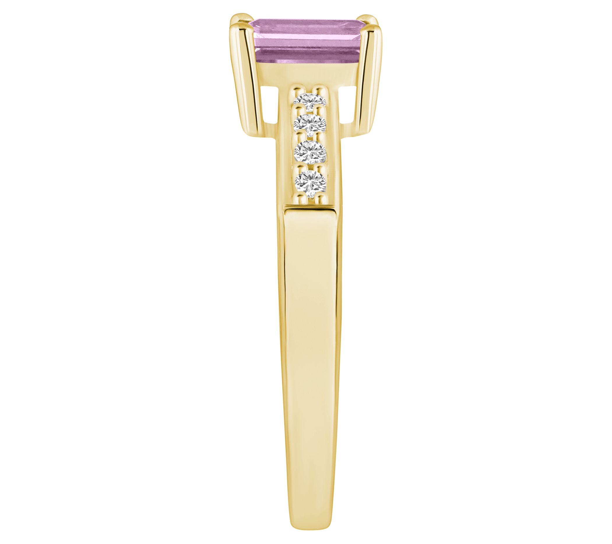 Center emerald-cut gemstone; diamond accents on shank