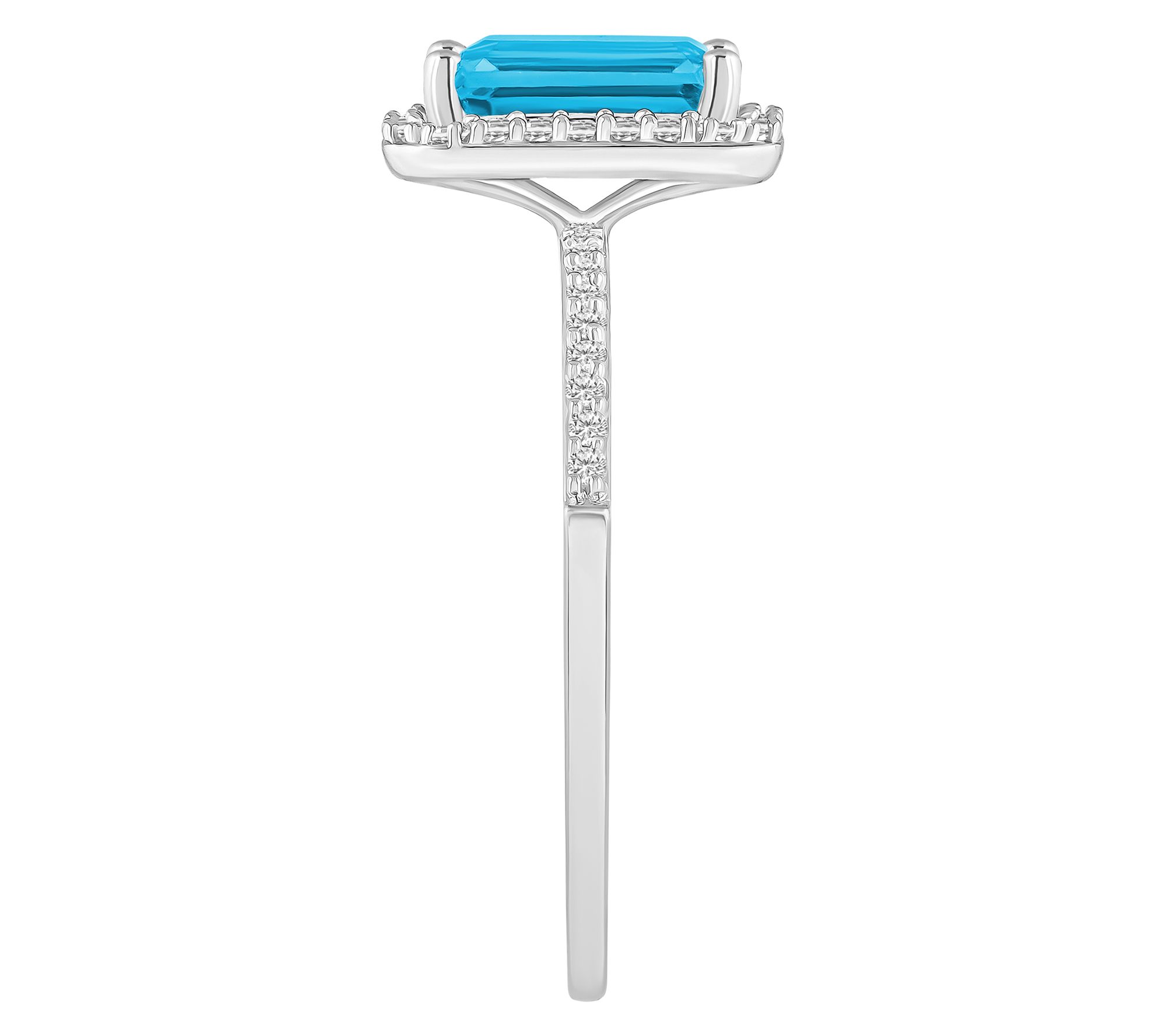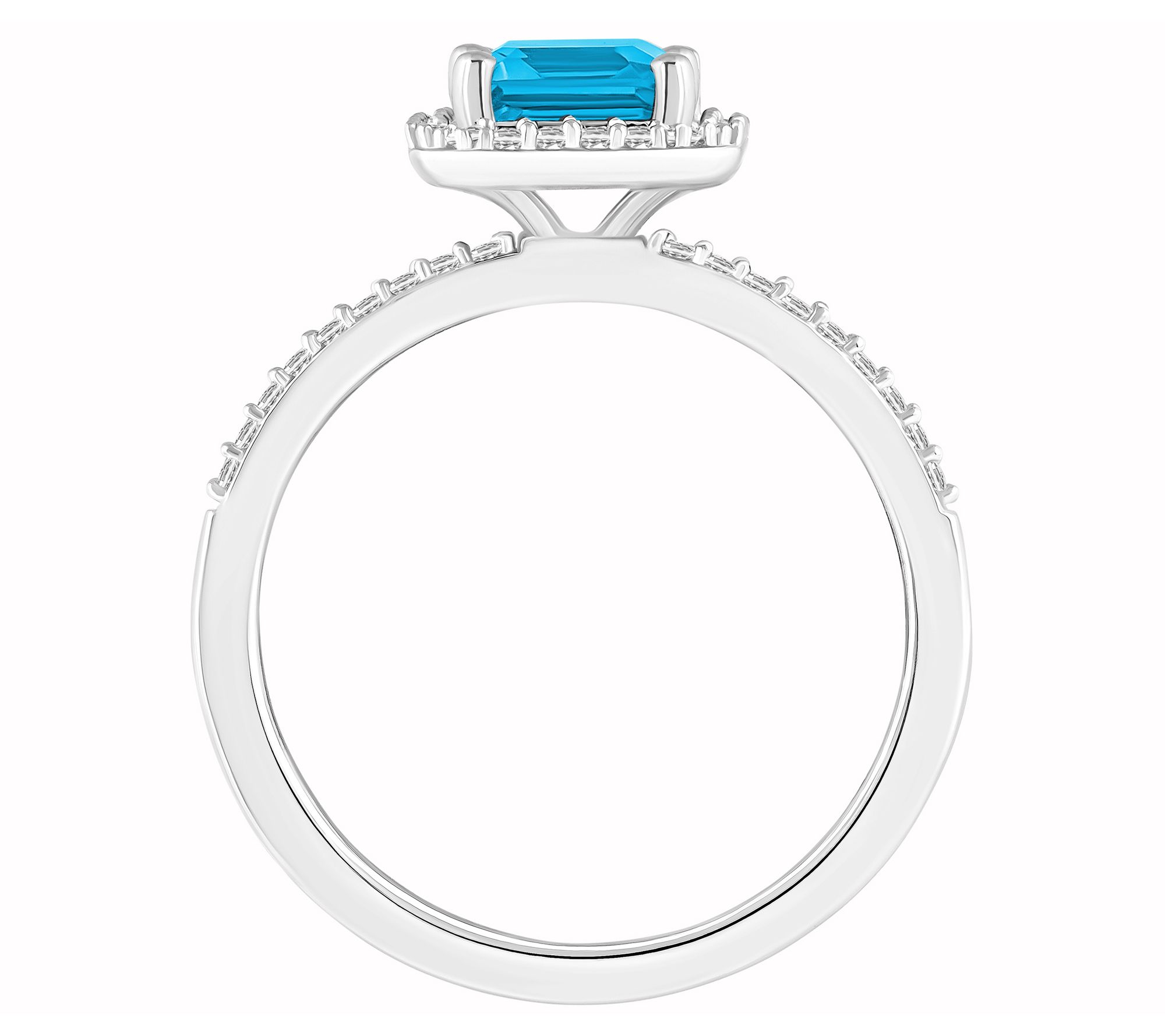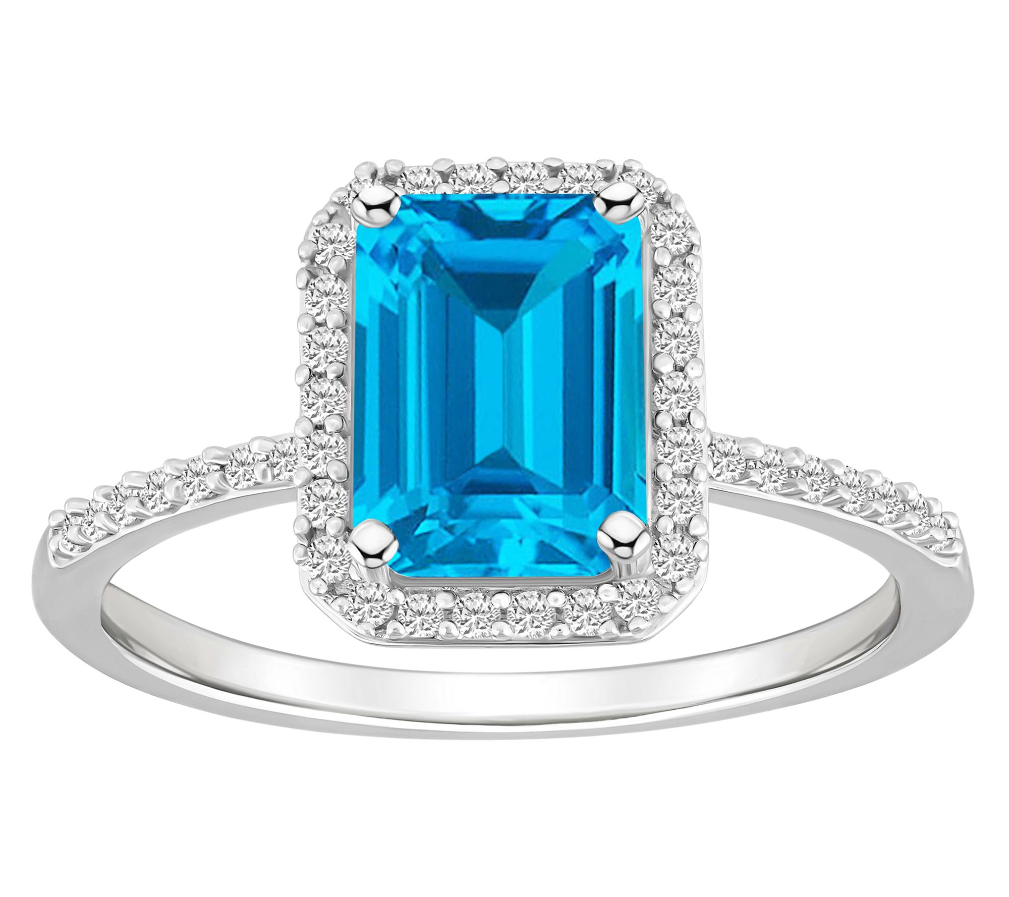 Emerald-cut center gemstone with created white sapphire halo; prong setting