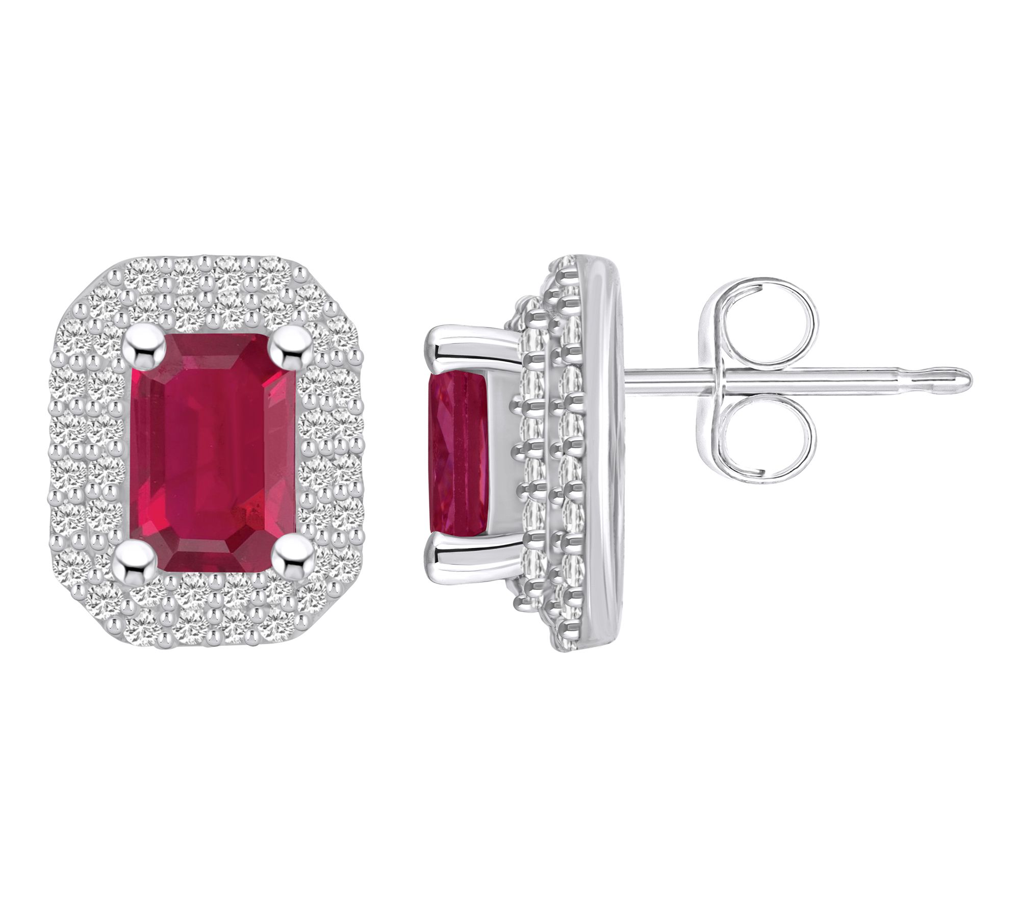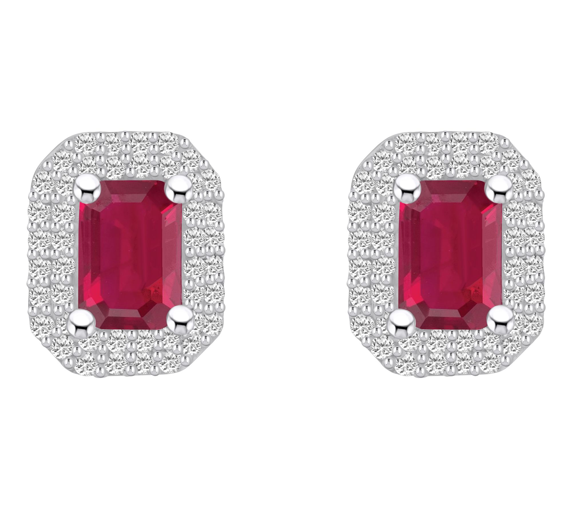 Emerald-cut, prong-set ruby; double halo of round, pave-set diamonds