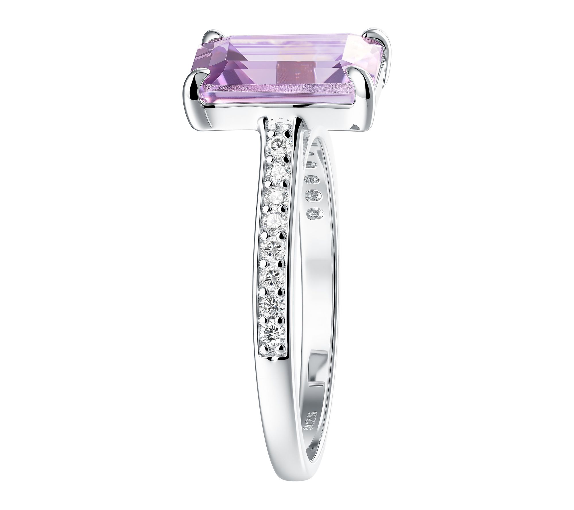 • Emerald-cut, prong-set gemstone; round, prong-set white zircon accents; polished finish
