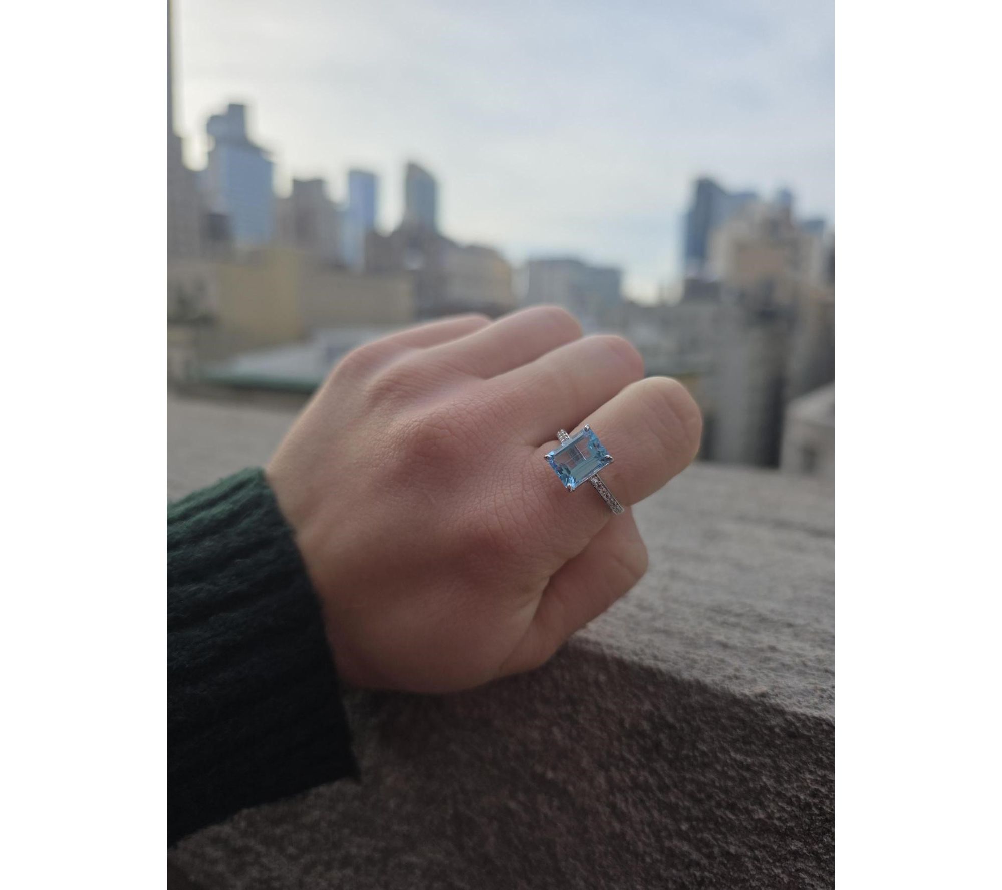 This solitaire ring brings eye-catching color and timeless appeal to any ensemble, whether you're celebrating a milestone or simply elevating your weekday style. An emerald-cut gemstone creates a bold focal point, while white zircon gemstones add shimmer to every gesture. From Affinity® Gems.