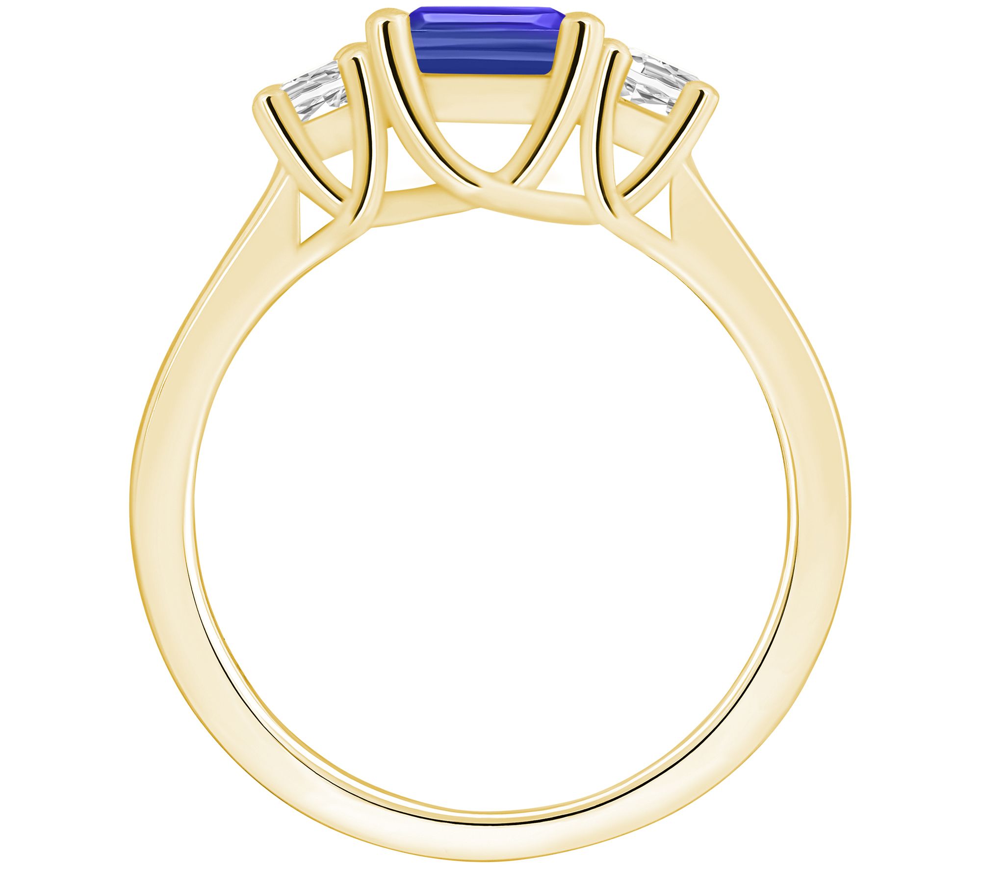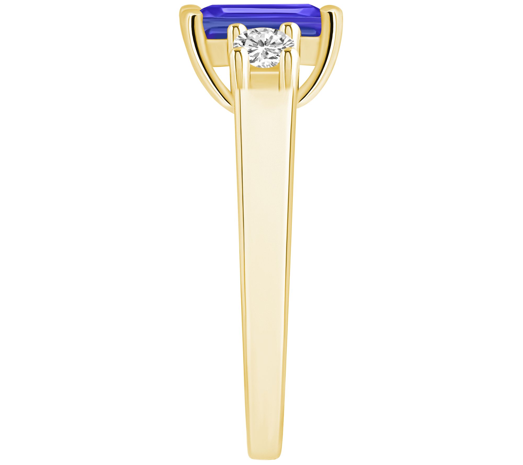 - Center emerald-cut tanzanite flanked by two round-cut diamonds