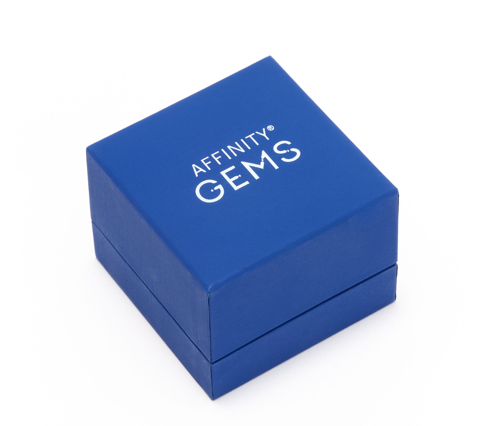 Emerald-cut, faceted London blue topaz with round, faceted white diamonds; prong set stones; polished finish