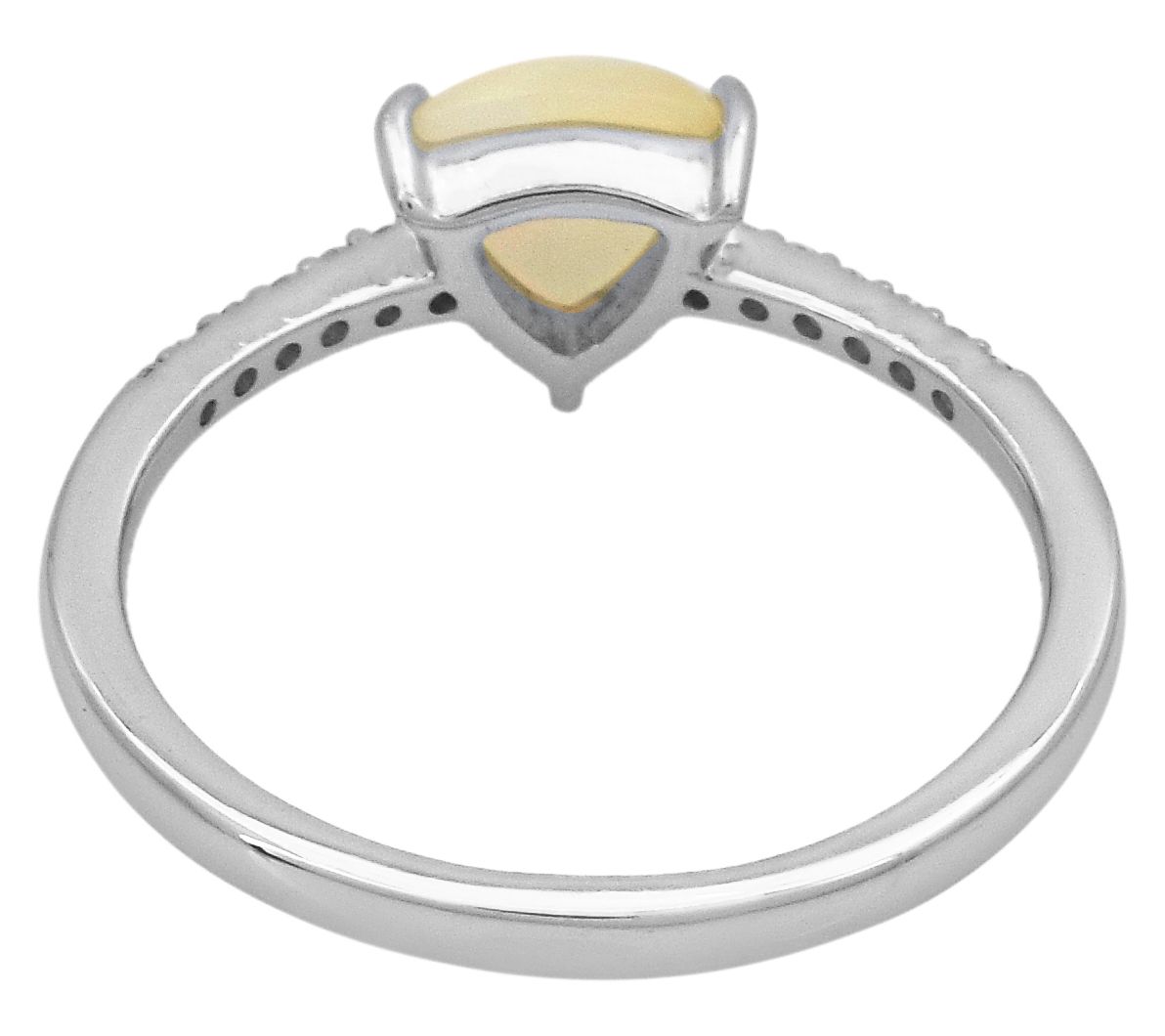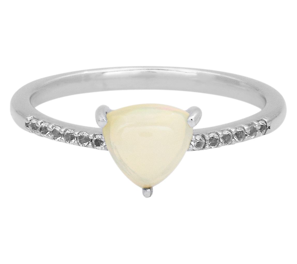 • Trillion-cut Ethiopian opal cabochon center; round topaz gemstones on both sides of shank