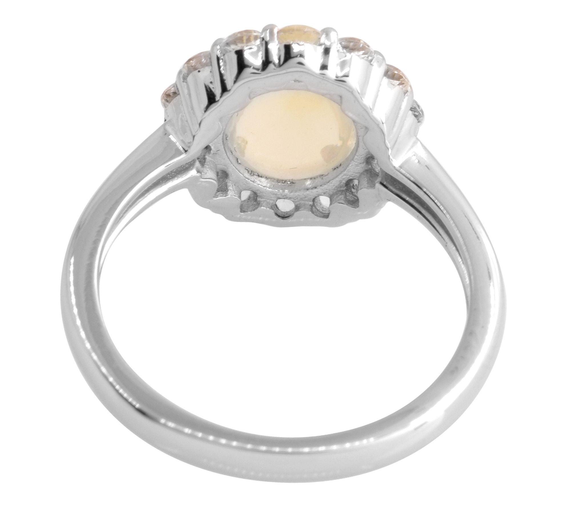 Prong-set Ethiopian opal surrounded by a halo of round-cut white topaz