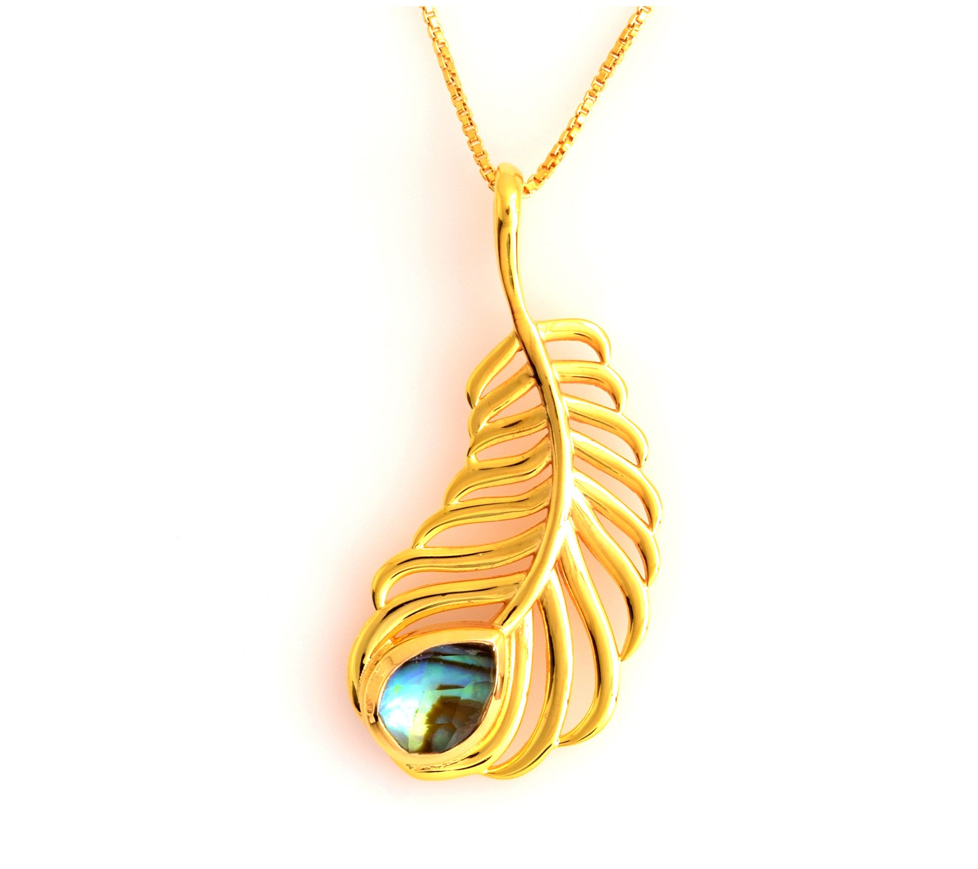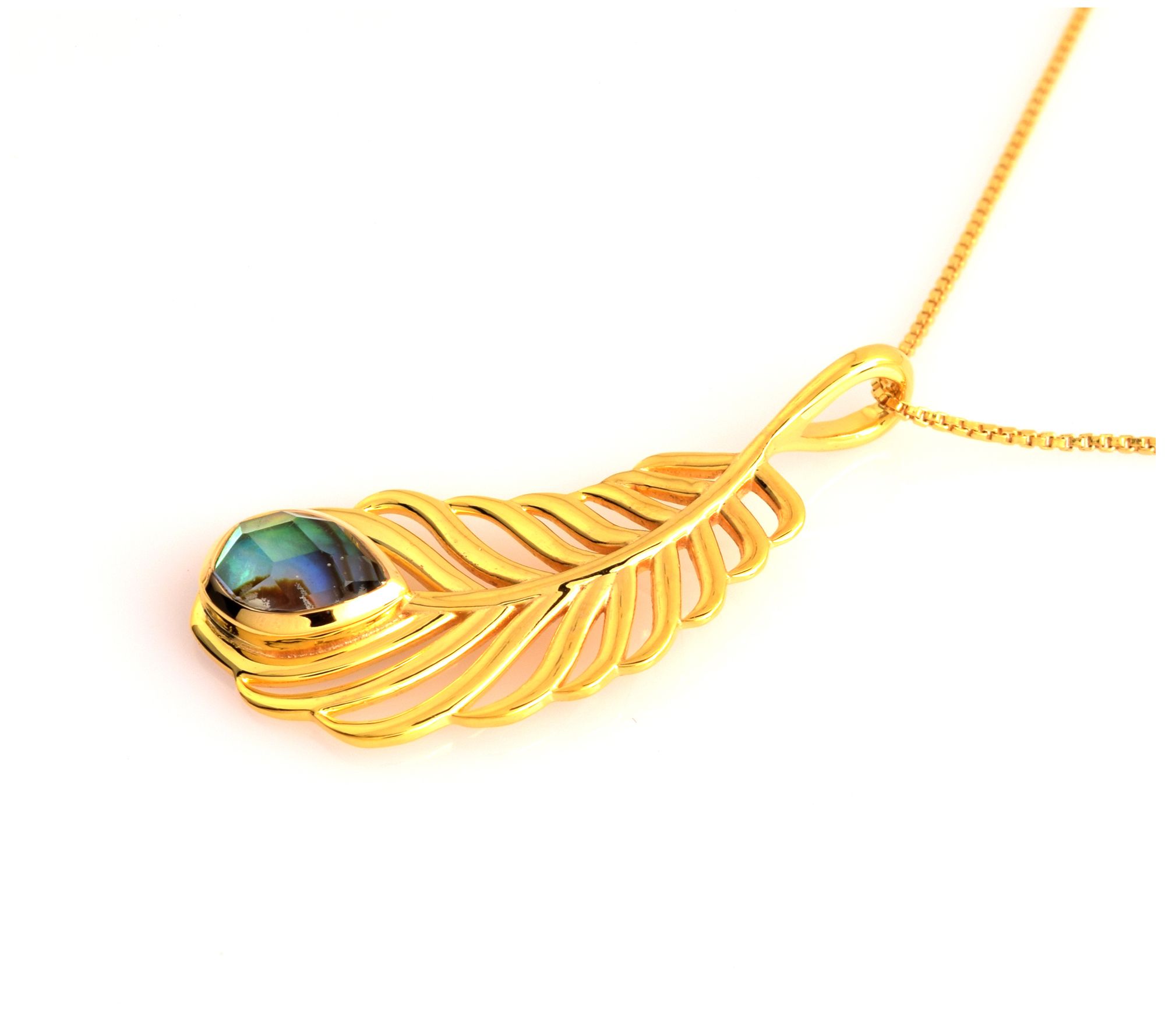 Feather pendant with gray rainbow cultured pearl doublet on one side and quartz crystal on the other; box chain