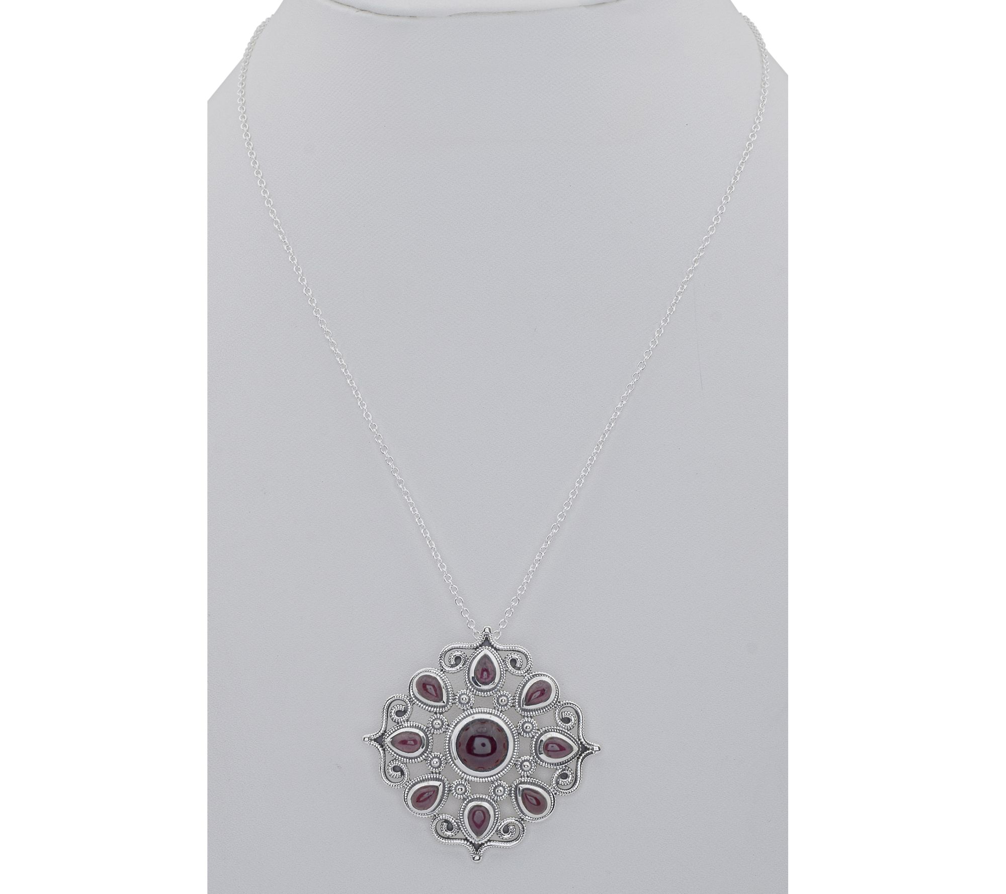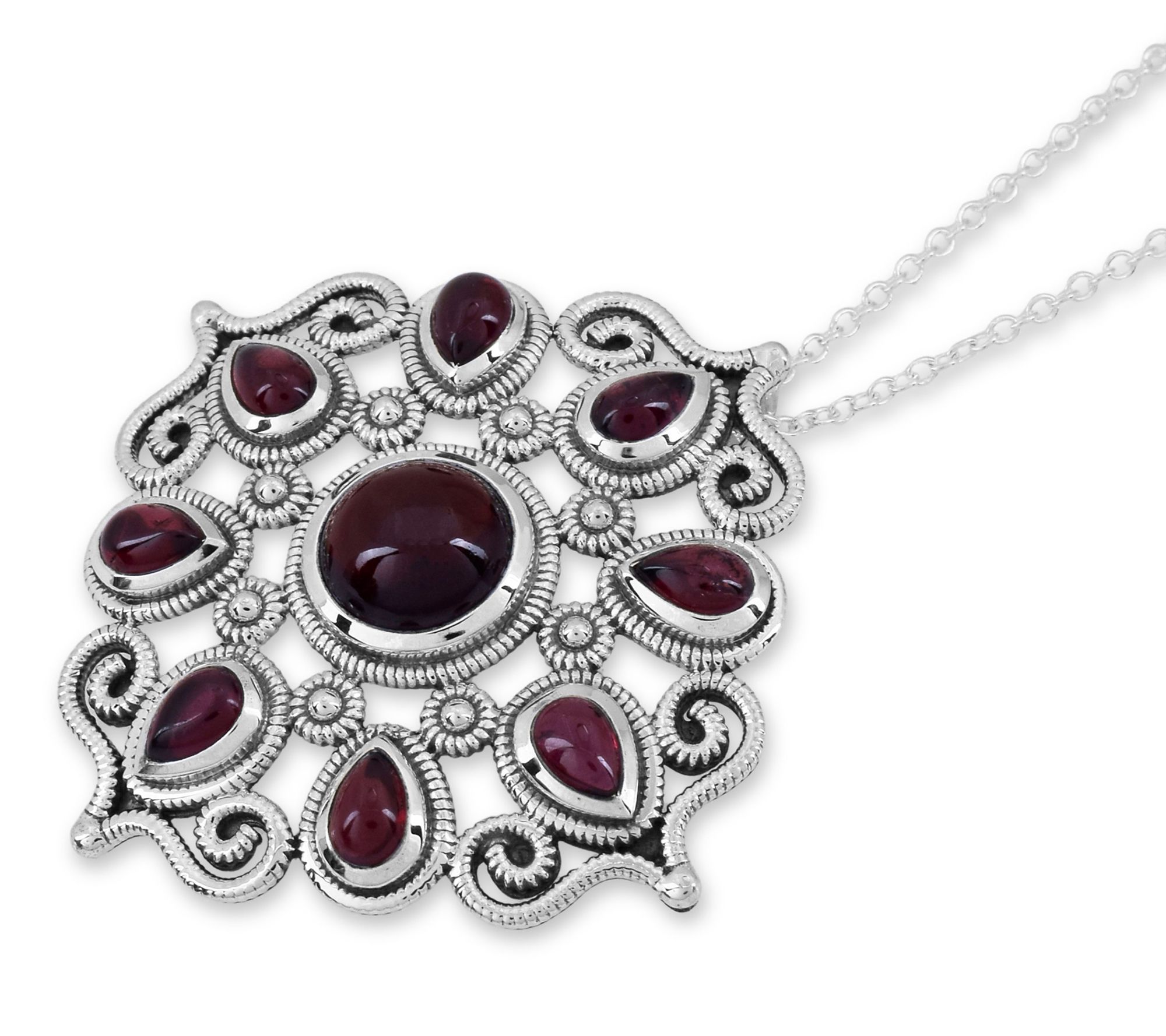 Halo pendant design; bezel-set garnet cabochons in round and pear shapes; oxidized; oval link chain