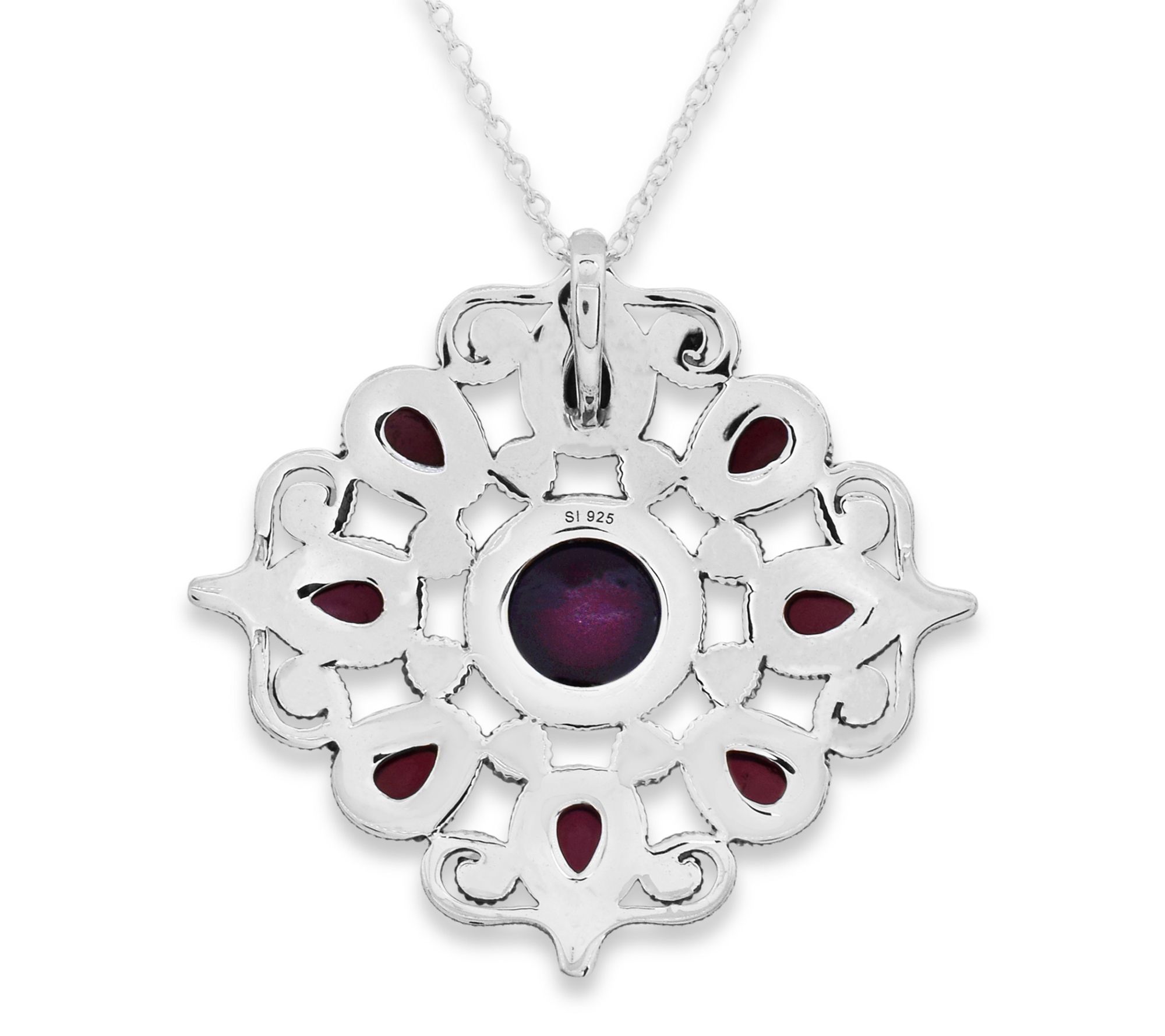 Draw all eyes to the fiery beauty of garnet in this sterling silver pendant necklace, where round and pear-shape cabochons shimmer within a captivating halo design. Paired with an oval link chain and lobster claw clasp, this necklace brings just-the-right pop of color to your workday style or adds romance to a special evening look. From Affinity® Gems.