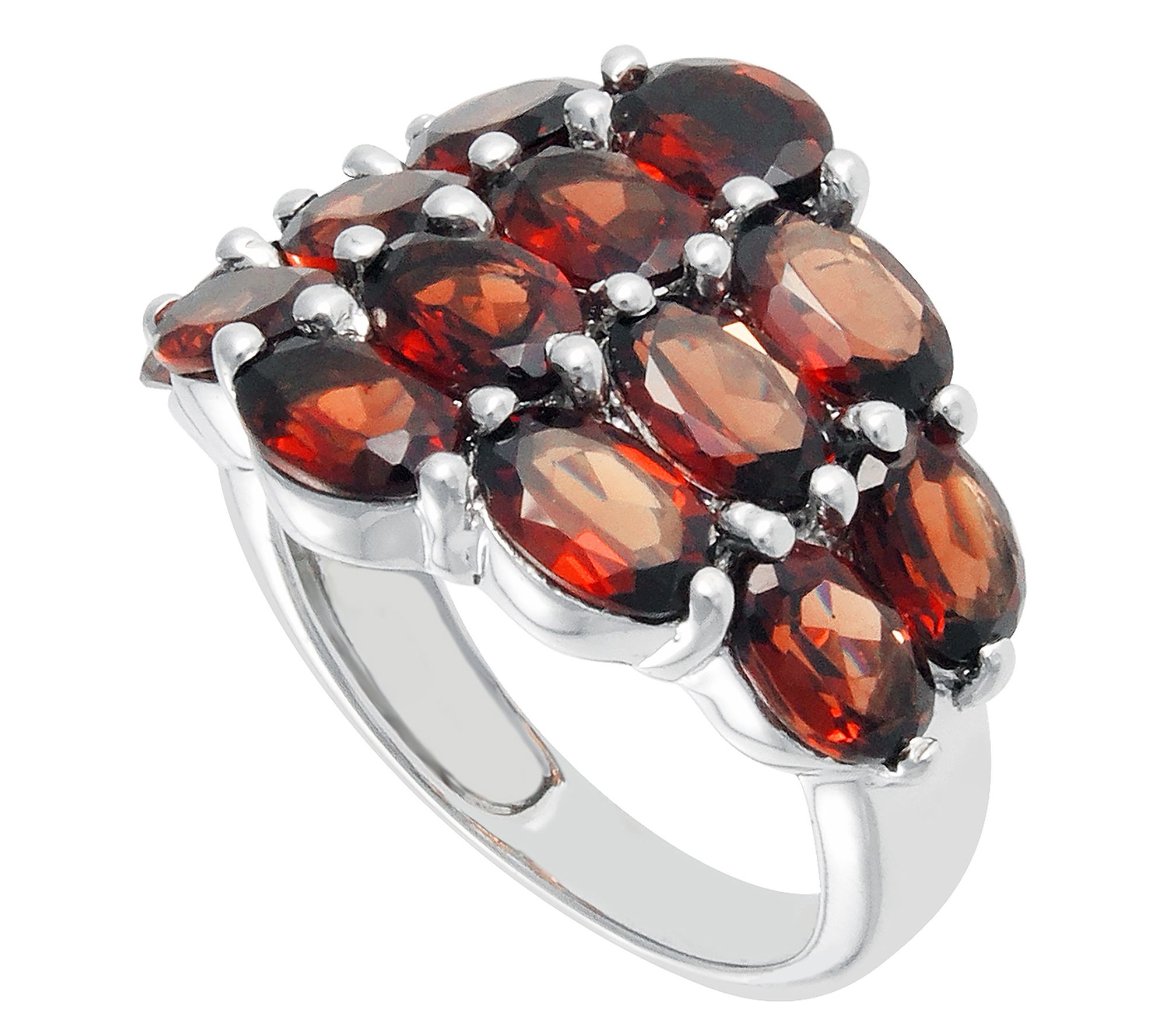 • Oval, prong-set garnet gemstones; polished band