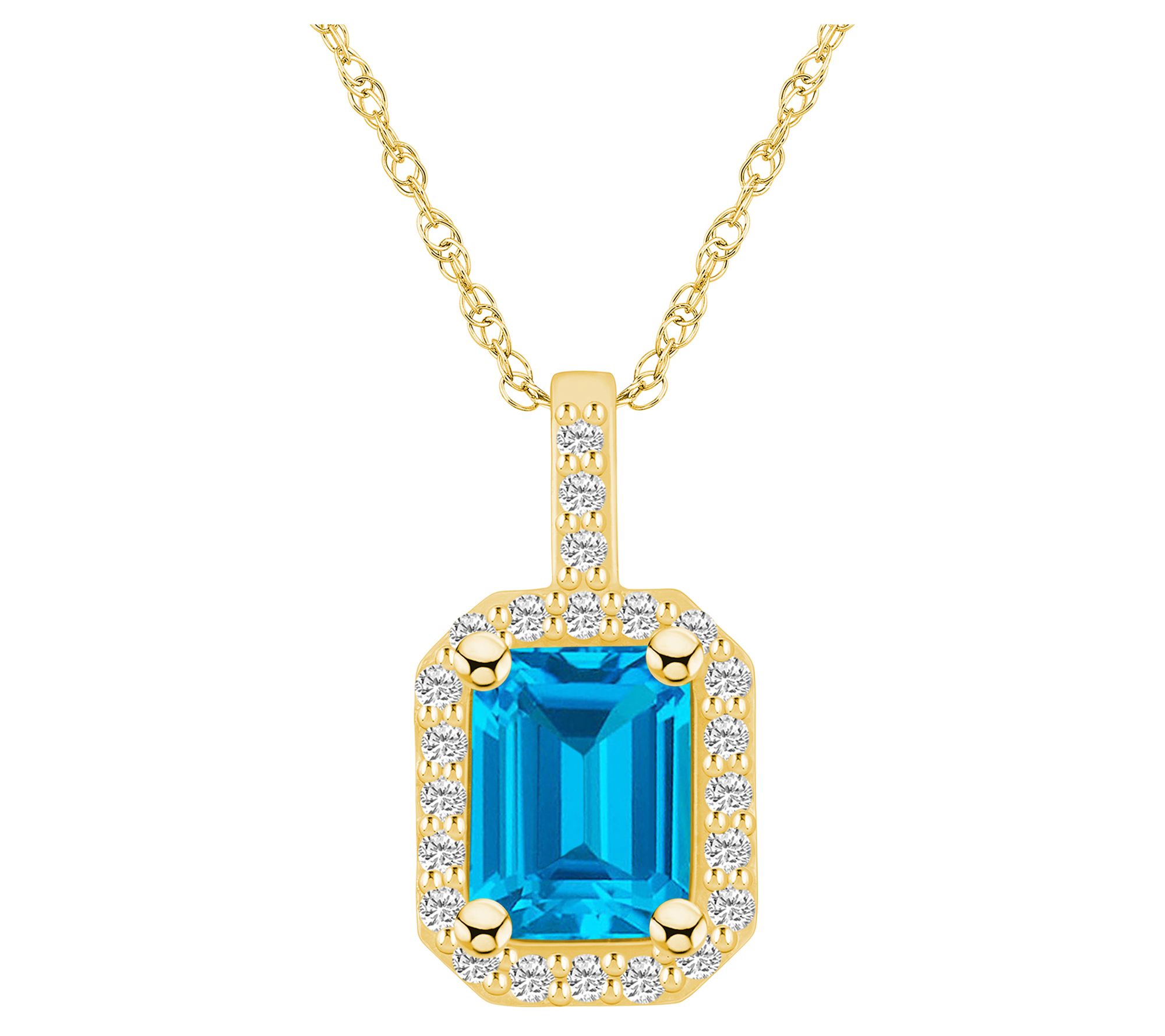 • Emerald-cut, prong-set gemstone with a halo of prong-set, round-cut diamonds; rope chain