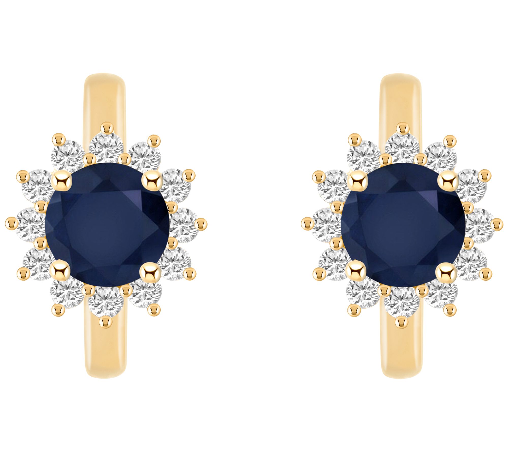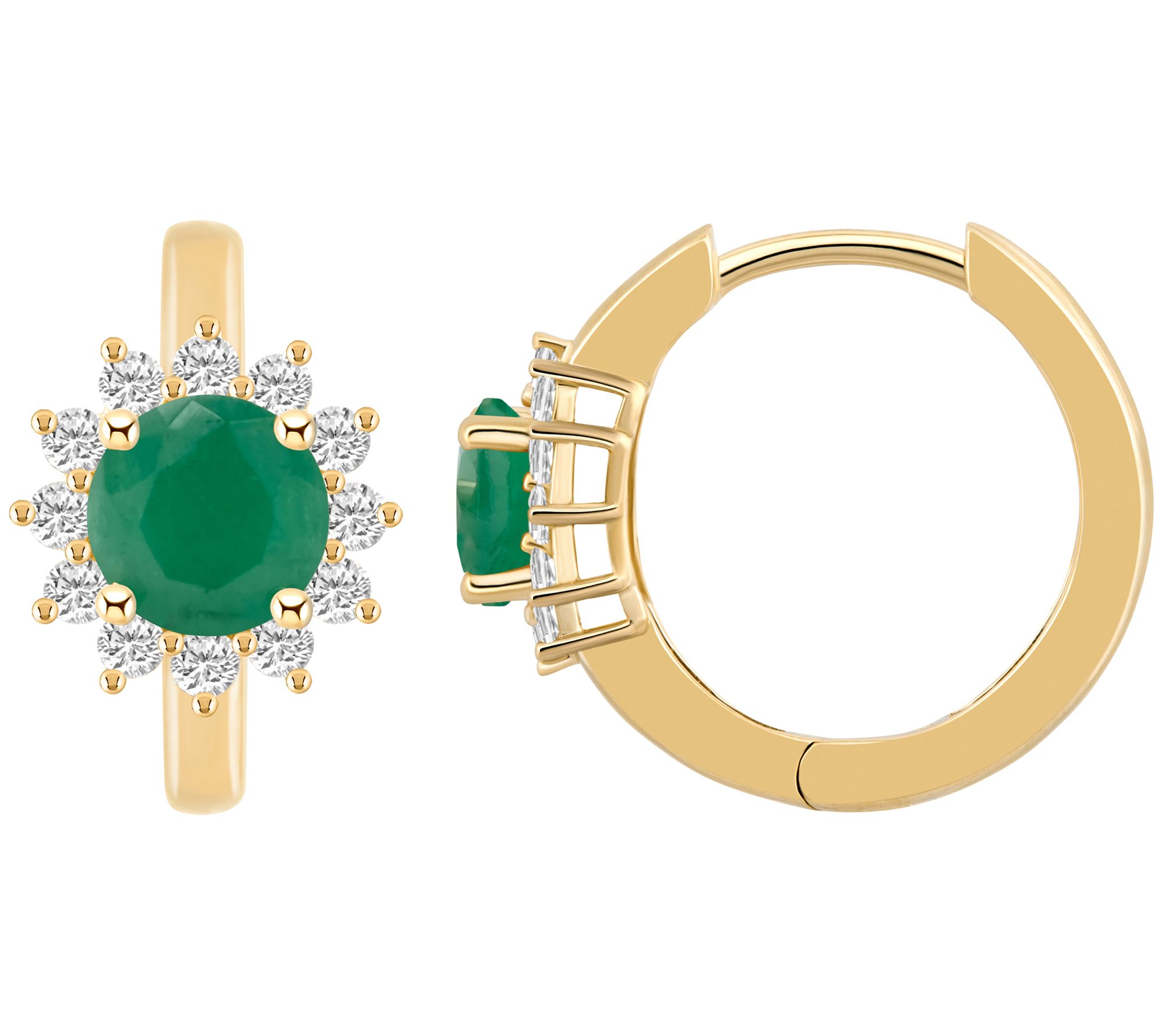 • Huggie hoop design; prong-set, round gemstone with halo of prong-set, round diamonds