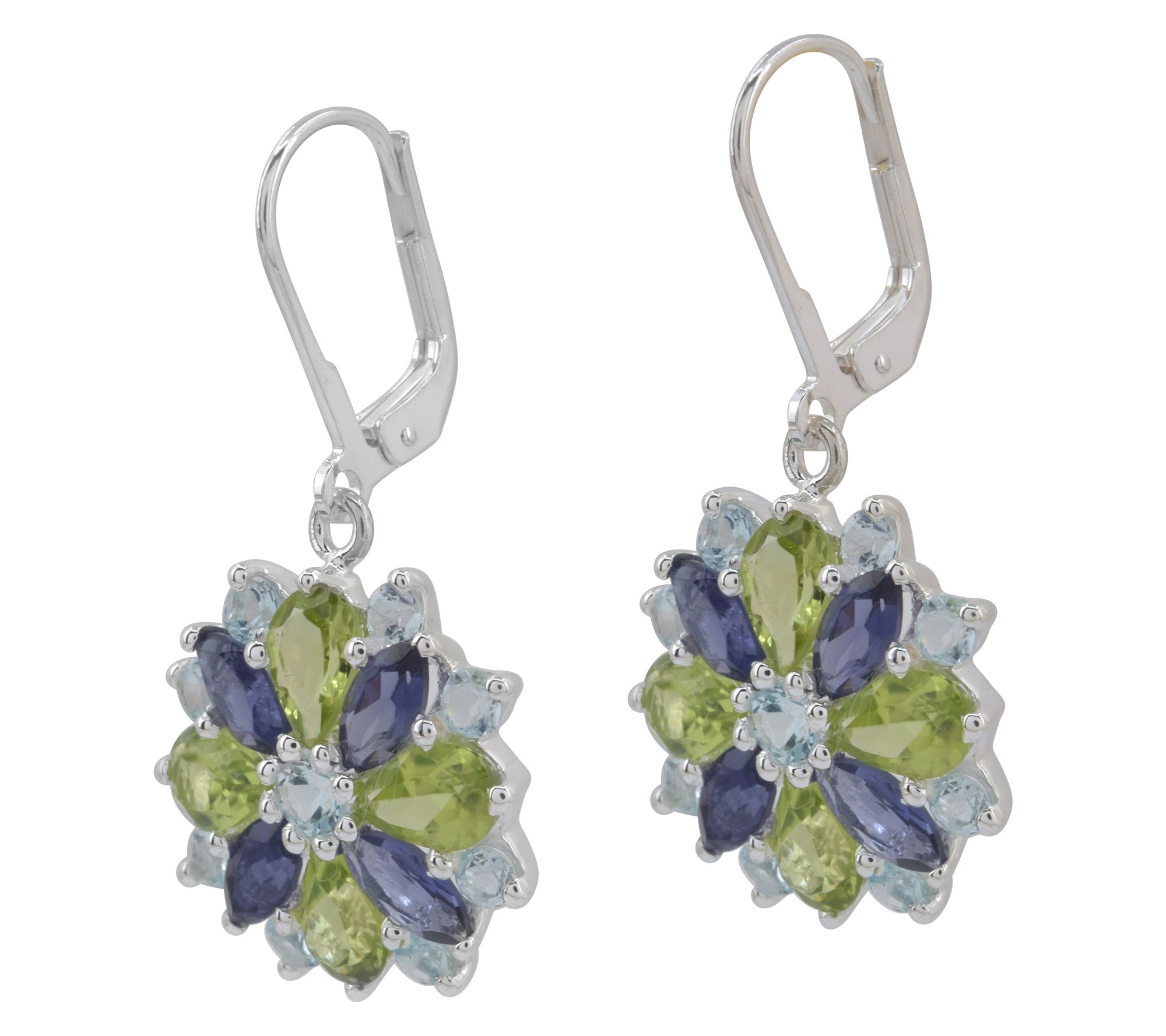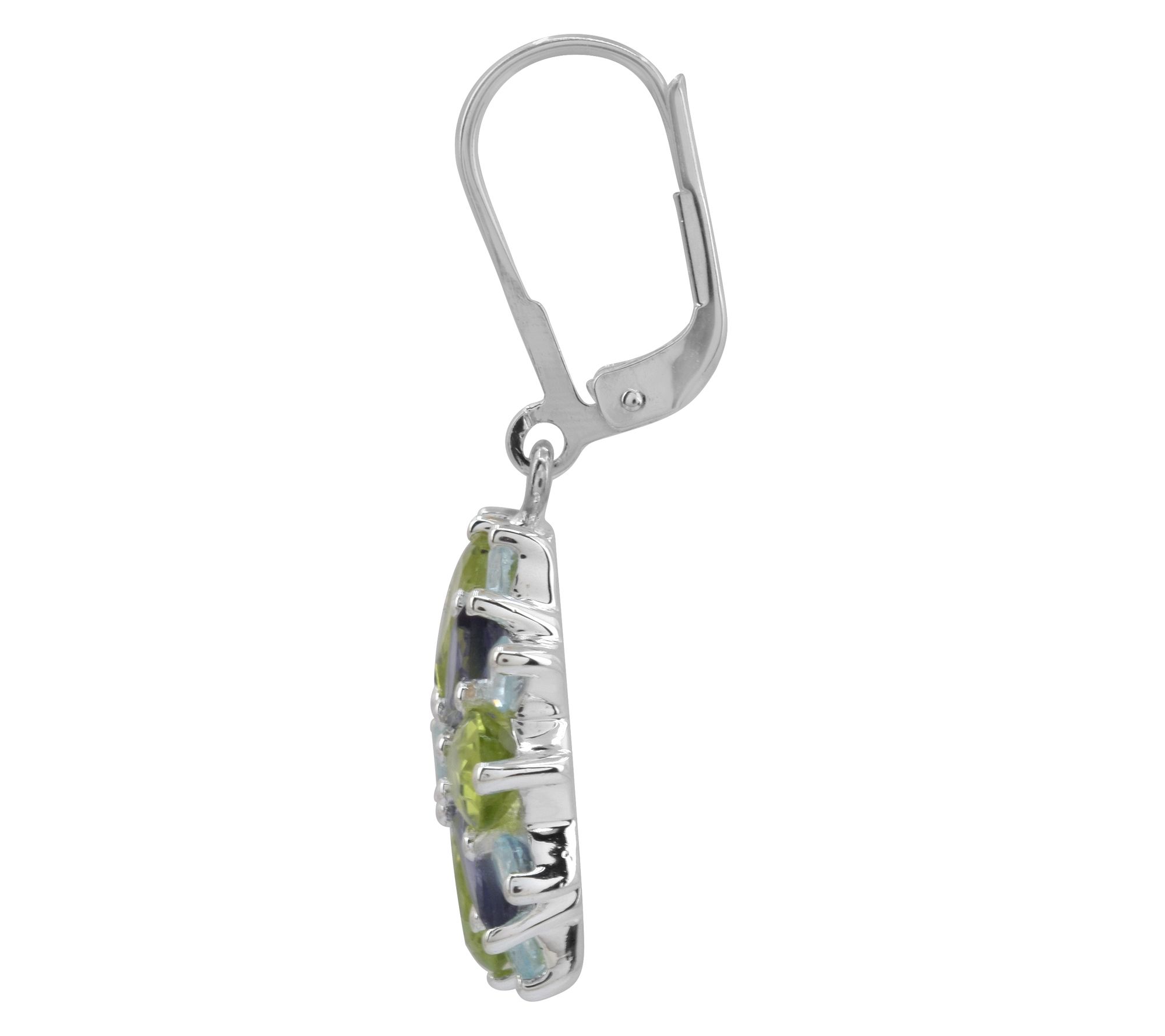 Drop design; marquise-cut, prong-set iolite; round-cut, prong-set blue topaz; pear-cut, prong-set peridot