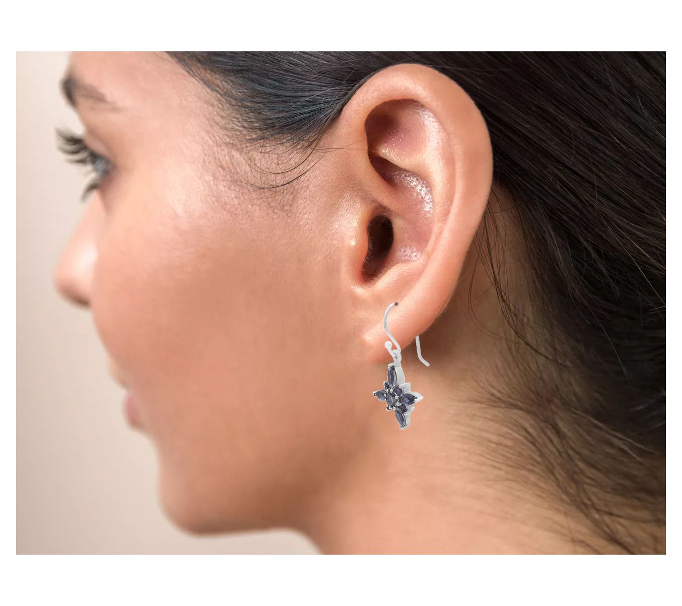 Floral inspiration meets vibrant blue hues in these iolite dangle earrings, adding a lively twist to day or evening attire. Set in platinum-plated sterling silver, the marquise and round gemstones catch the light beautifully with every movement. From Affinity® Gems.
