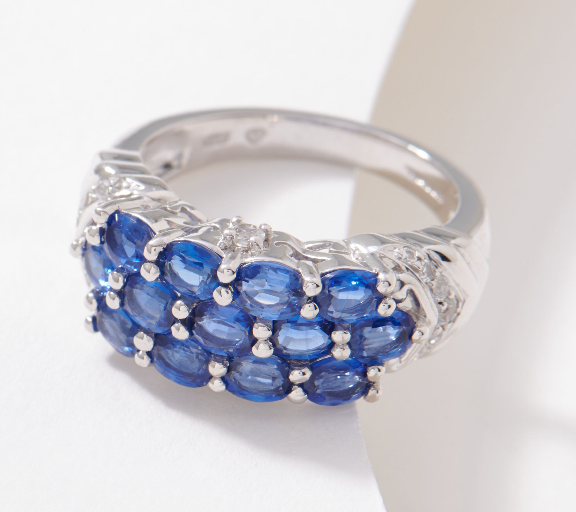 • Three east/west rows of Kashmir blue kyanite gemstones; white zircon gemstones in chevron detail at shank; white zircon in gallery