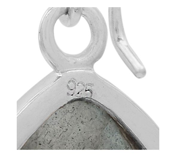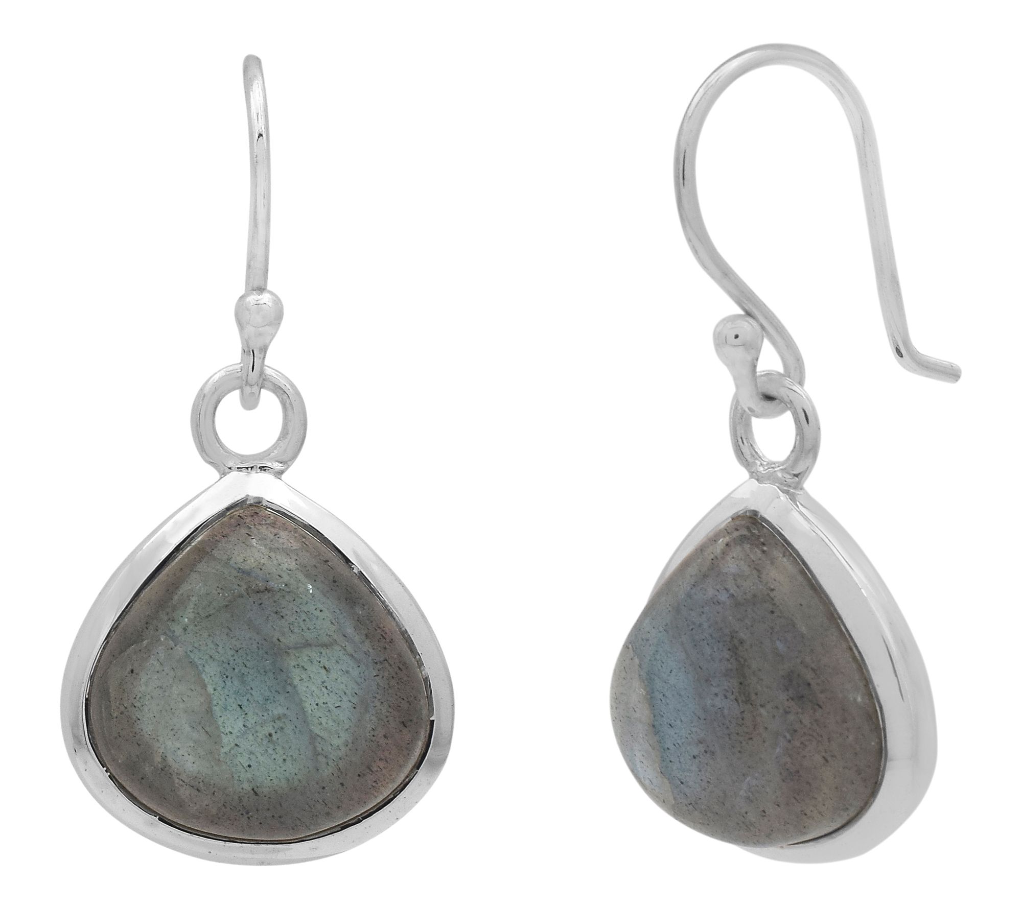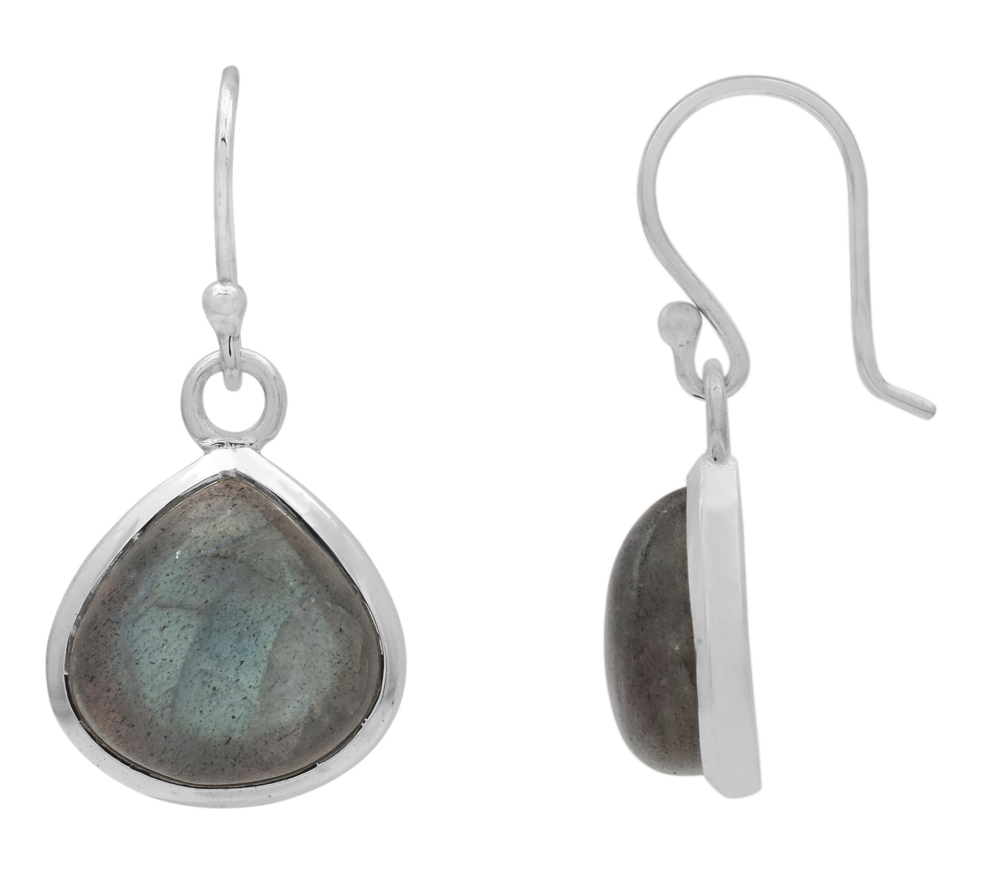 Dangle design; trillion-cut labradorite cabochon in heart bezel setting