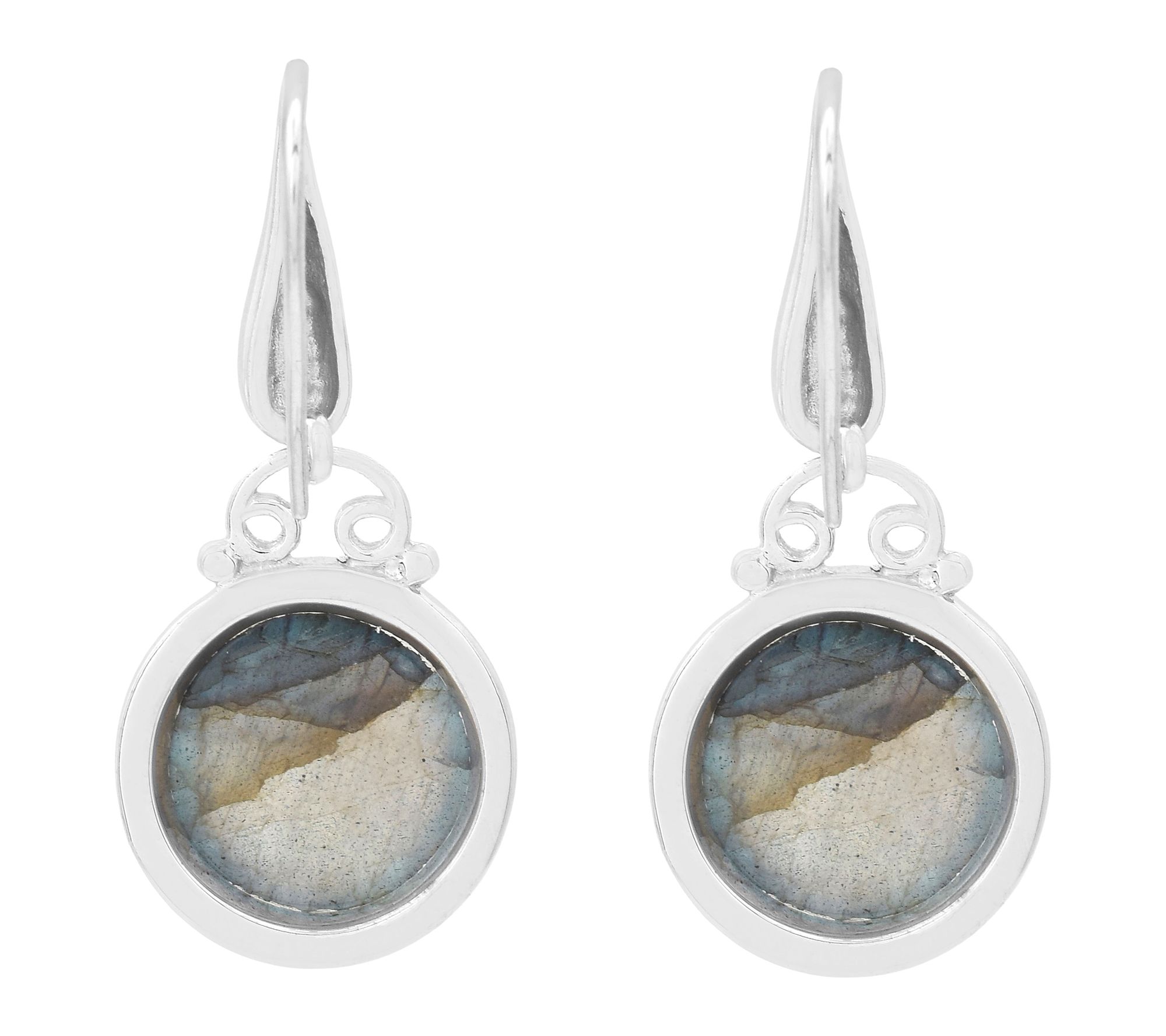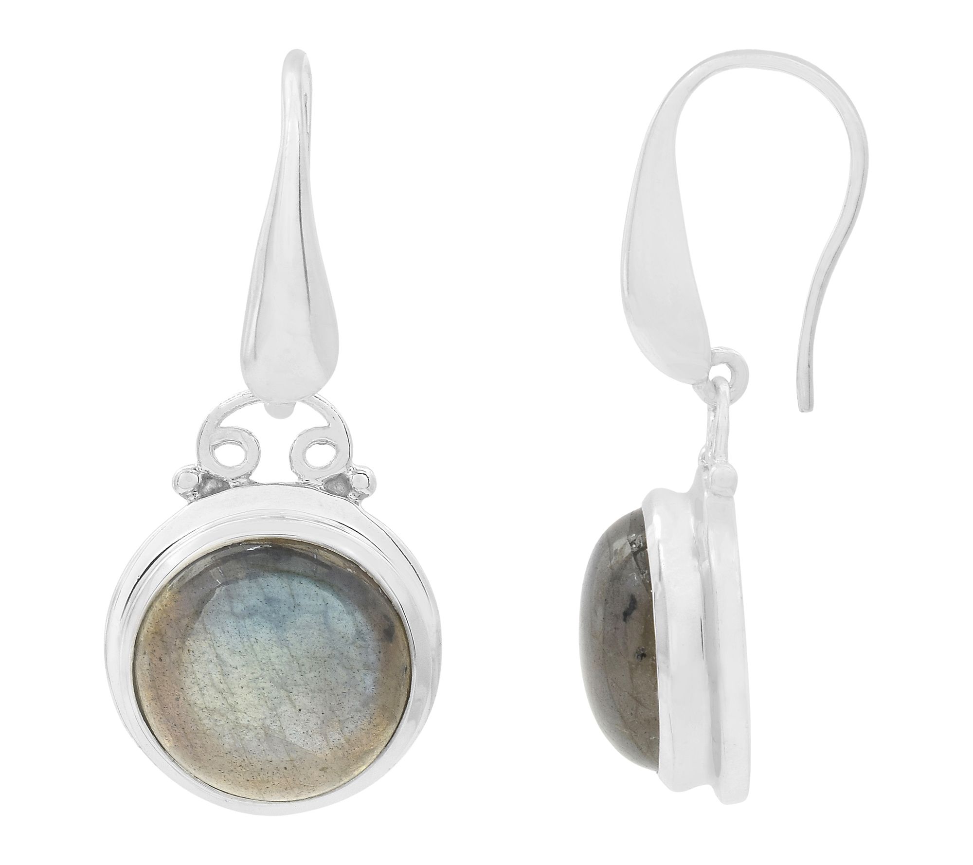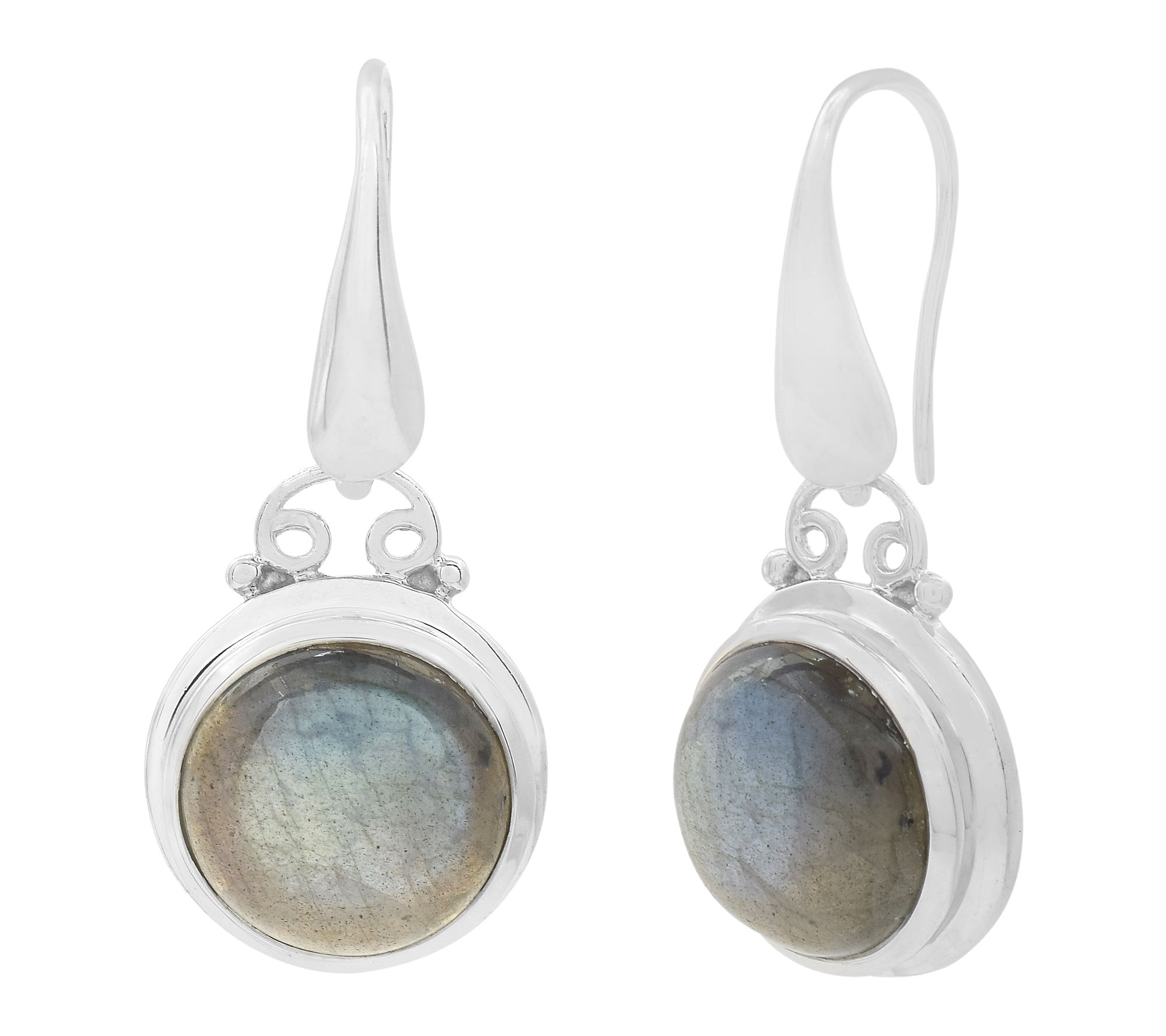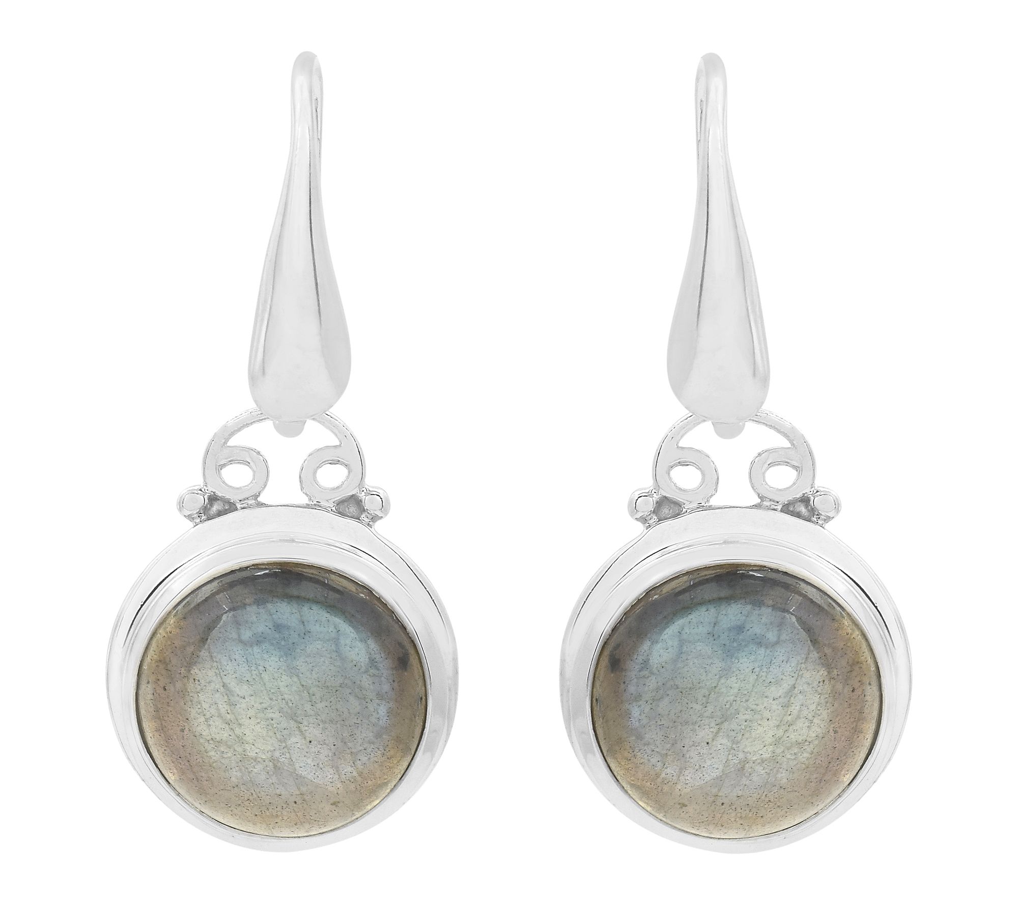 A hint of shimmer and a play of color add lively charm to every look with these dangle earrings. Labradorite in a round cabochon setting offers shifting silvery-gray hues with each movement, while sterling silver and platinum plating provide a luminous finish. Ideal for evenings out or brightening your everyday style. From Affinity® Gems.