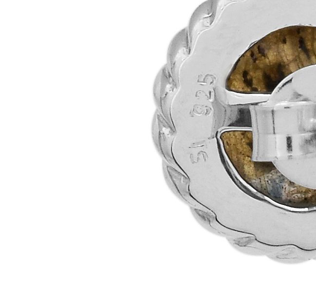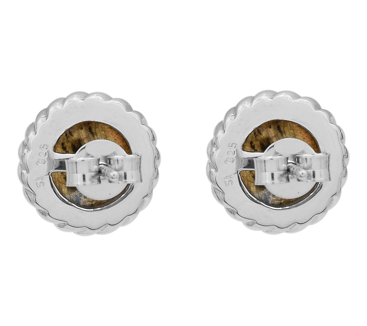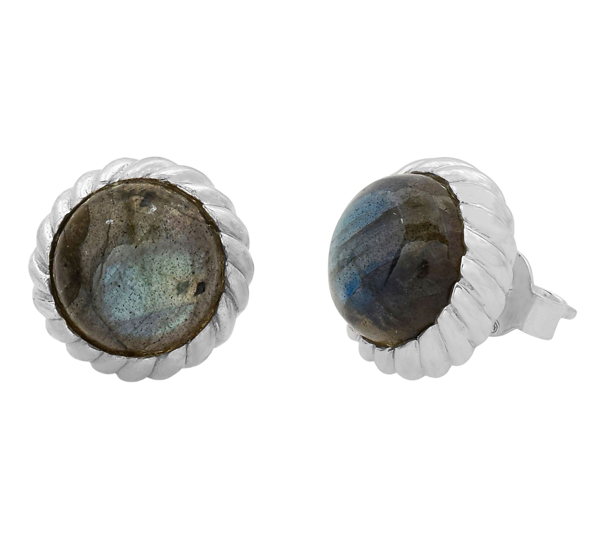 Stud design; round cabochon labradorite gemstone in a bezel setting