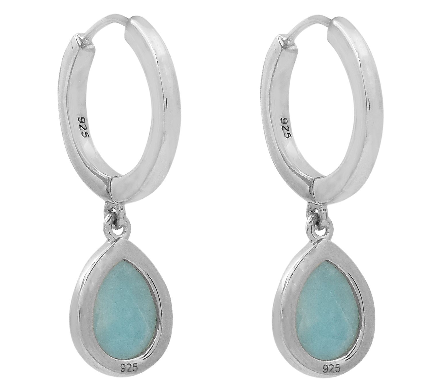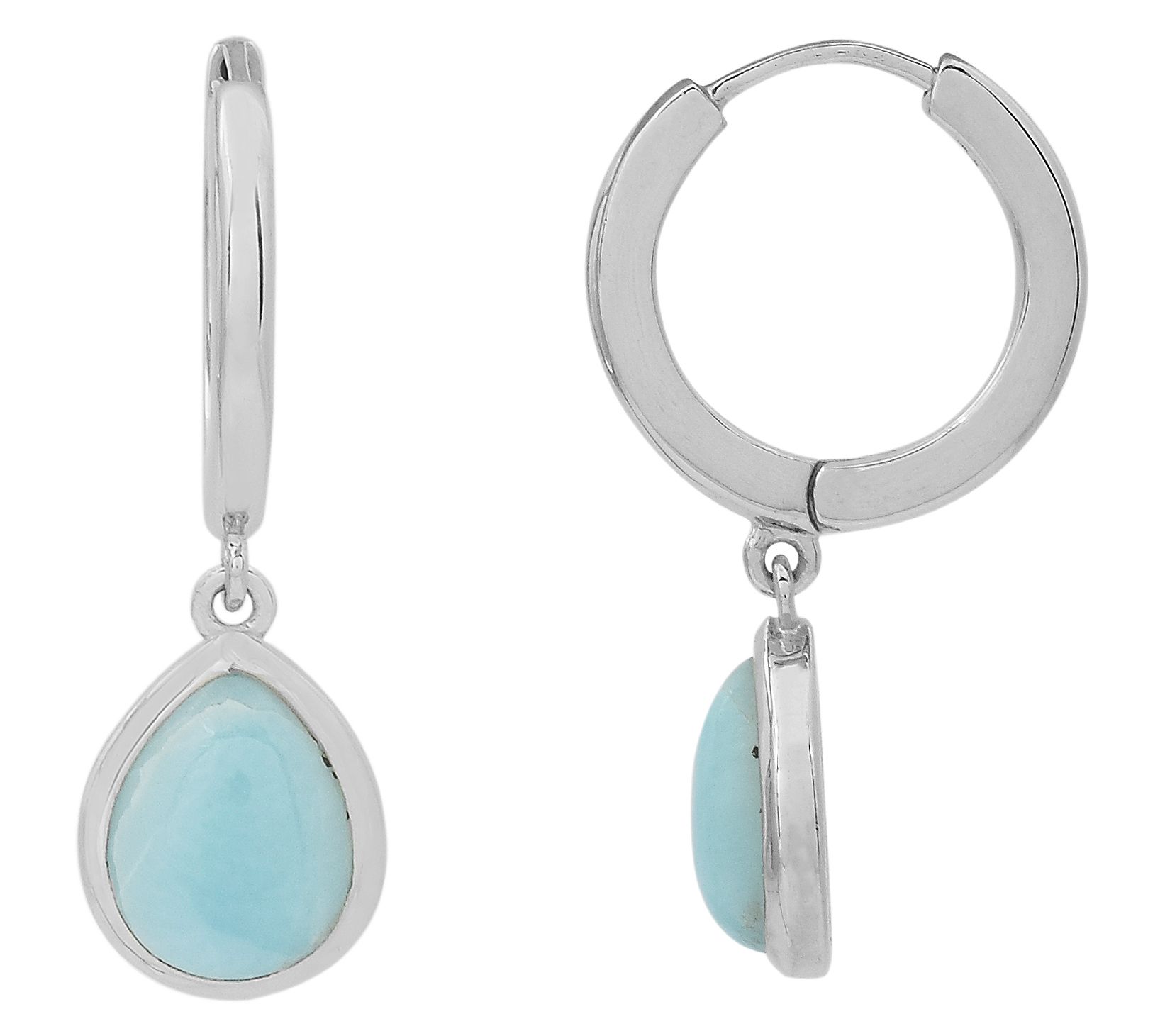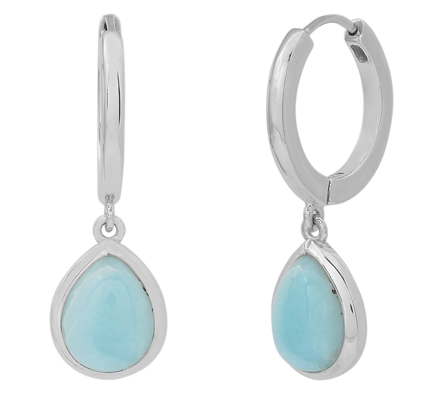 A getaway to tranquil blue waters feels a little closer each time you slip on these stunning sterling silver hoops, where luminous pear-shaped larimar cabochons are set in sleek platinum plating. Casual coffee date or an evening out, their breezy hues complement any look while the polished design brings just enough shine. From Affinity® Gems.