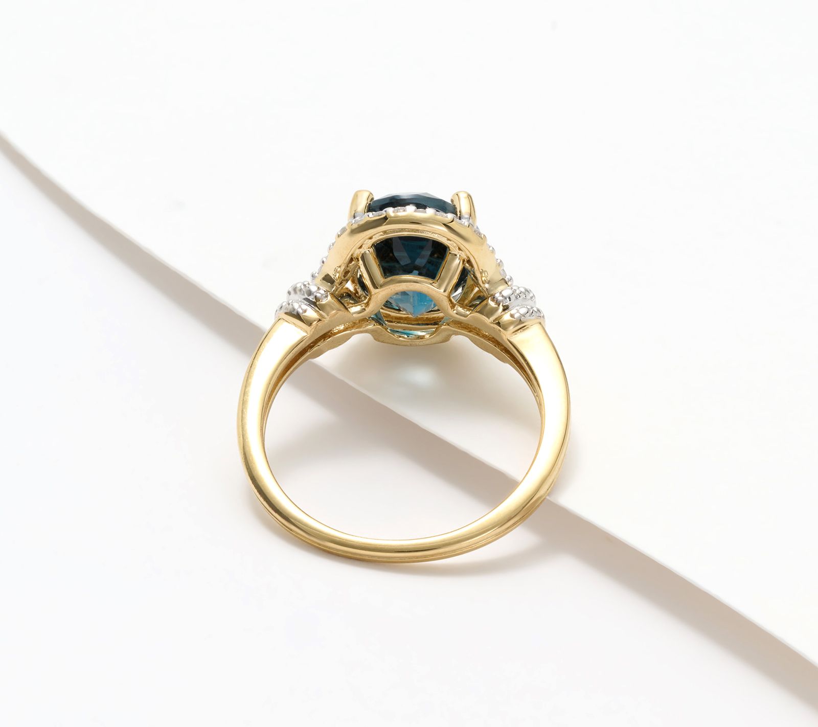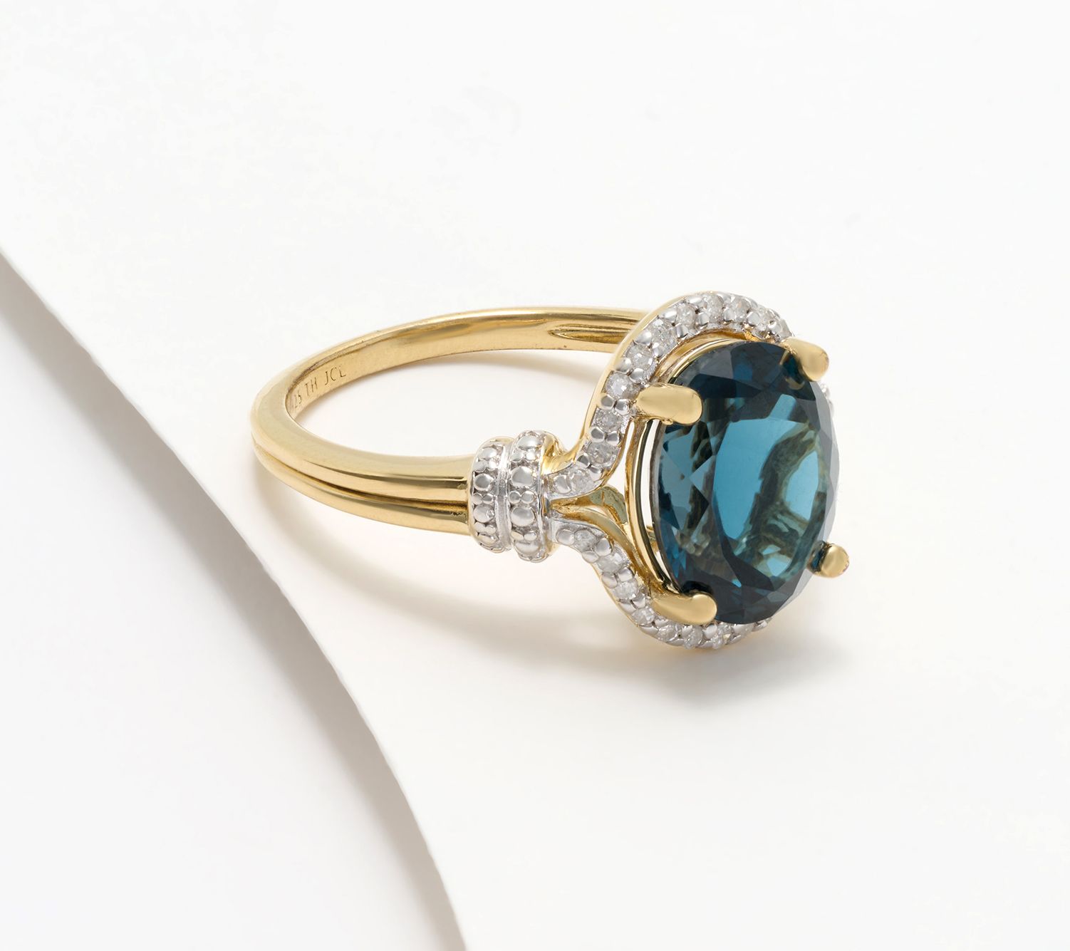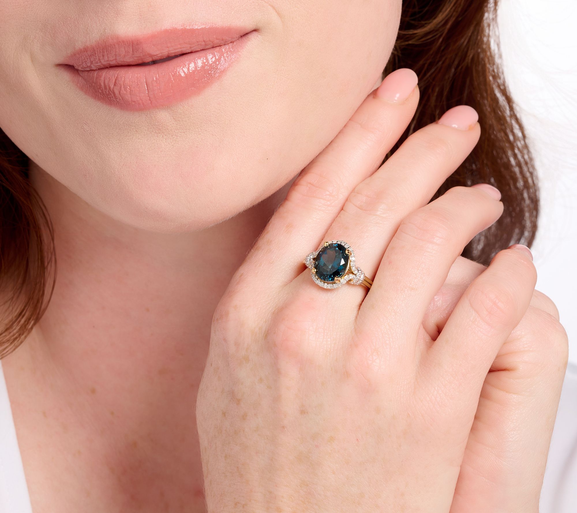 It's not every day you discover a ring as sensational as this Affinity stunner. Taking center stage is an oval, London blue topaz gemstone that's prong-set so you can fully appreciate its breathtaking beauty from every angle. Add in a sprinkling of round, white diamonds and you have a sparkling piece that's dripping with drama and ready for any opportunity to shine. From Affinity® Gems.