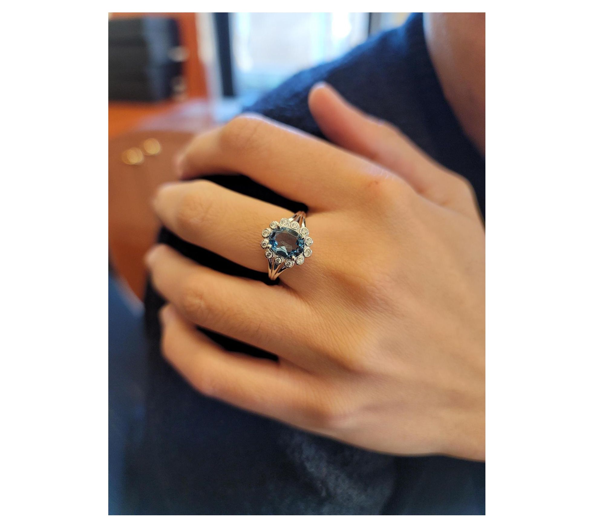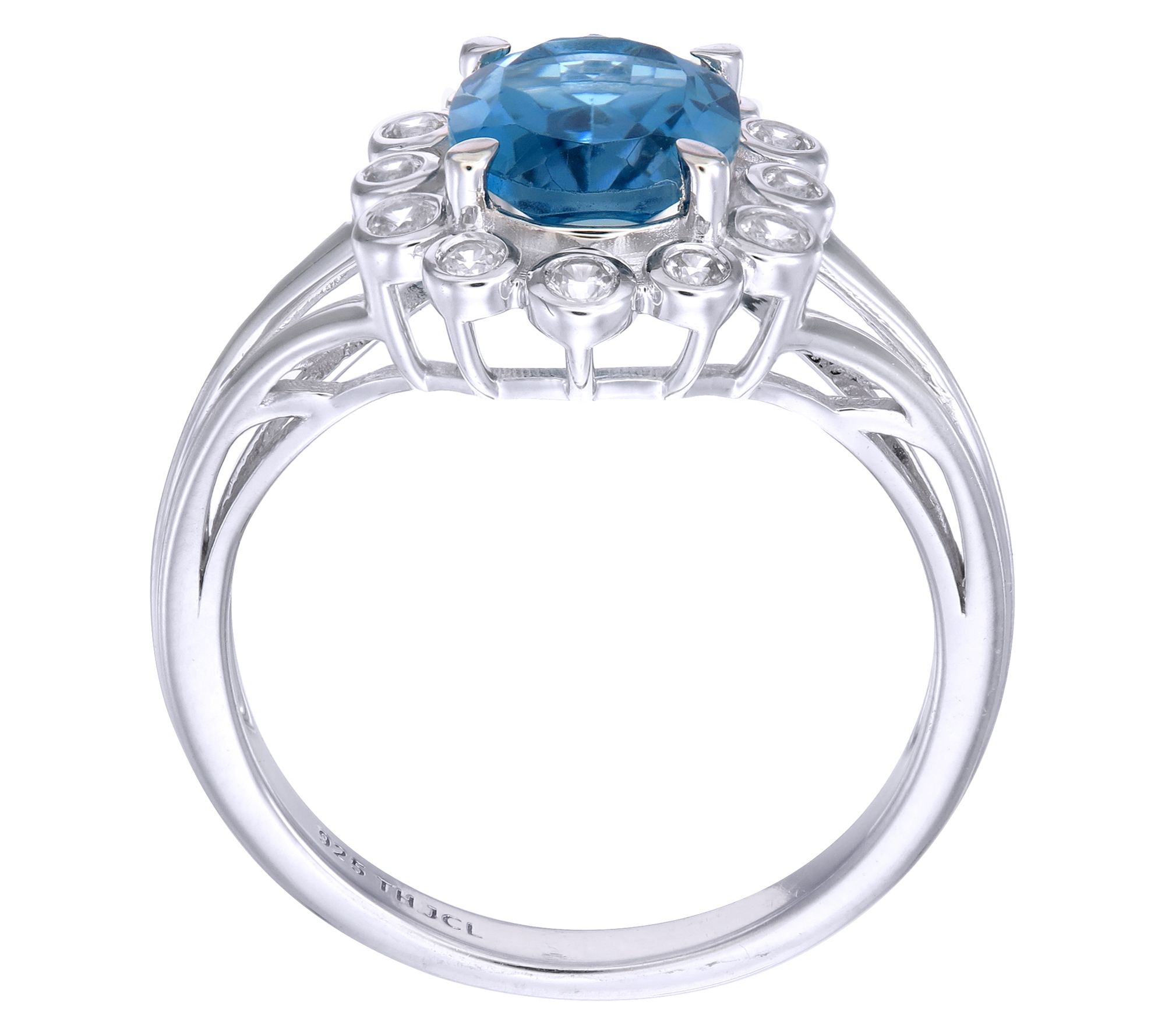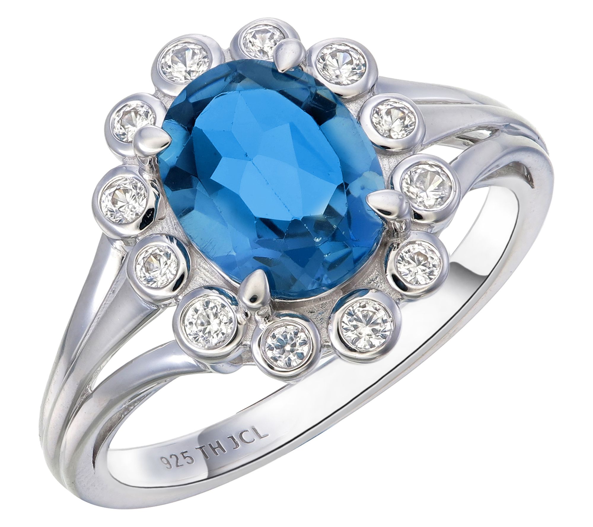 • Oval-cut, prong-set London blue topaz; halo of round-cut, bezel-set white zircon gemstones